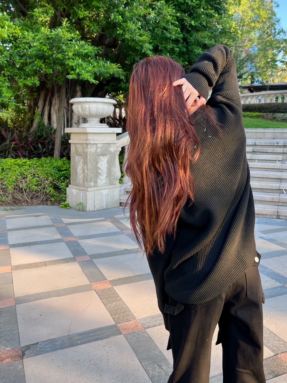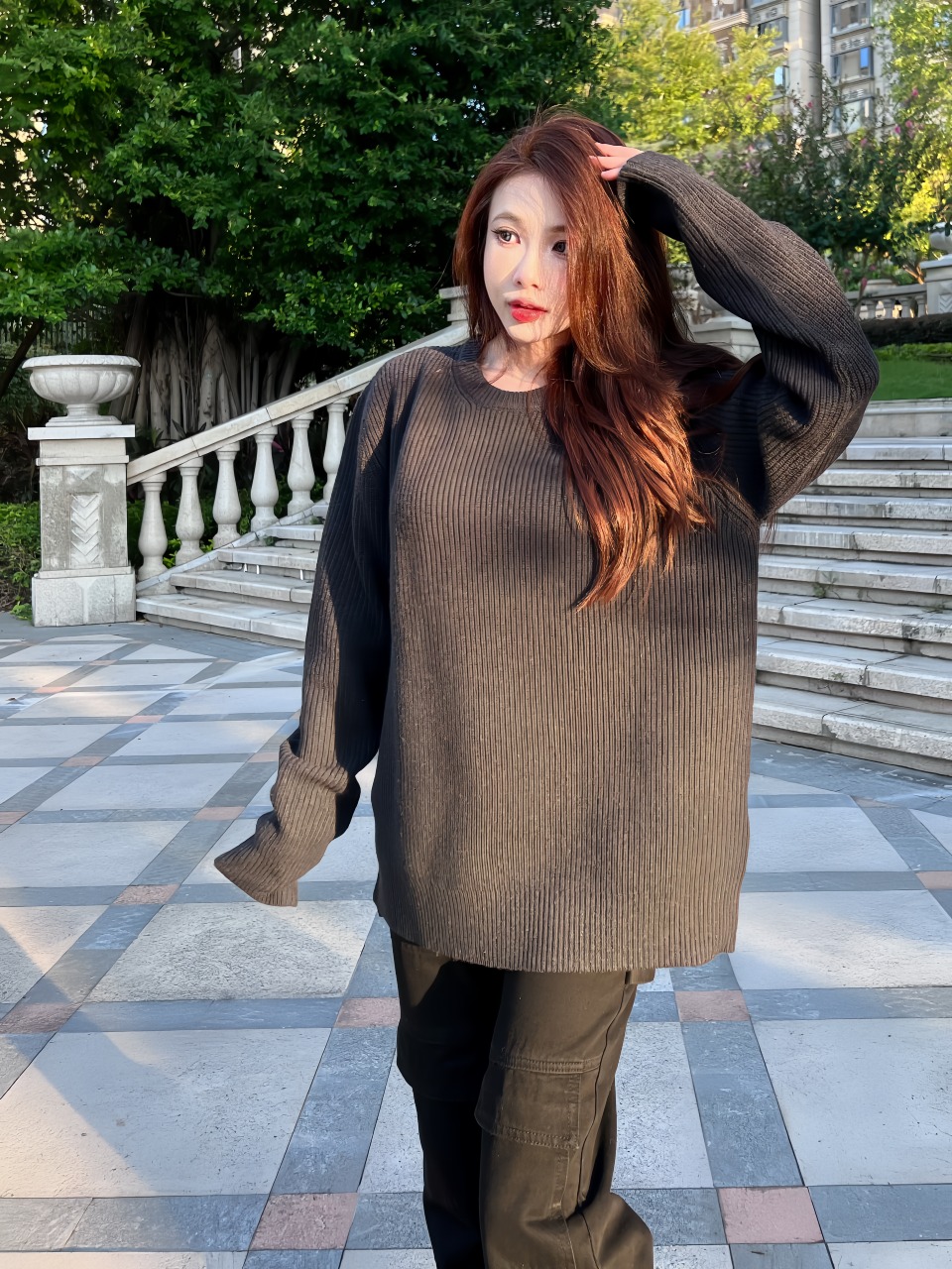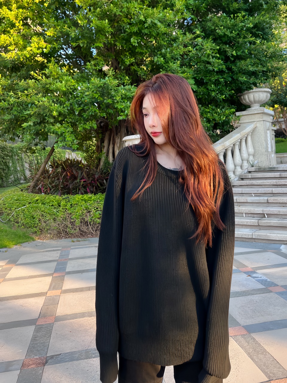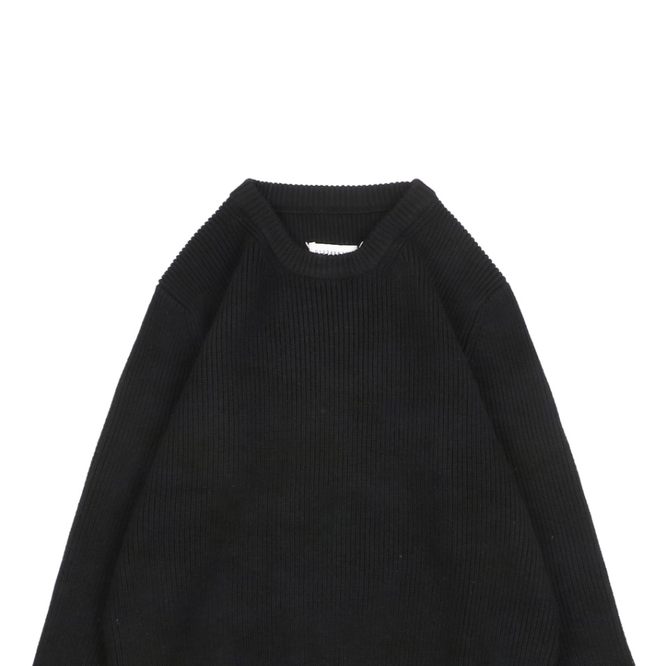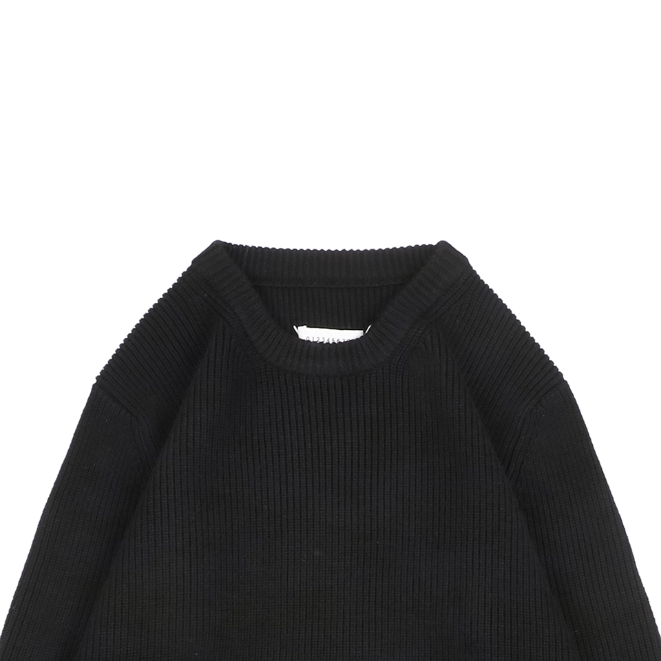 The piece features 1×1 double-layered ribbing along the collar, cuffs, and hem for enhanced structure and elasticity, preventing deformation over time. The single-piece fish-scale knitting construction, combined with a washed softening process, creates a relaxed drape and elevated cozy feel.