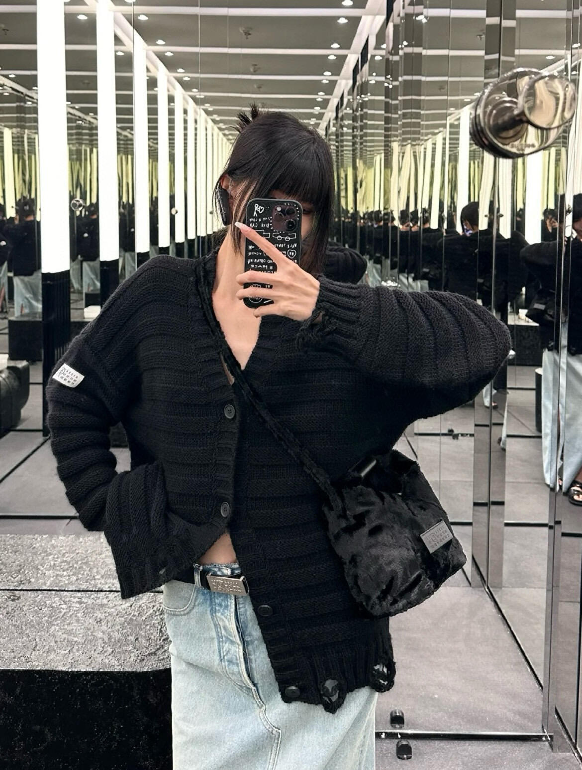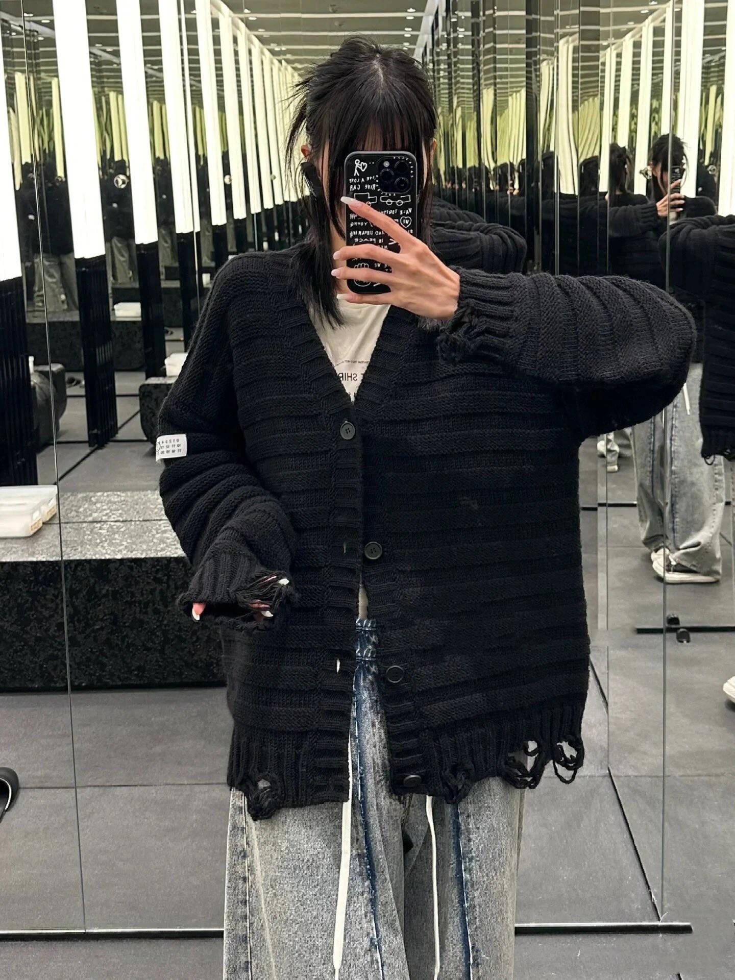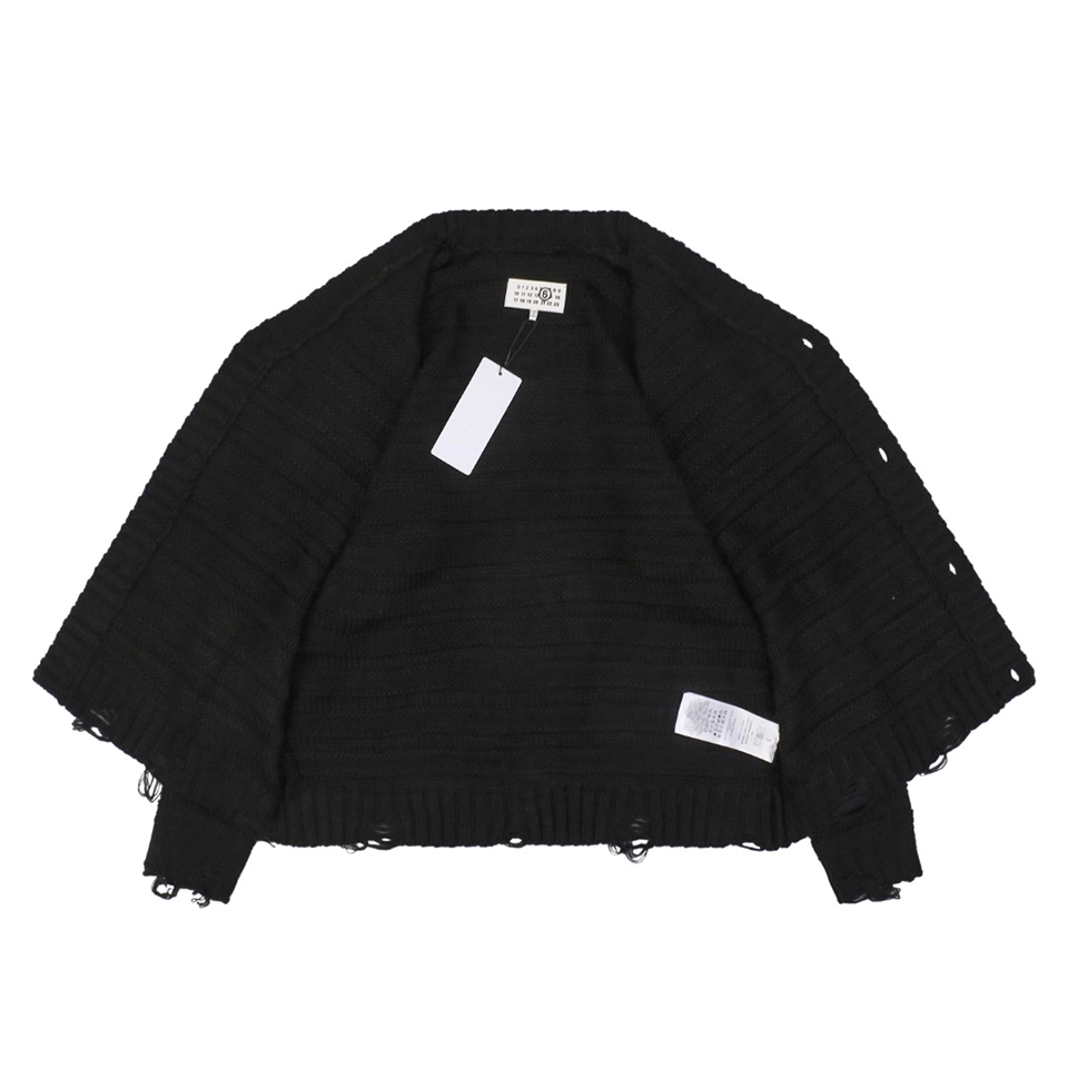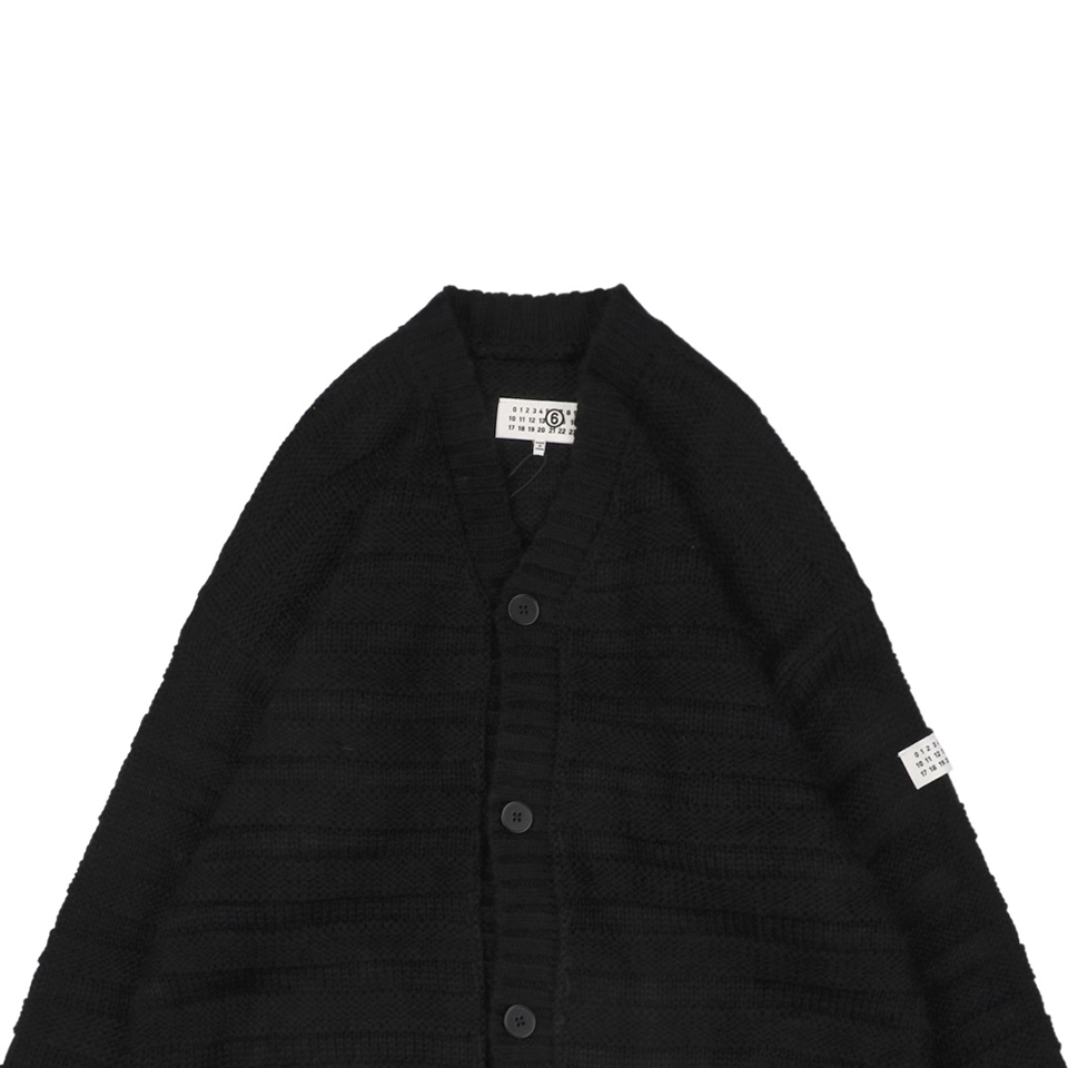 The unique slub-layer knit technique creates subtle horizontal textures with a handcrafted feel. The hem and cuffs feature fully hand-executed distressed detailing, where artisans manually pull threads and reinforce the edges to prevent unraveling—showcasing Margiela’s signature deconstruction aesthetic. With a relaxed, gender-neutral fit, hand-sewn buttons, and complete MM6 labels, this cardigan blends craftsmanship, comfort, and design sophistication.