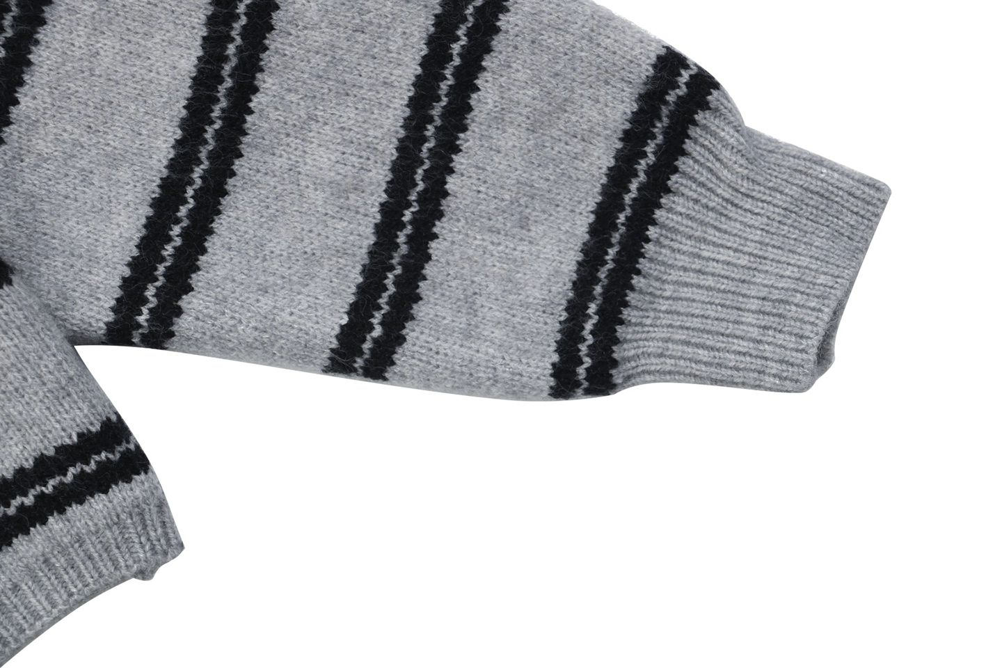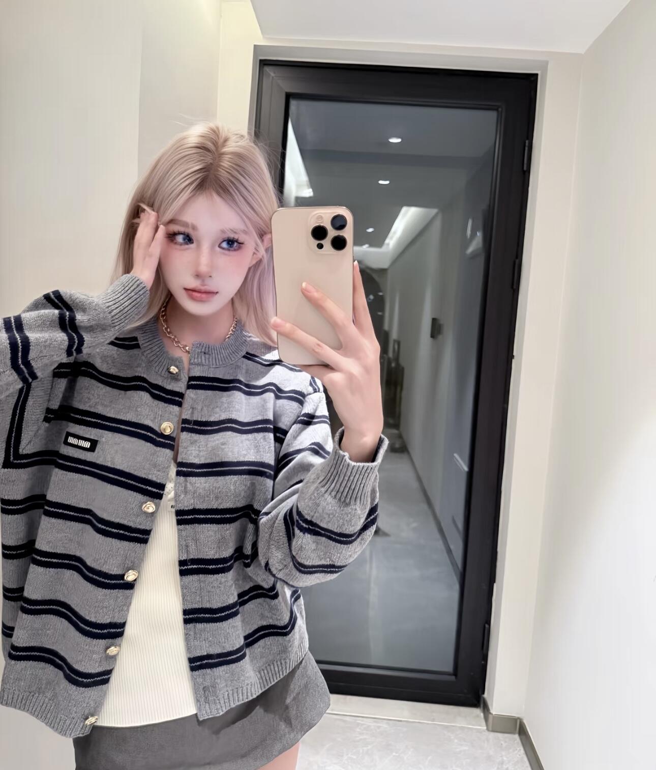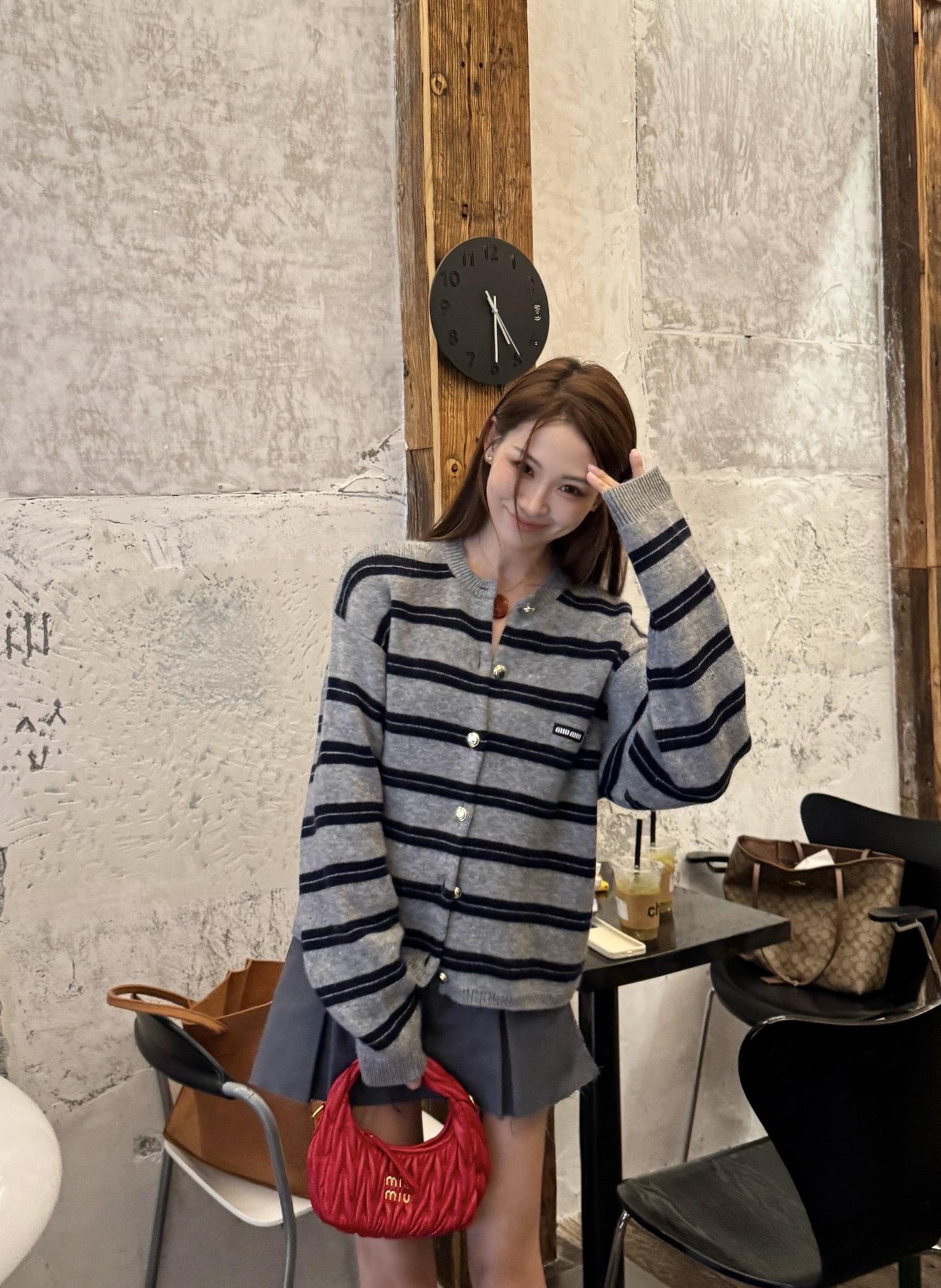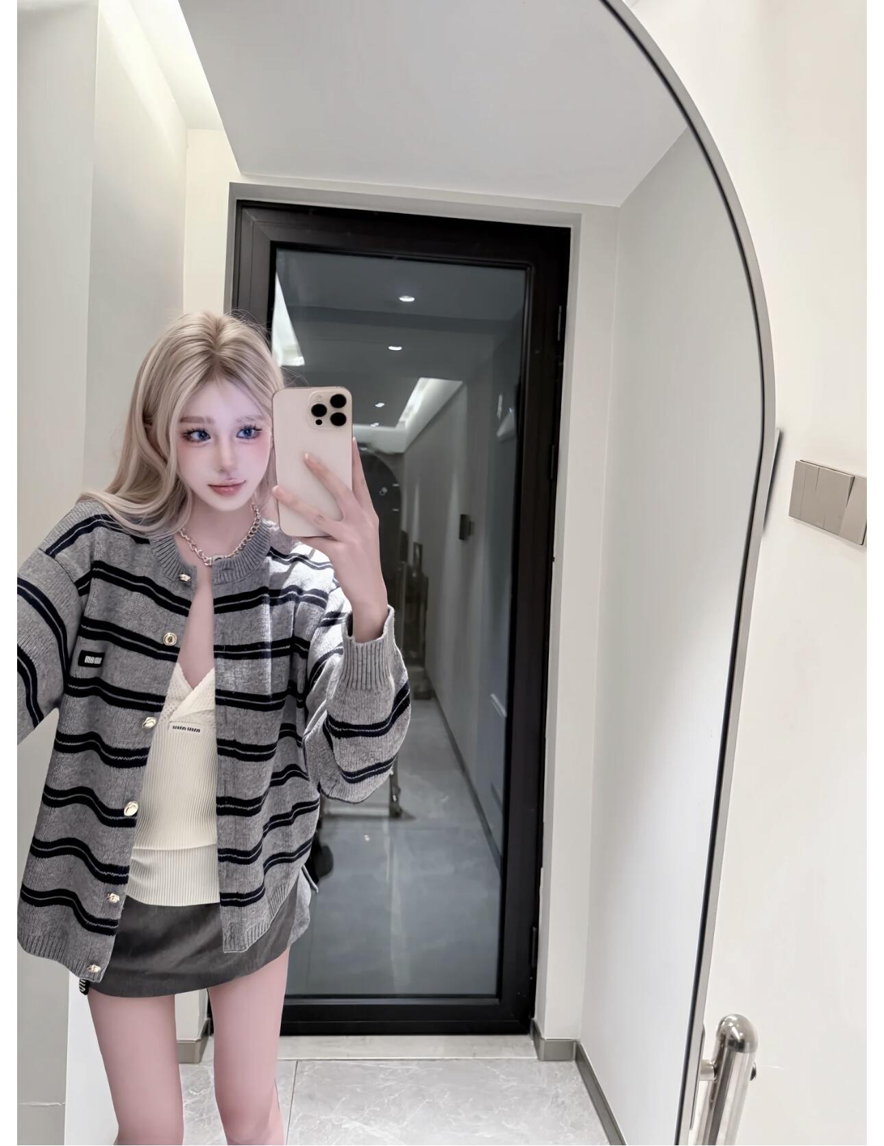 This MM Grey and White Striped Knit Cardigan features a timeless grey-and-black stripe pattern paired with a relaxed, oversized silhouette for effortless styling. Crafted from a mid-weight knit fabric, the cardigan offers structure without feeling bulky, making it suitable for both layering and standalone wear.