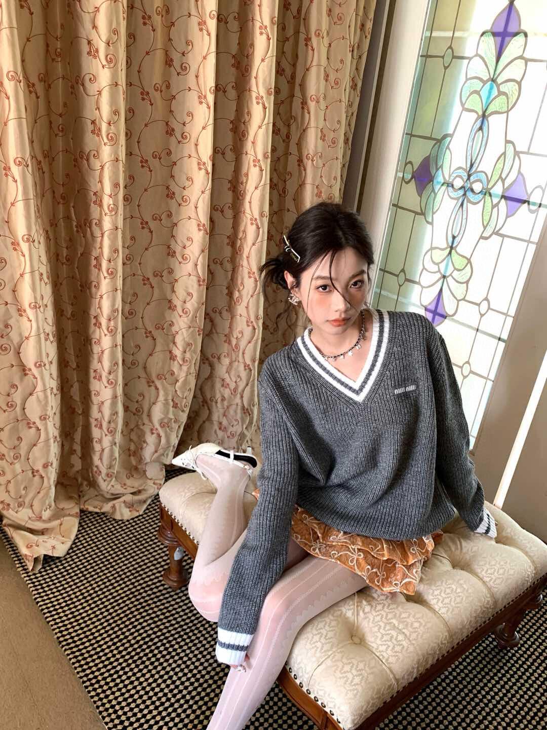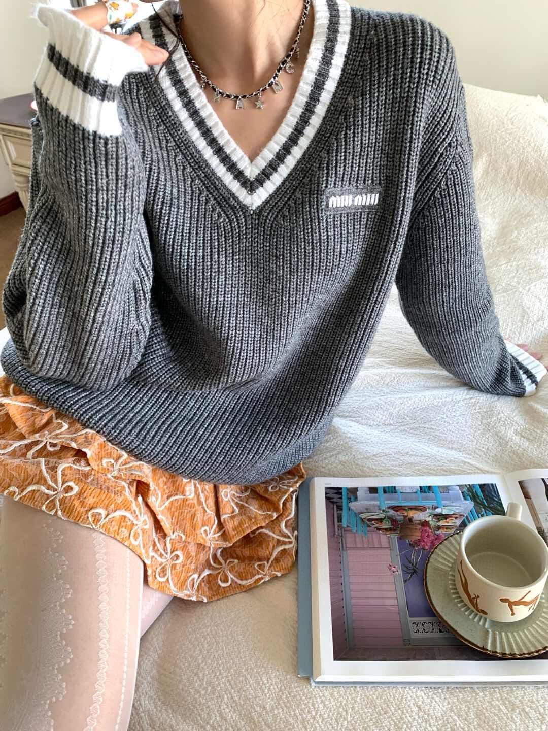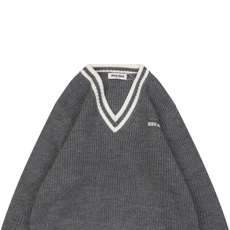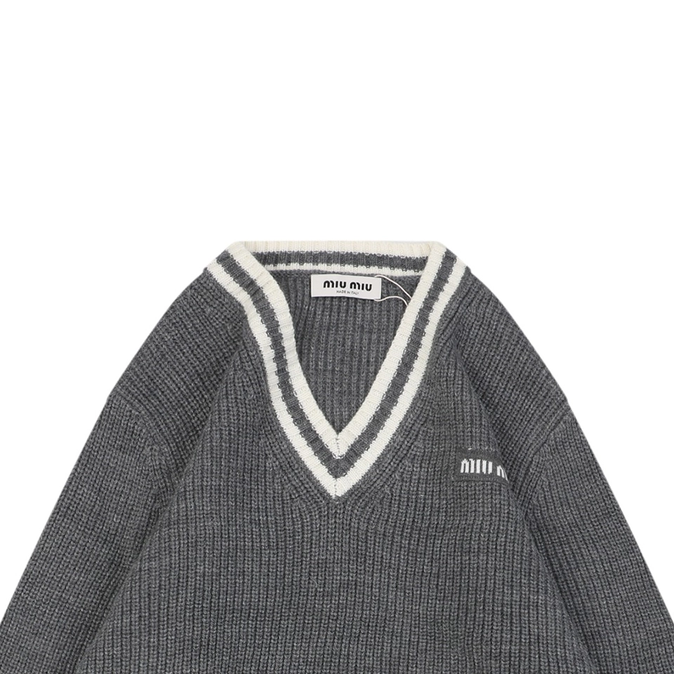 The MM Grey/White Logo V-Neck Sweater delivers a refined balance of collegiate-inspired styling and modern minimalism. Crafted from a soft knit, it features a deep V-neckline trimmed with white contrast stripes, ribbed cuffs and hem, and a discreet MM logo embroidery on the chest. The relaxed fit makes it versatile for layering over shirts or pairing with tailored bottoms, embodying effortless elegance with a sporty twist.