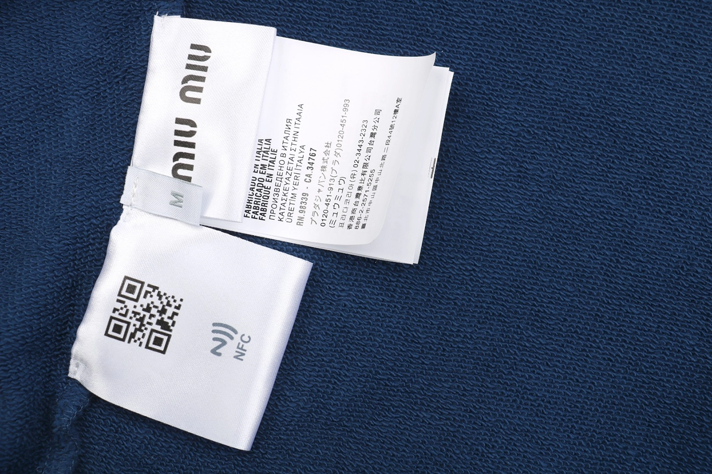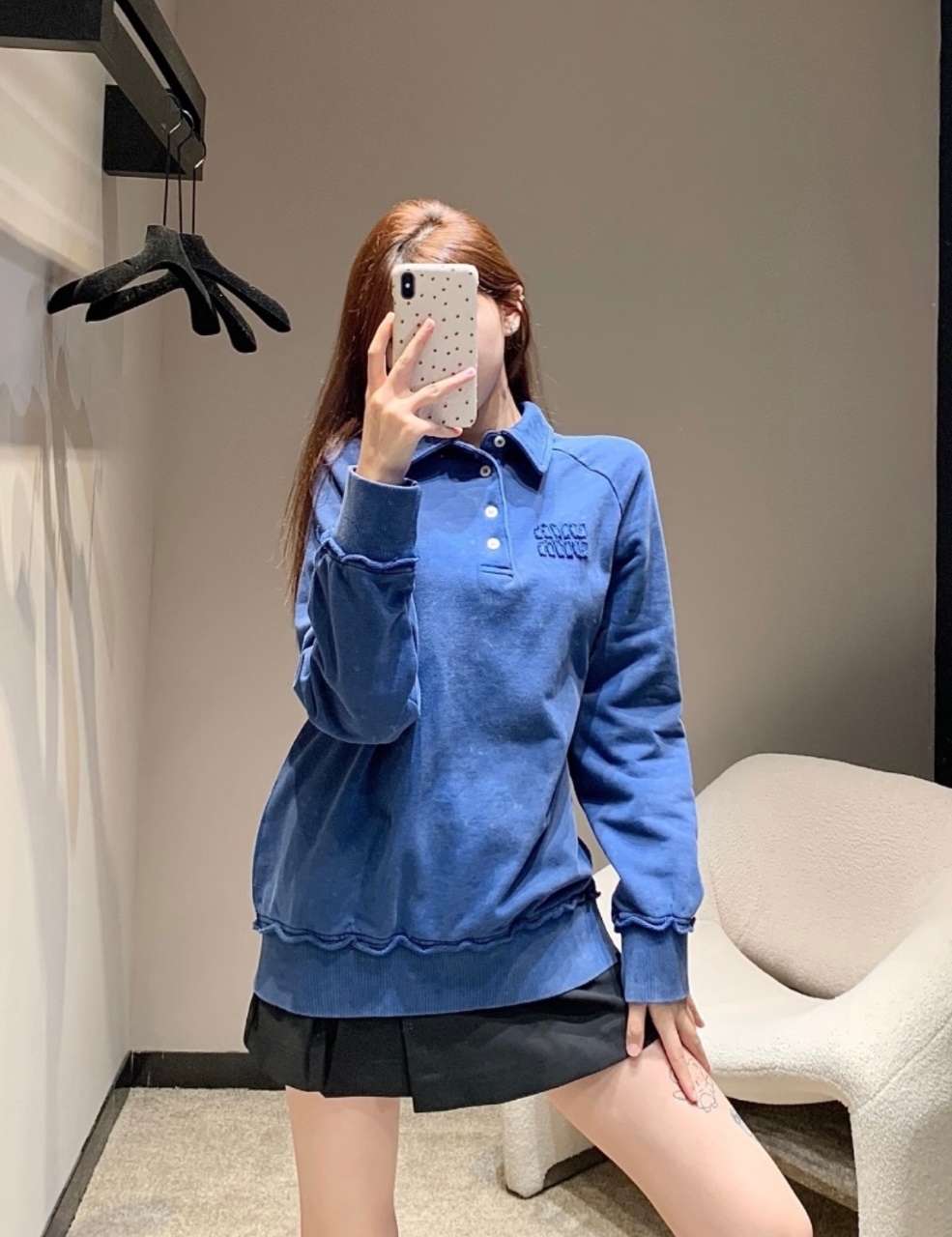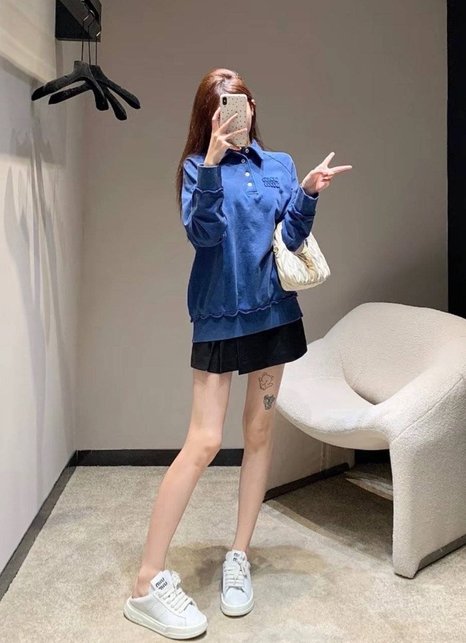 This Klein blue polo sweatshirt features a clean, minimalist silhouette with a refined half-button polo neckline, enhanced by custom mother-of-pearl buttons for a subtle luxury finish. The embroidered MIU MIU logo is produced using a specialized edge-free embroidery technique, achieving a precise, authentic appearance without visible borders. Finished with complete wash labels and NFC chip, this piece balances fashion credibility with premium craftsmanship—ideal for elevated casual and modern streetwear styling.