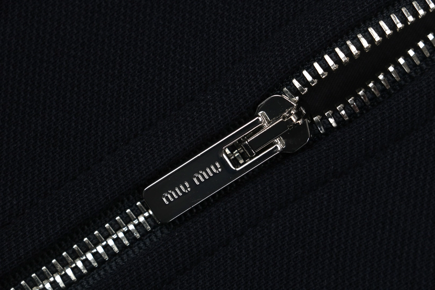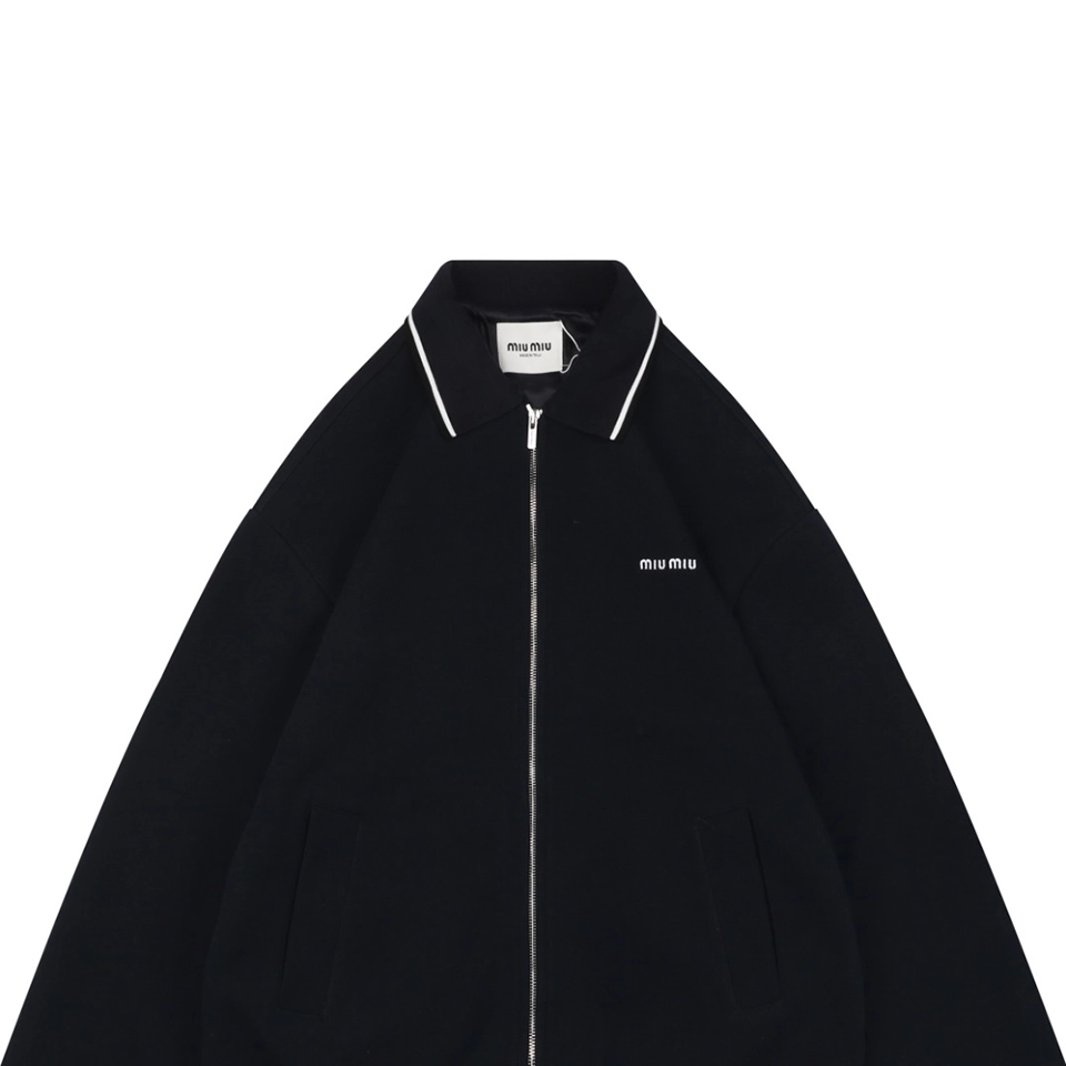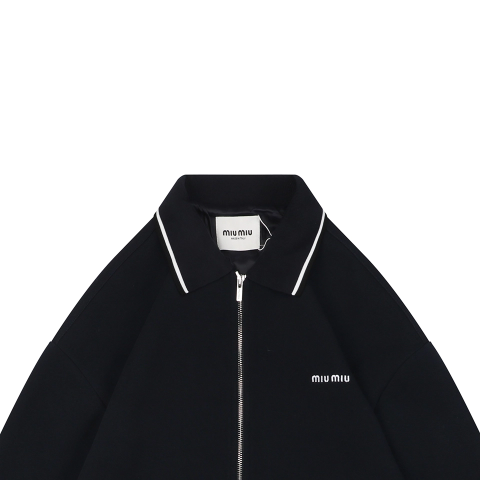 Designed with a classic zip-up collar silhouette, the jacket features white contrast piping along the collar and shoulders, adding a subtle retro-sport accent. A discreet embroidered MM logo on the chest delivers understated brand recognition while preserving the minimalist aesthetic.