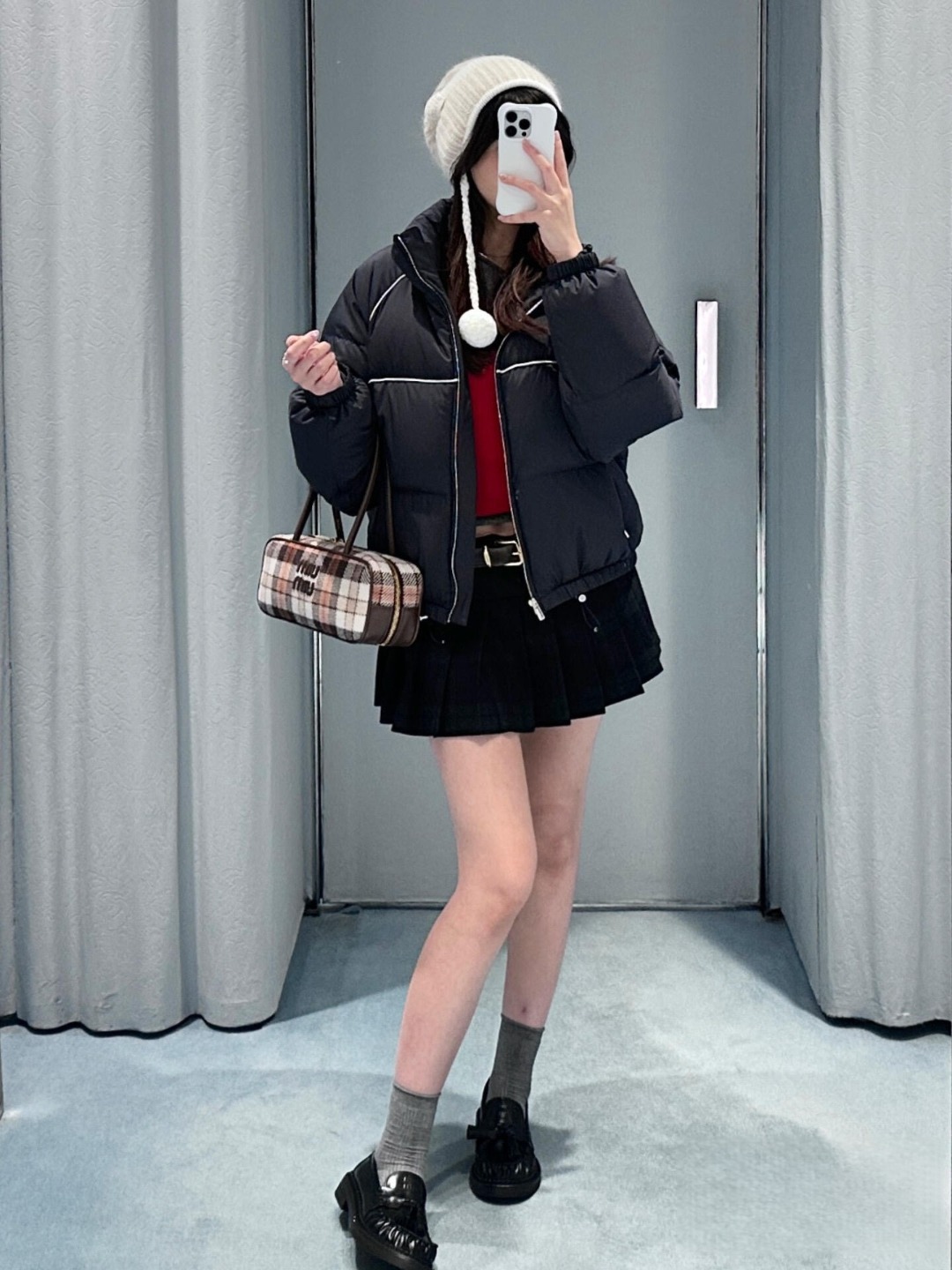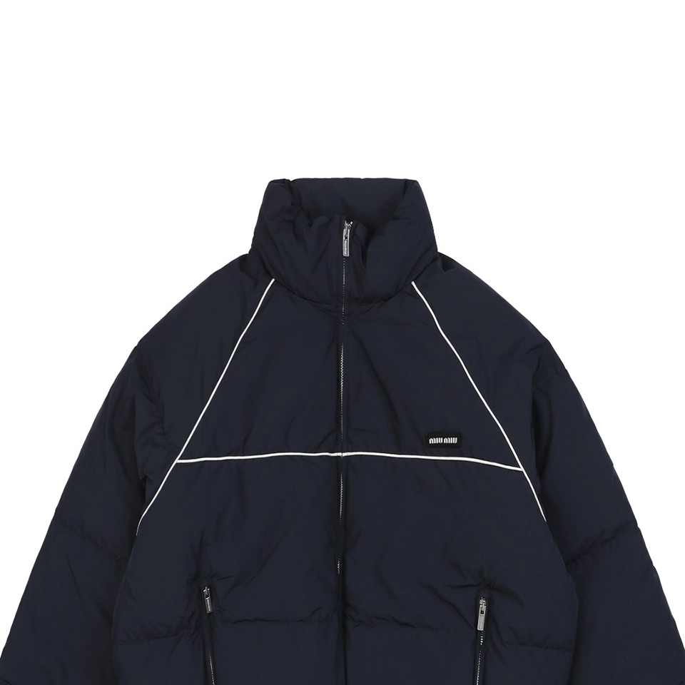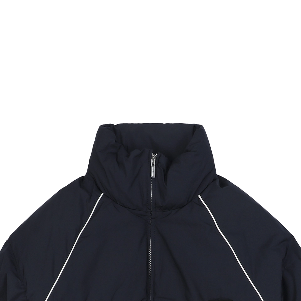 The MM Panel Puffer Jacket Navy combines minimalist design with cold-weather functionality. Highlighted by white piping that outlines a geometric panel structure, this short down jacket maintains a sleek silhouette while ensuring warmth and comfort. The small chest logo adds subtle branding, while dual zippered pockets and an elastic hem enhance practicality. Whether for urban commutes or casual layering, it delivers timeless utility and a contemporary edge.