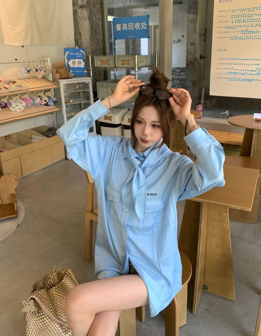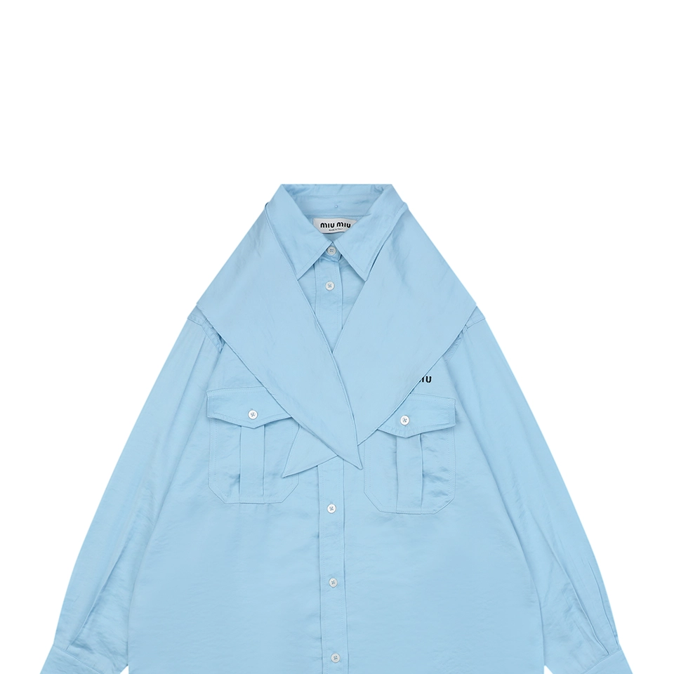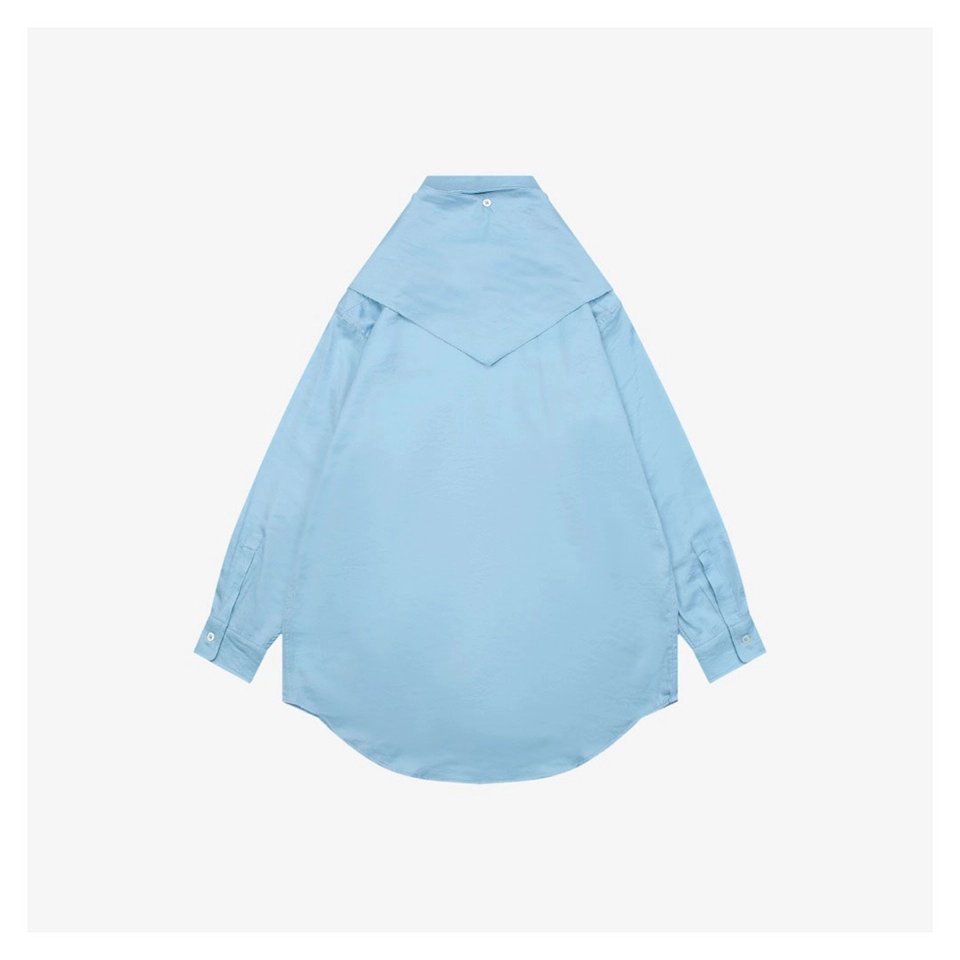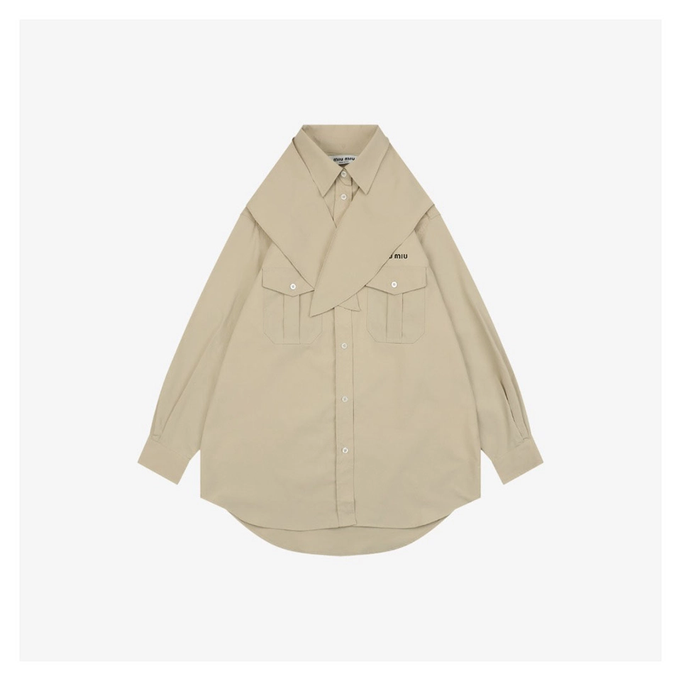 The shirt features a softly muted color palette, including light khaki and pale blue tones, enhancing its gentle and versatile aesthetic. A standout bow-inspired draped collar detail adds visual depth and styling flexibility, allowing the piece to transition seamlessly from casual to polished looks.