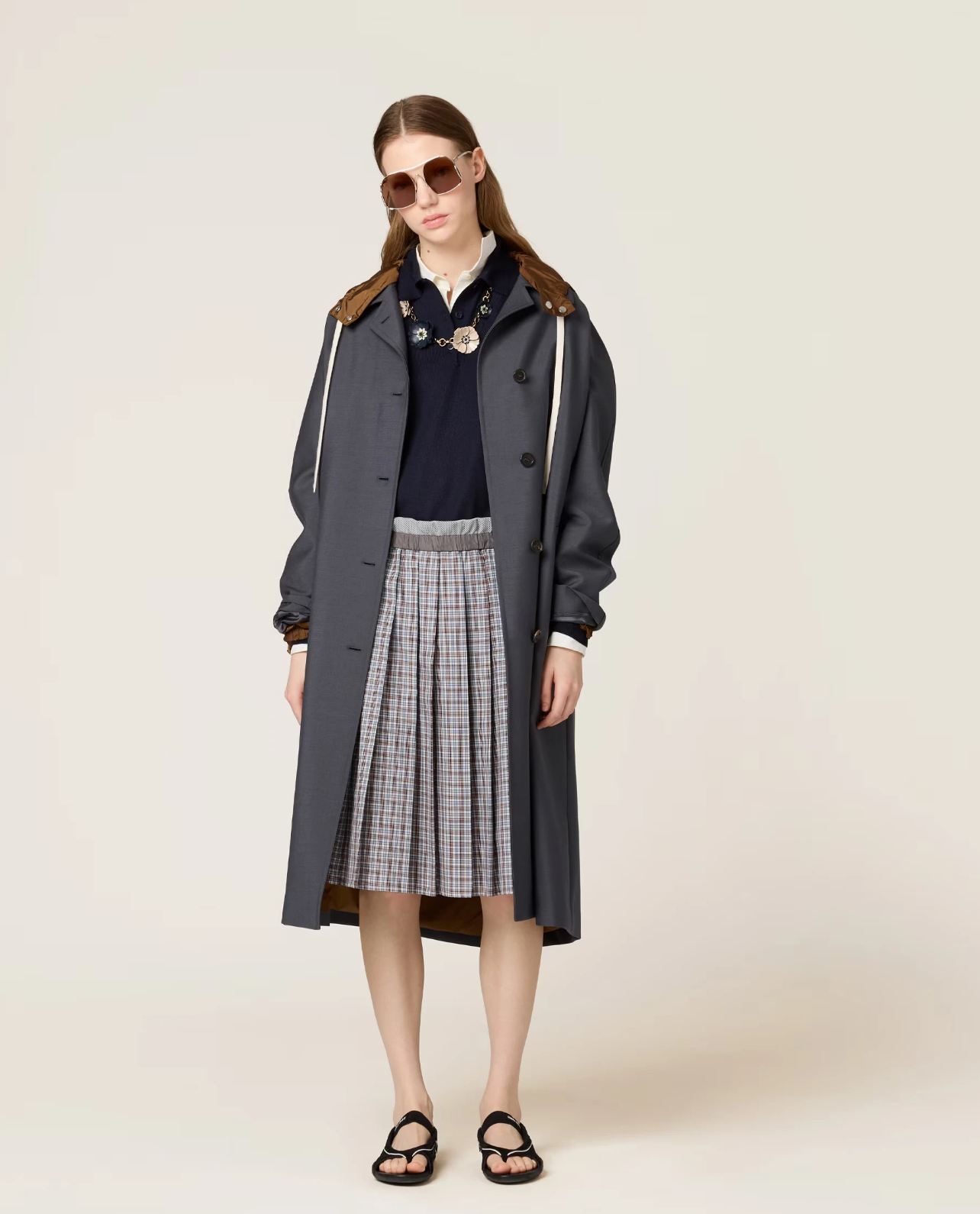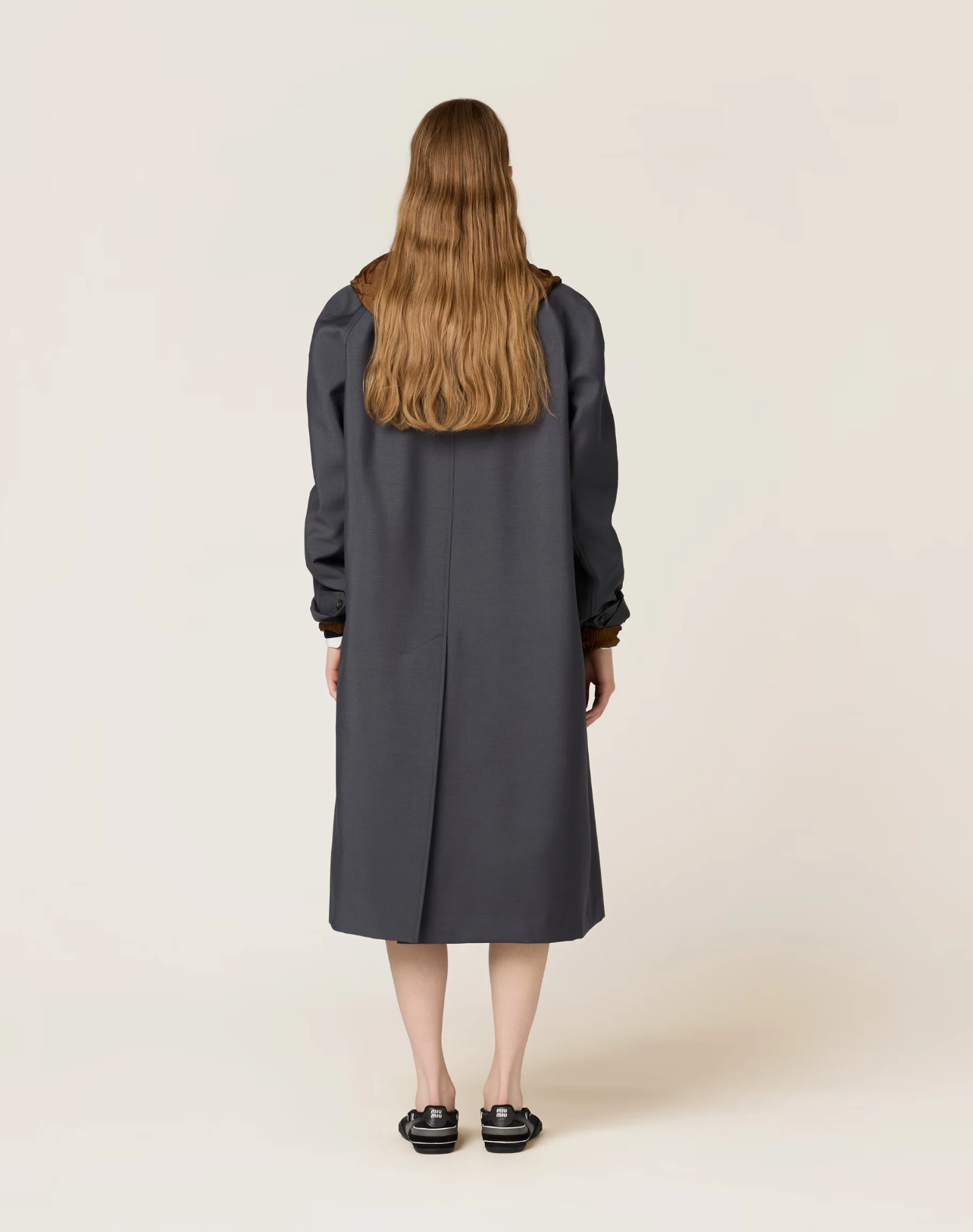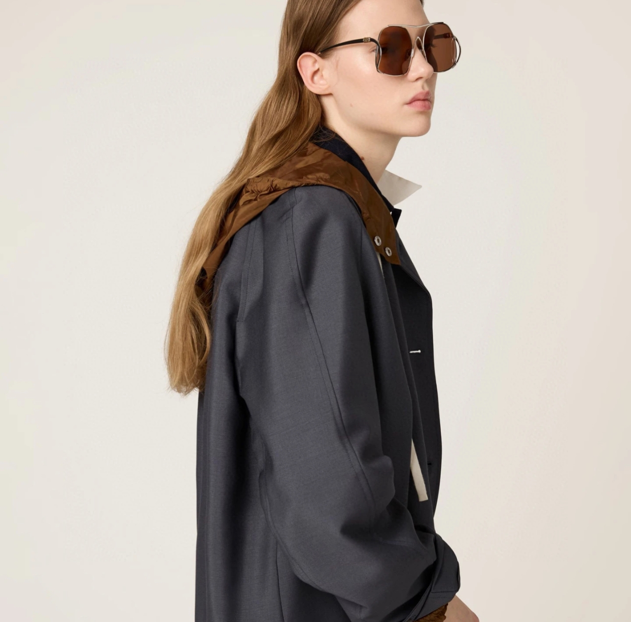The single-breasted silhouette delivers a streamlined profile, enhancing vertical proportions while maintaining comfort and ease of movement. A functional hood adds a contemporary touch, balancing classic tailoring with practical wearability.