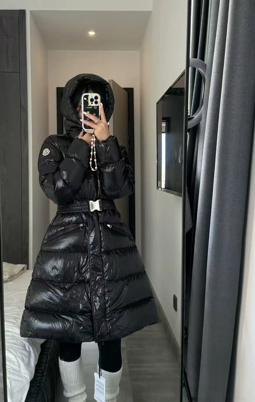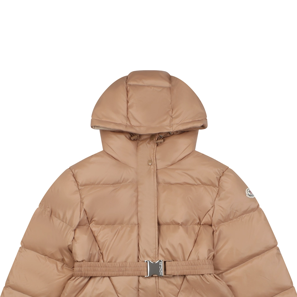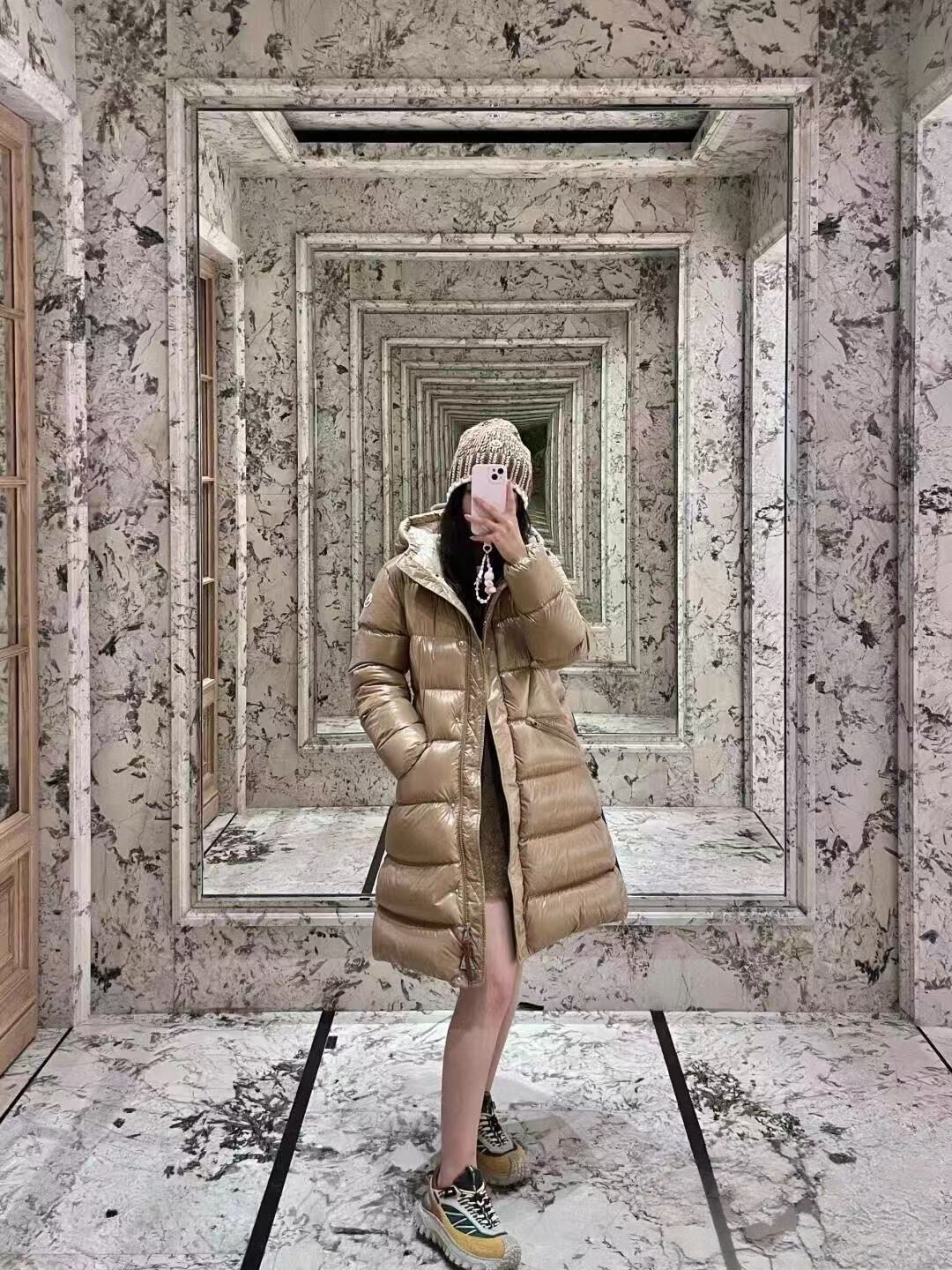 Filled with premium white duck down, this long-length silhouette provides exceptional warmth without compromising elegance. The adjustable elastic belt cinches the waist to create a flattering, feminine shape, while the attached hood offers added protection in cold and windy conditions. Finished with brand-correct hardware, custom zippers, and a streamlined structure, this down jacket is ideal for urban commuting, daily wear, and elevated cold-weather styling.
