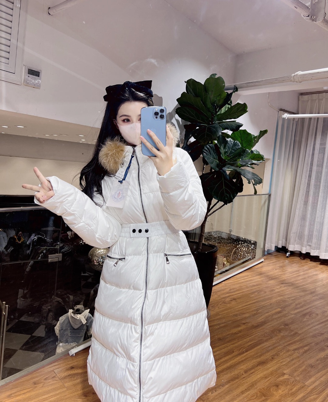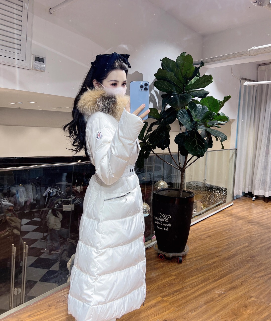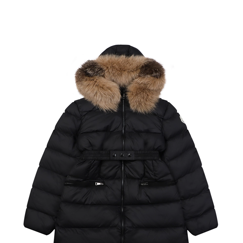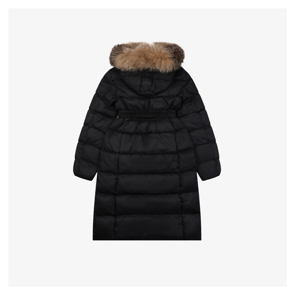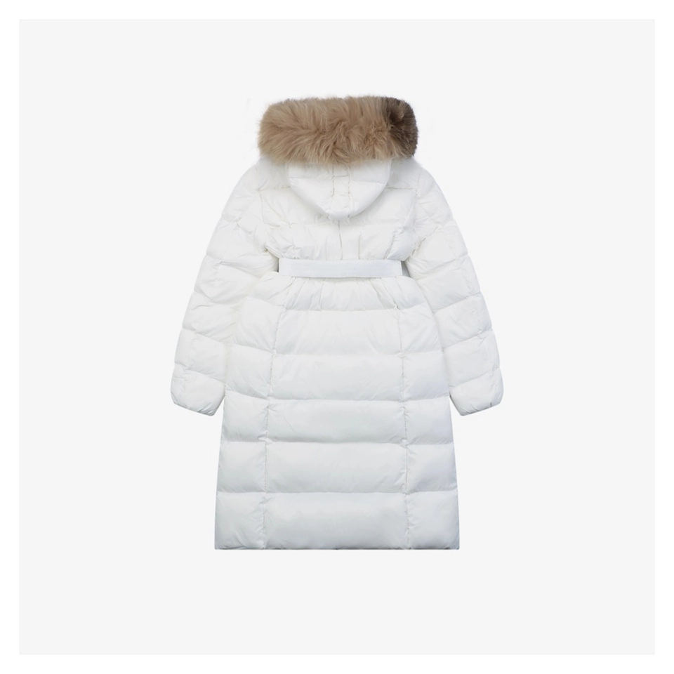 The design is elevated by a detachable fox fur-trimmed hood, offering both luxurious texture and enhanced wind protection. A slim elastic belt cinches the waist to create a flattering, sculpted silhouette, while the long quilted structure ensures optimal heat retention. Finished with a two-way zip closure, ribbon-accented zip pockets, elastic cuffs, and brand-correct trims, this down jacket delivers both visual sophistication and everyday functionality. Filled with high-quality white duck down, it is suitable for daily wear, commuting, or cold-weather styling. Unisex design with custom-developed brand tags.