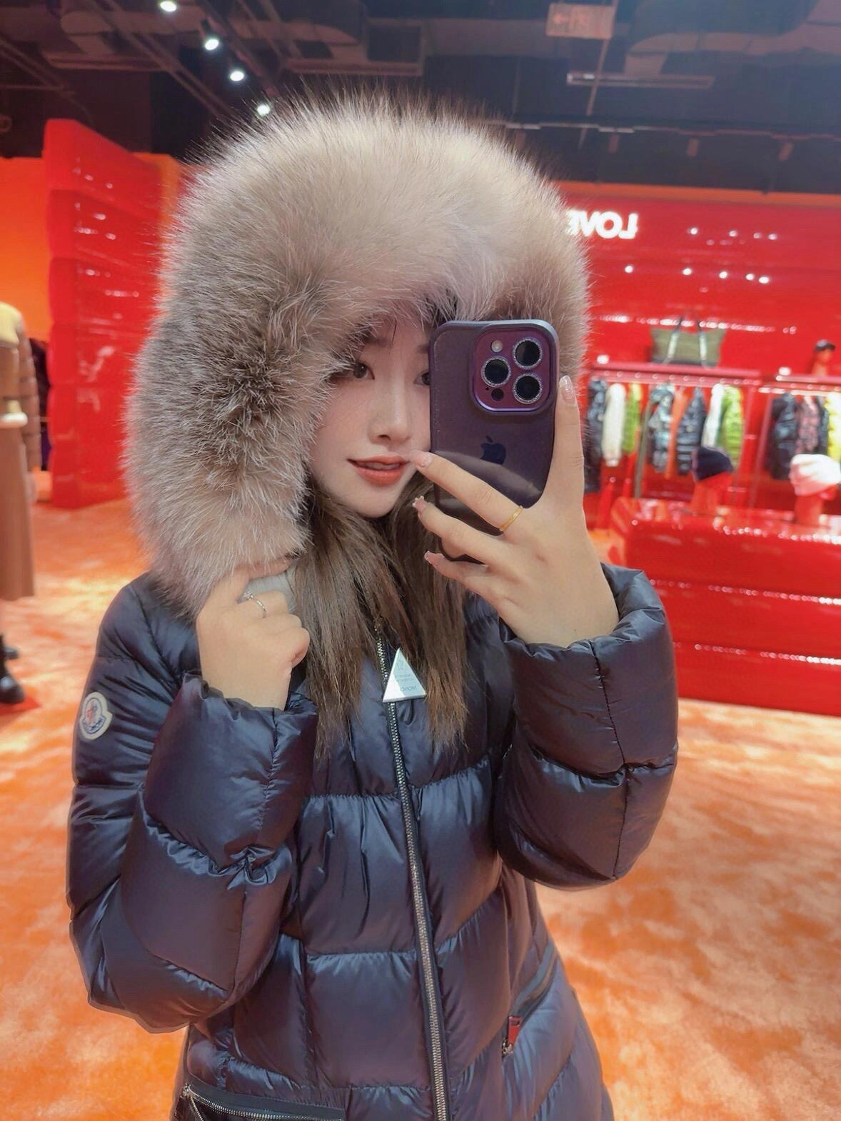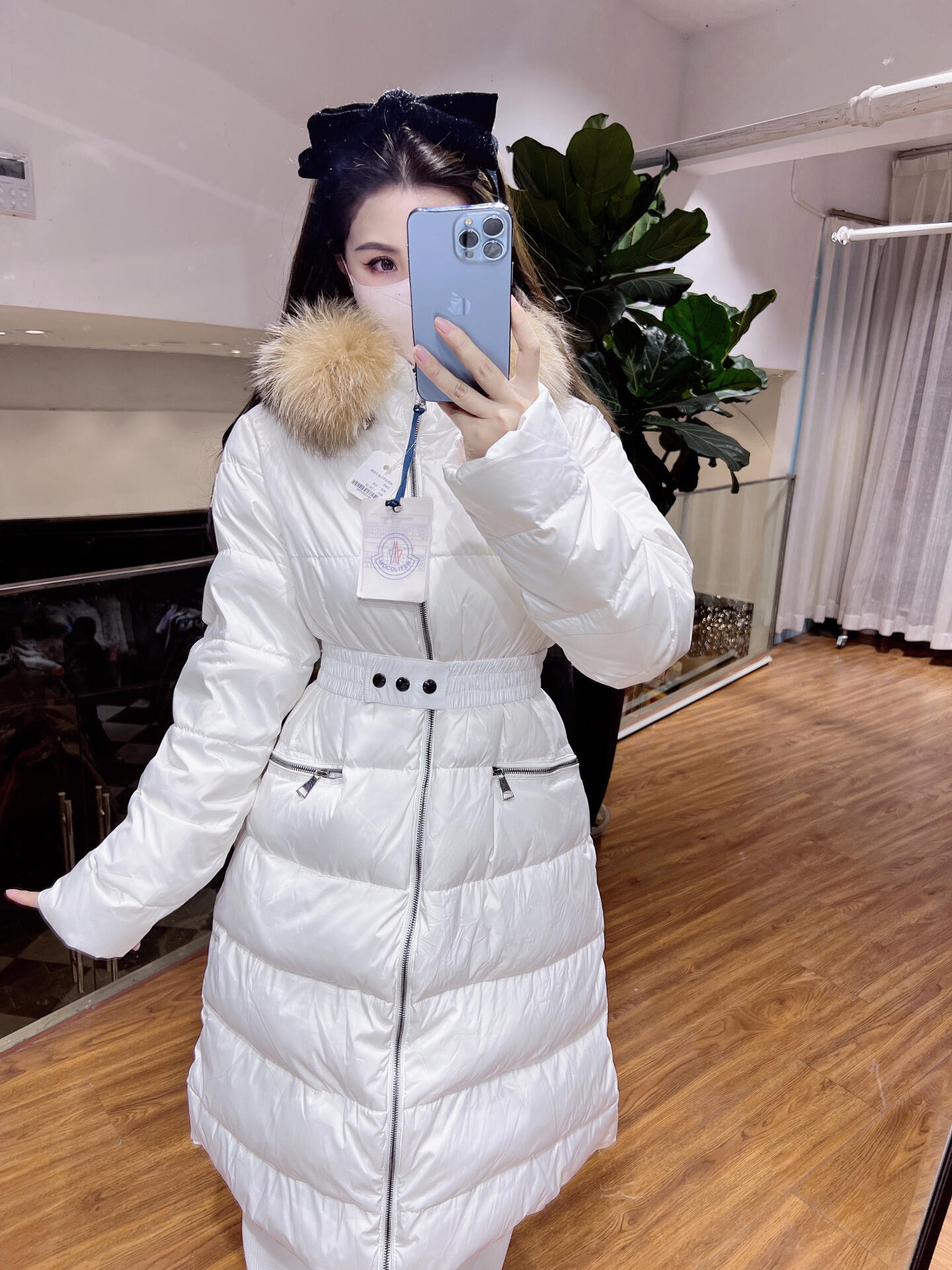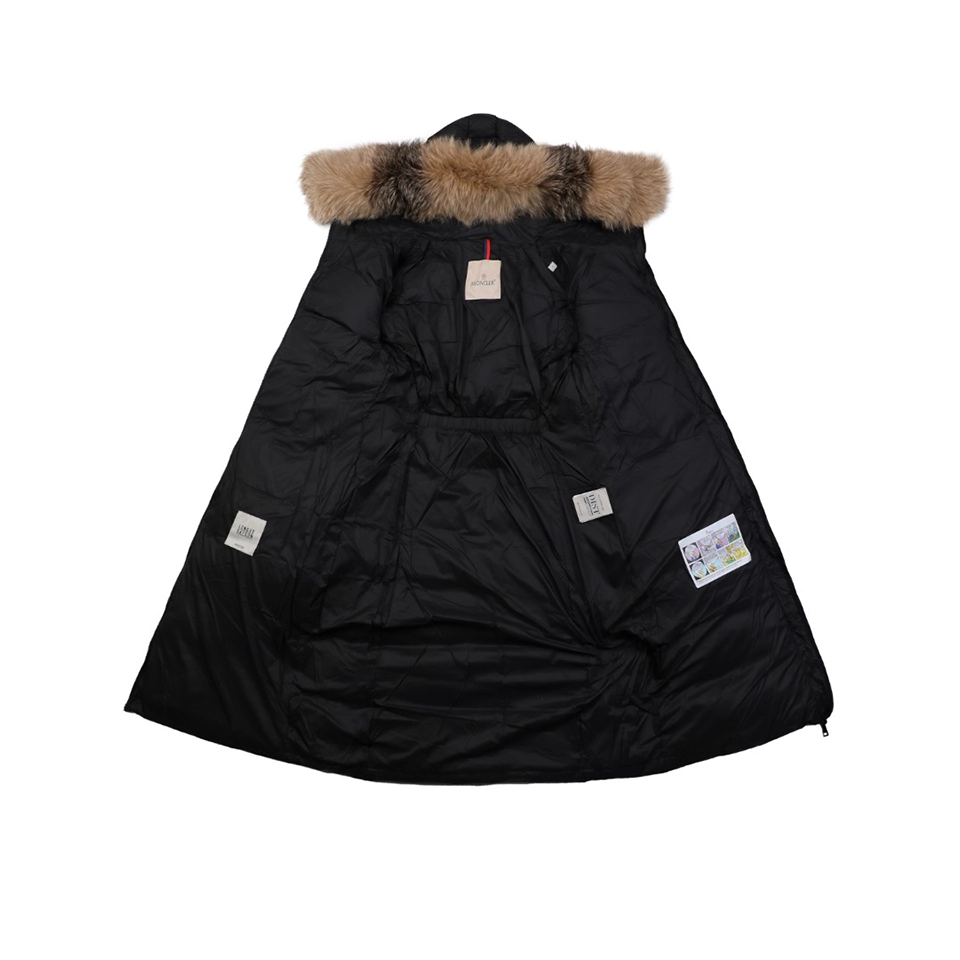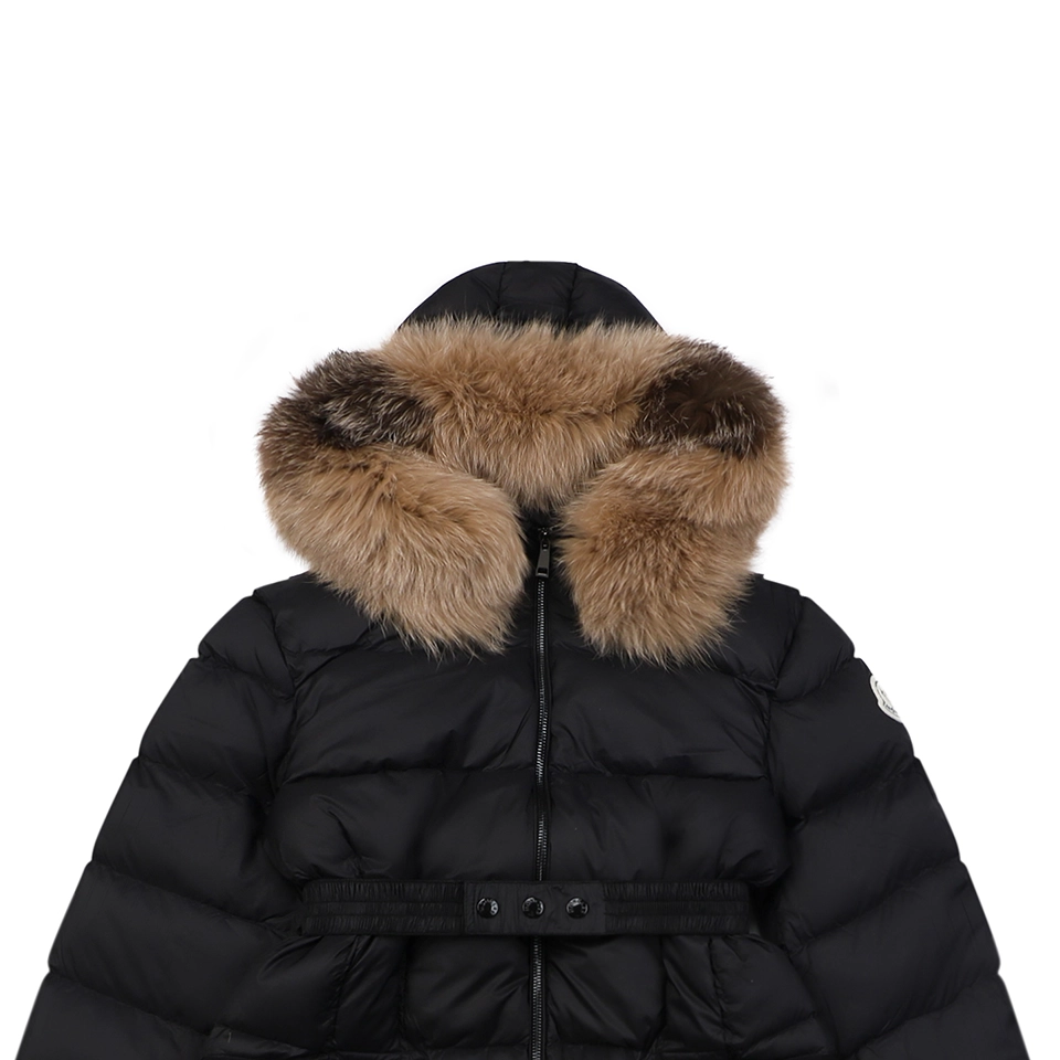 The design is elevated by a detachable fox fur-trimmed hood, offering both luxurious texture and enhanced wind protection. A slim elastic belt cinches the waist to create a flattering, sculpted silhouette, while the long quilted structure ensures optimal heat retention. Finished with a two-way zip closure, ribbon-accented zip pockets, elastic cuffs, and brand-correct trims, this down jacket delivers both visual sophistication and everyday functionality. Filled with high-quality white duck down, it is suitable for daily wear, commuting, or cold-weather styling. Unisex design with custom-developed brand tags.