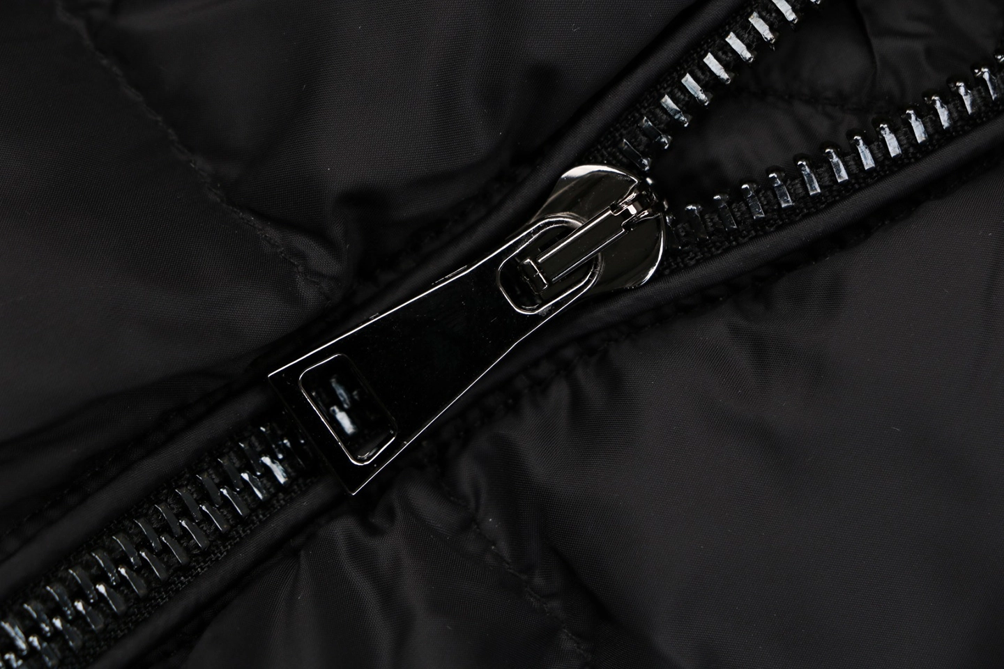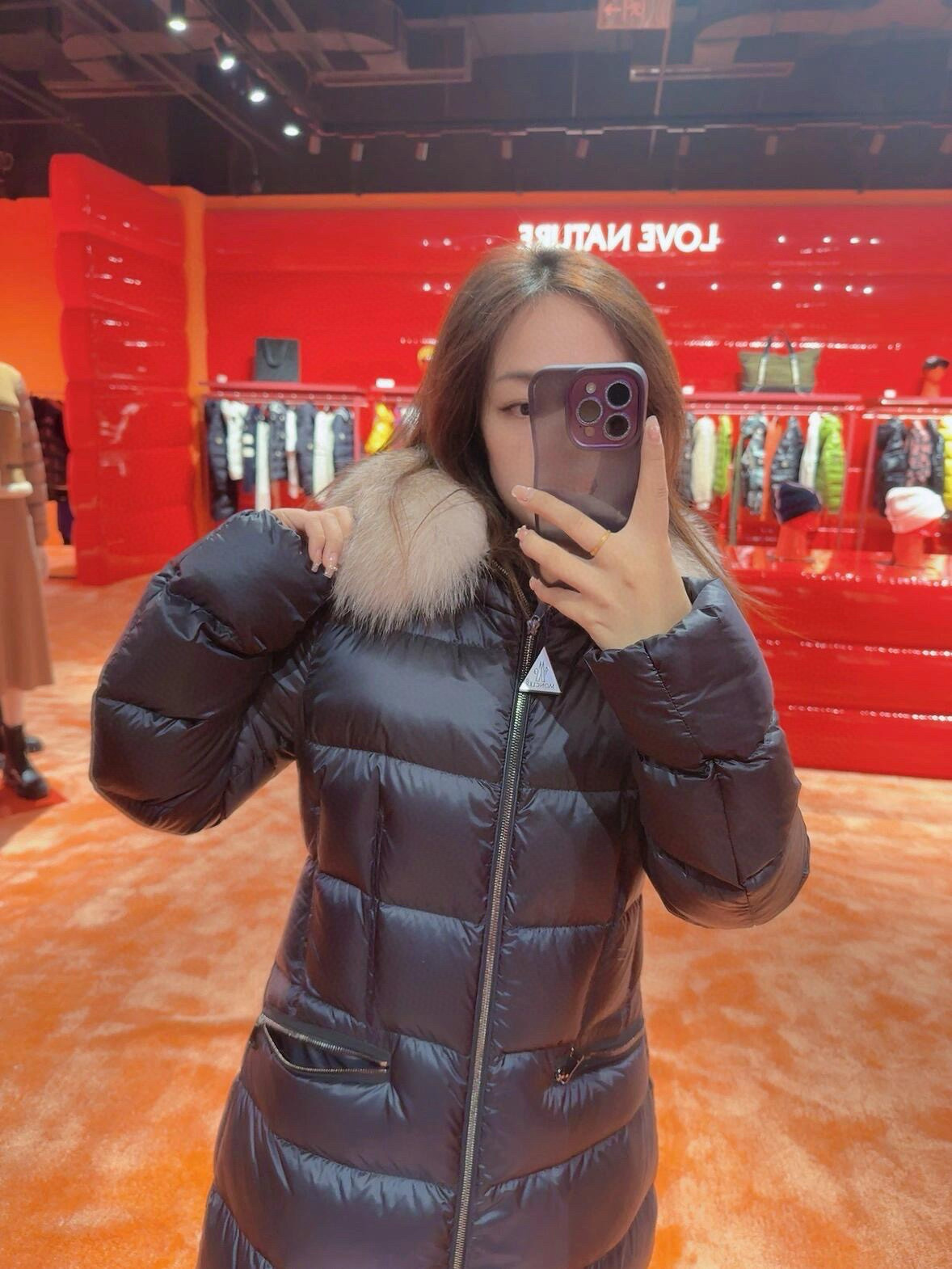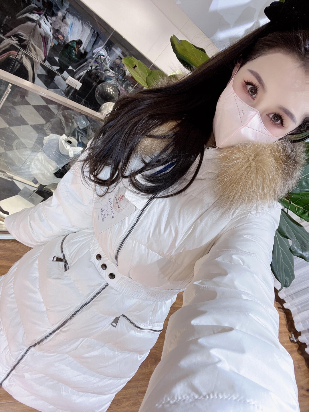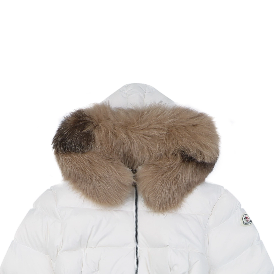 The design is elevated by a detachable fox fur-trimmed hood, offering both luxurious texture and enhanced wind protection. A slim elastic belt cinches the waist to create a flattering, sculpted silhouette, while the long quilted structure ensures optimal heat retention. Finished with a two-way zip closure, ribbon-accented zip pockets, elastic cuffs, and brand-correct trims, this down jacket delivers both visual sophistication and everyday functionality. Filled with high-quality white duck down, it is suitable for daily wear, commuting, or cold-weather styling. Unisex design with custom-developed brand tags.