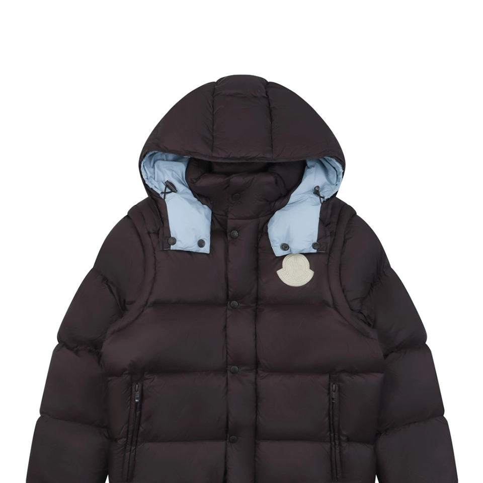 Its standout feature lies in the detachable sleeve construction. Hidden zippers at the shoulders allow the jacket to seamlessly transform from a full down jacket into a down vest, offering two distinct styling options in one garment. This adaptable design makes it ideal for fluctuating temperatures and changing environments.