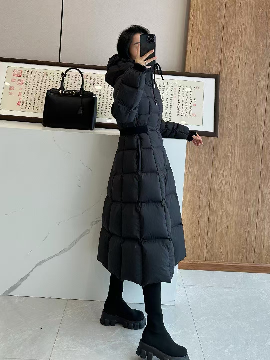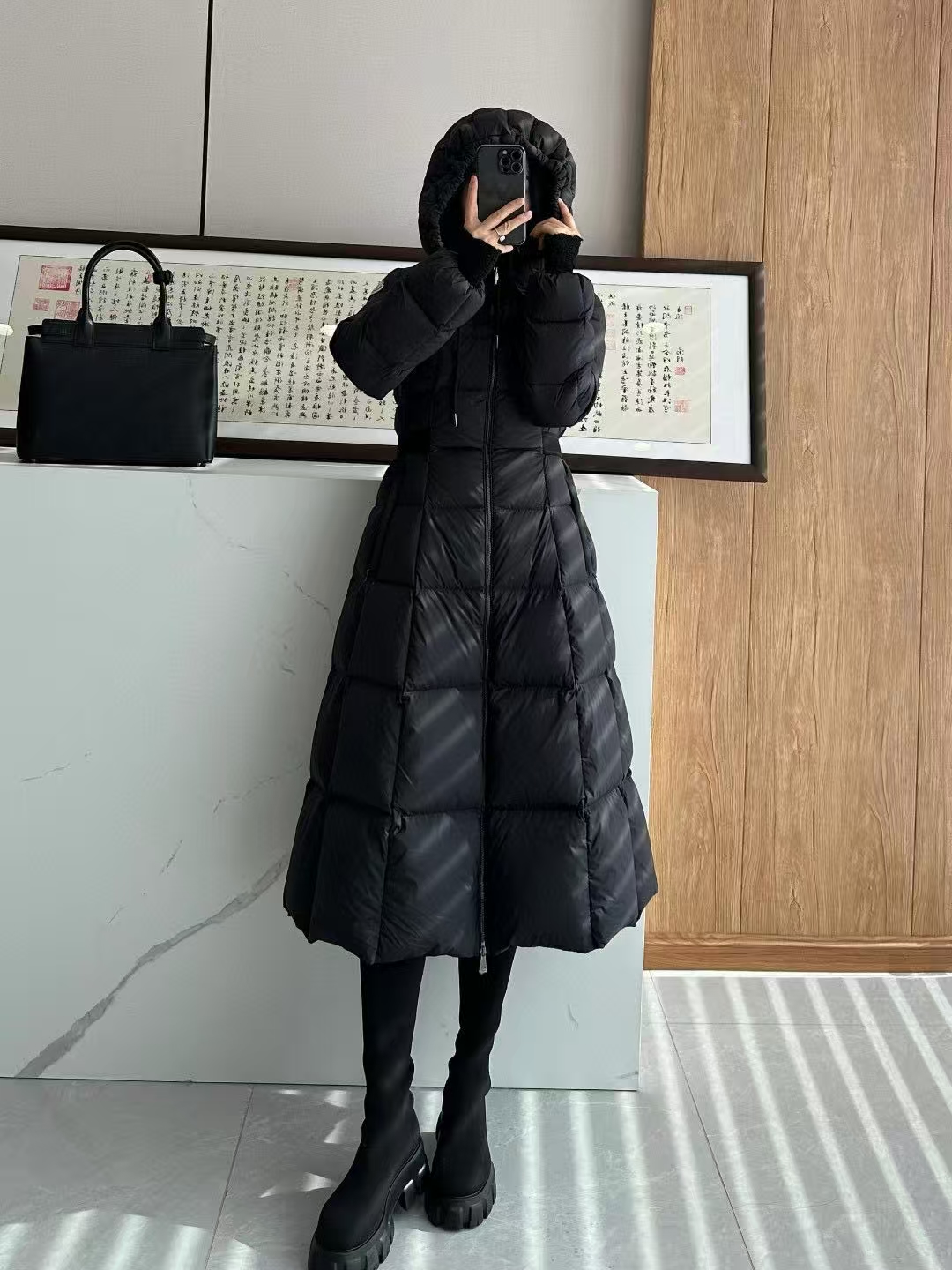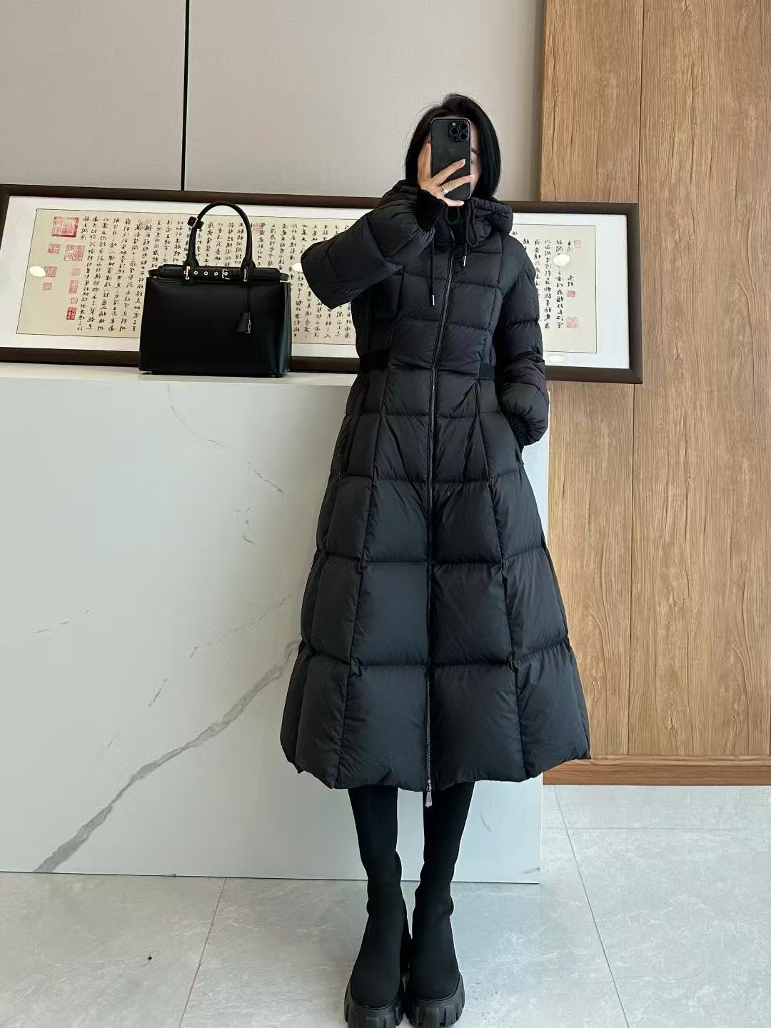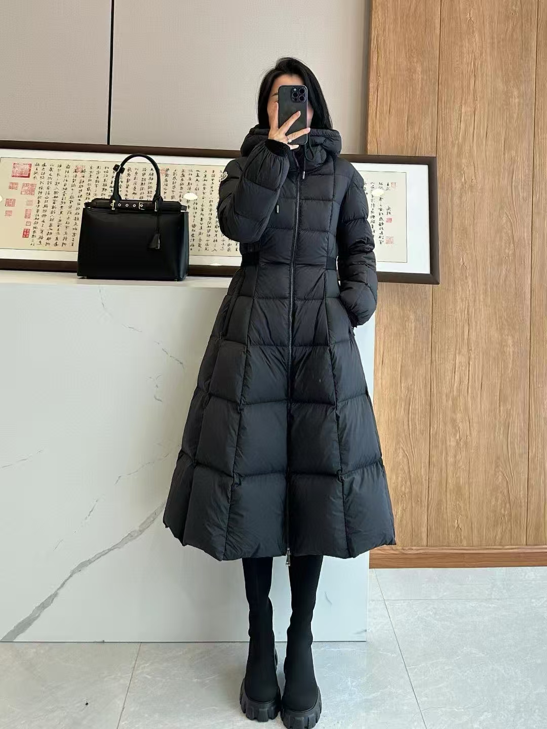 Filled with premium down and enhanced by Longue Saison lightweight lining technology, this coat delivers exceptional warmth without unnecessary bulk. Strategic quilting and additional fill at the hem create a full, sculpted skirt effect that moves gracefully, adding a dynamic and luxurious visual appeal.