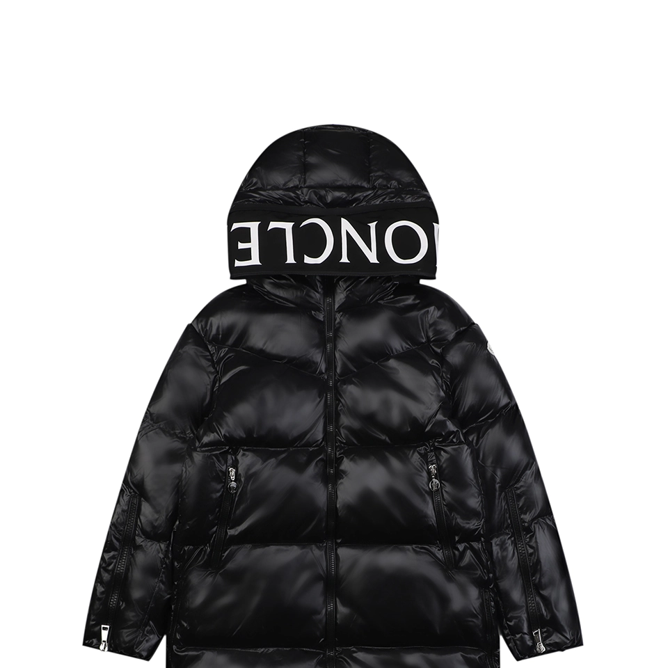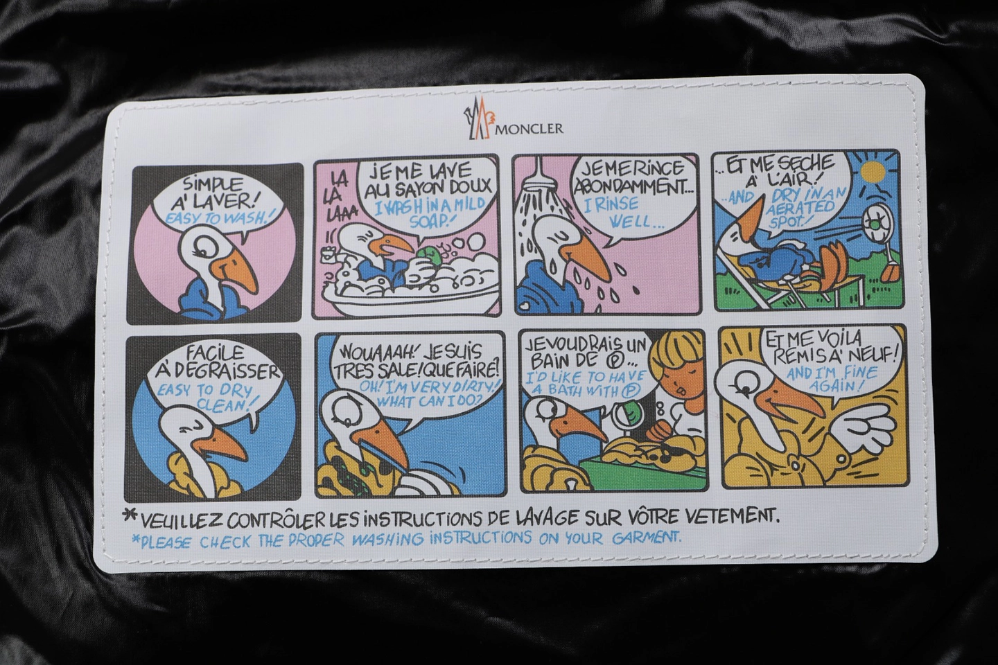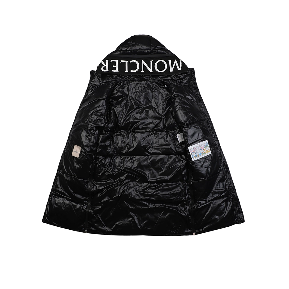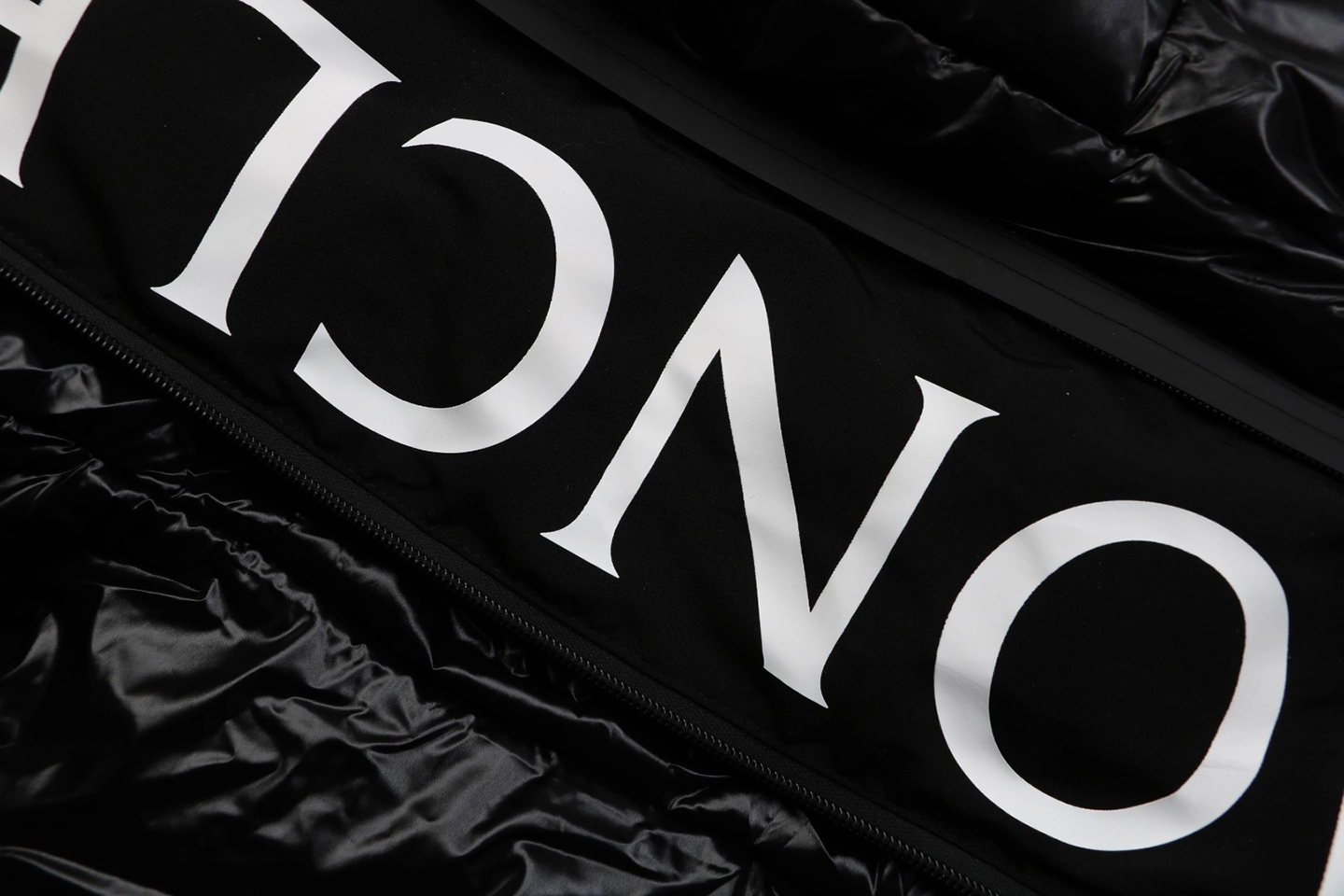 Featuring a knee-length cut, the jacket offers enhanced warmth and a flattering elongated profile. The oversized hood is accented with bold MONCLER lettering, creating instant brand recognition from every angle. Premium white duck down filling ensures lightweight insulation with superior loft, while the structured quilting enhances both warmth retention and visual depth. Designed for both men and women, this hooded long down jacket transitions seamlessly from urban styling to functional winter wear, making it a standout essential for cold seasons.