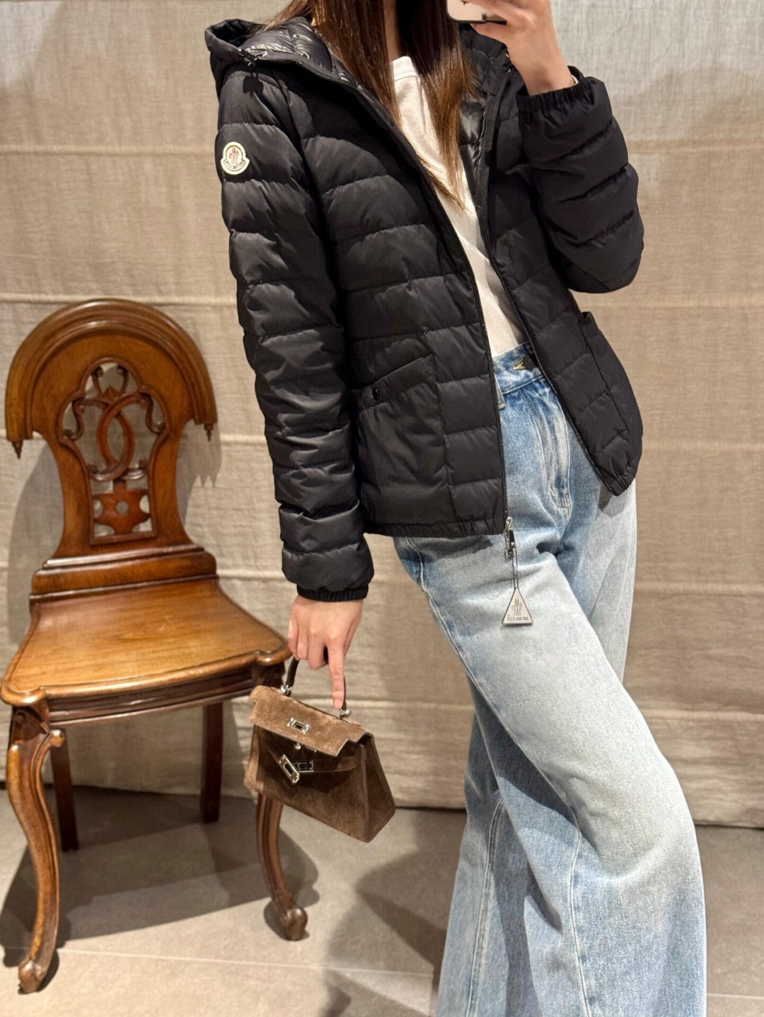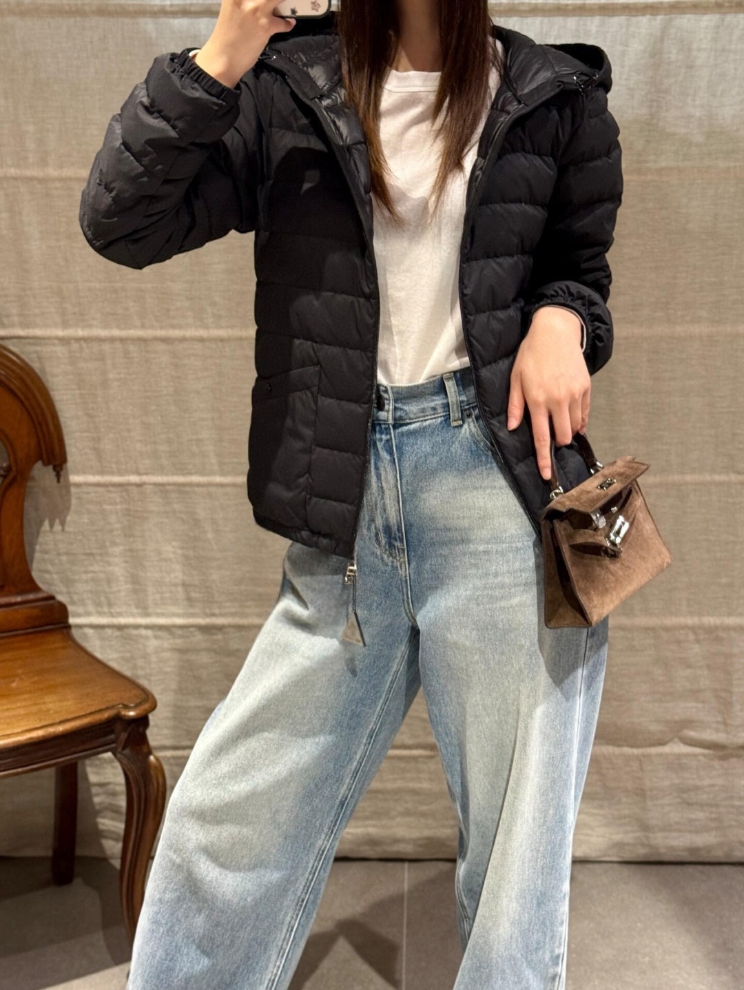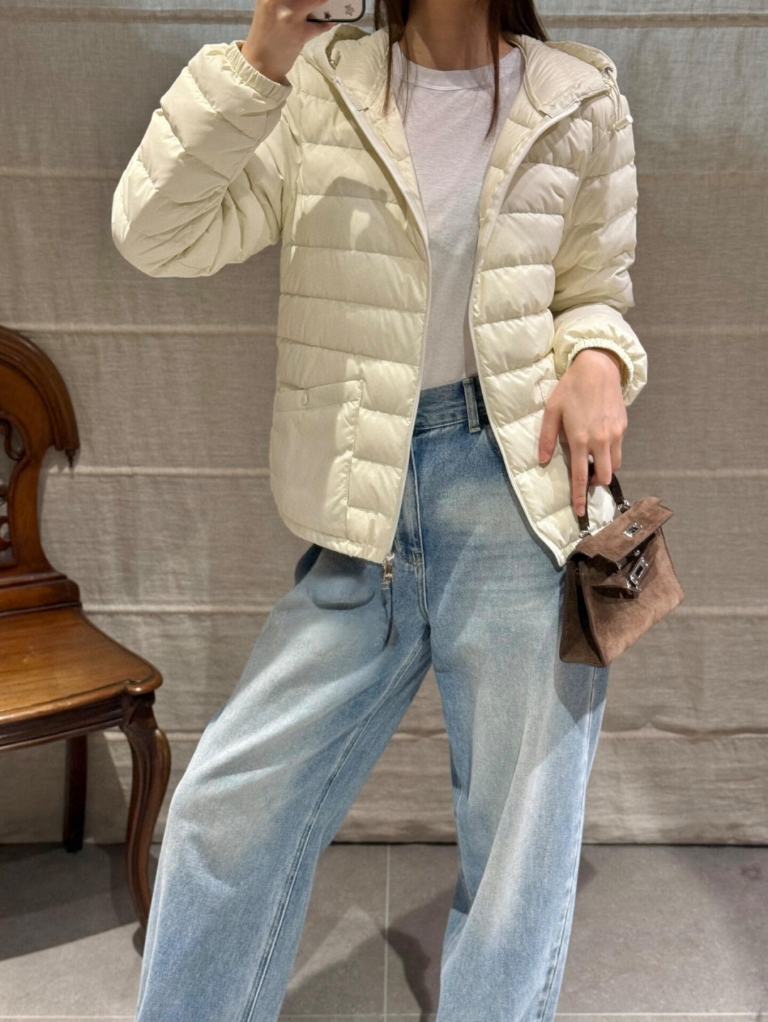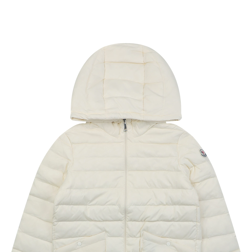 The integrated hood adds practicality and protection against changing weather conditions, while the cropped proportions subtly elevate the waistline for a flattering fit. Whether paired with tailored trousers, skirts, or chunky sneakers, the jacket adapts effortlessly to various styling needs.