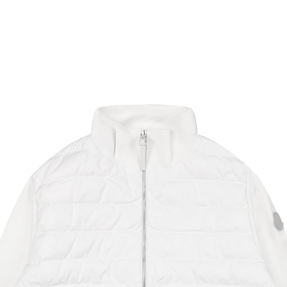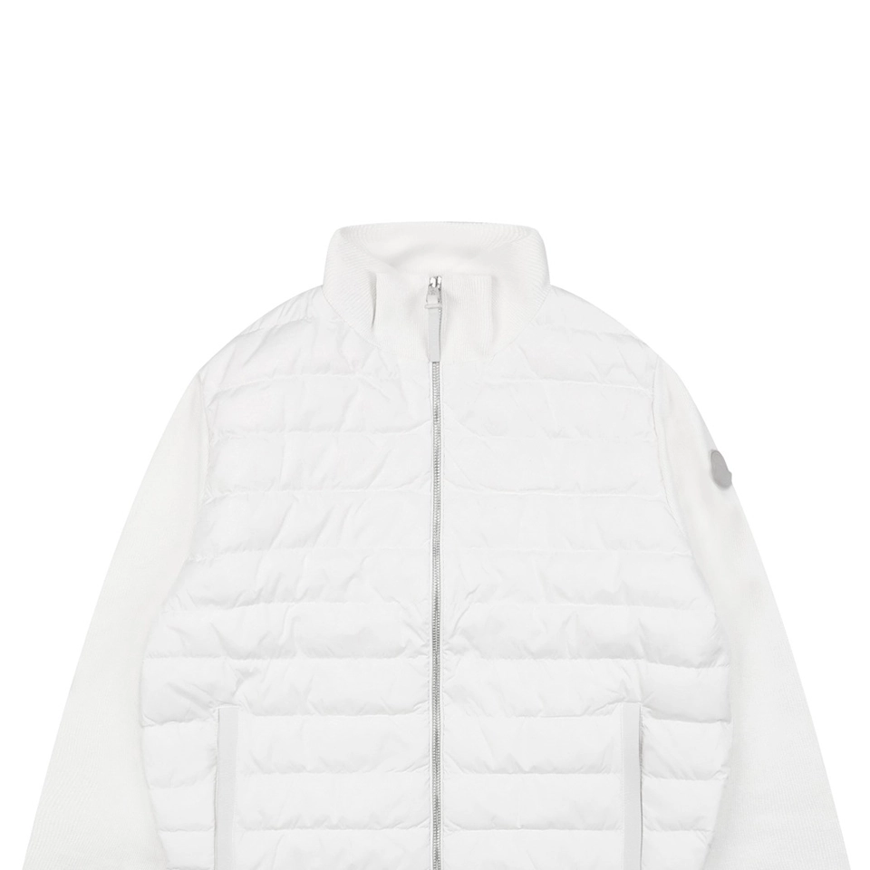 Crafted with nylon léger brillant fabric on the padded front, the jacket delivers lightweight warmth while maintaining a sleek appearance. Leather-trimmed pockets add a subtle luxury accent, enhancing both durability and visual depth. The stand collar design provides extra protection against wind, while the streamlined zip closure ensures easy layering. Ideal for wearing alone in mild weather or layering under coats in colder temperatures, this knit down jacket is a timeless essential for both men and women.