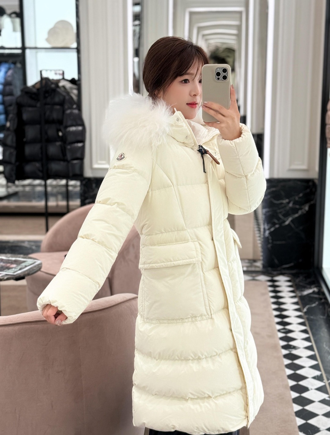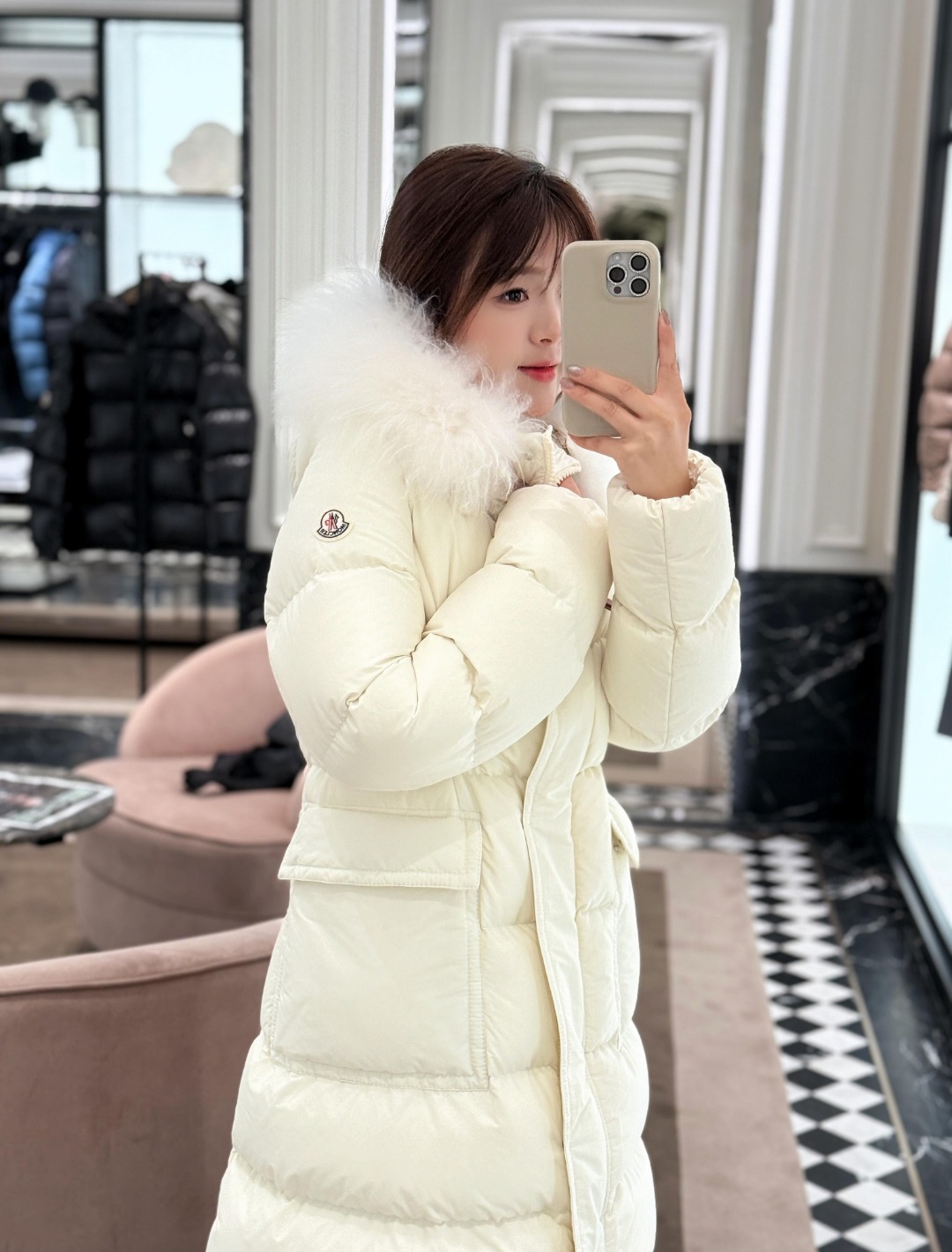 Filled with premium white duck down, the jacket offers excellent insulation while maintaining a lightweight and structured feel. The tailored waist design enhances the overall shape, preventing bulkiness and creating a flattering, elegant profile. Multiple functional pockets add practicality, while the signature Moncler logo patch completes the look with refined brand recognition. Ideal for commuting, daily wear, and winter styling, this unisex down jacket balances fashion appeal with functional performance.