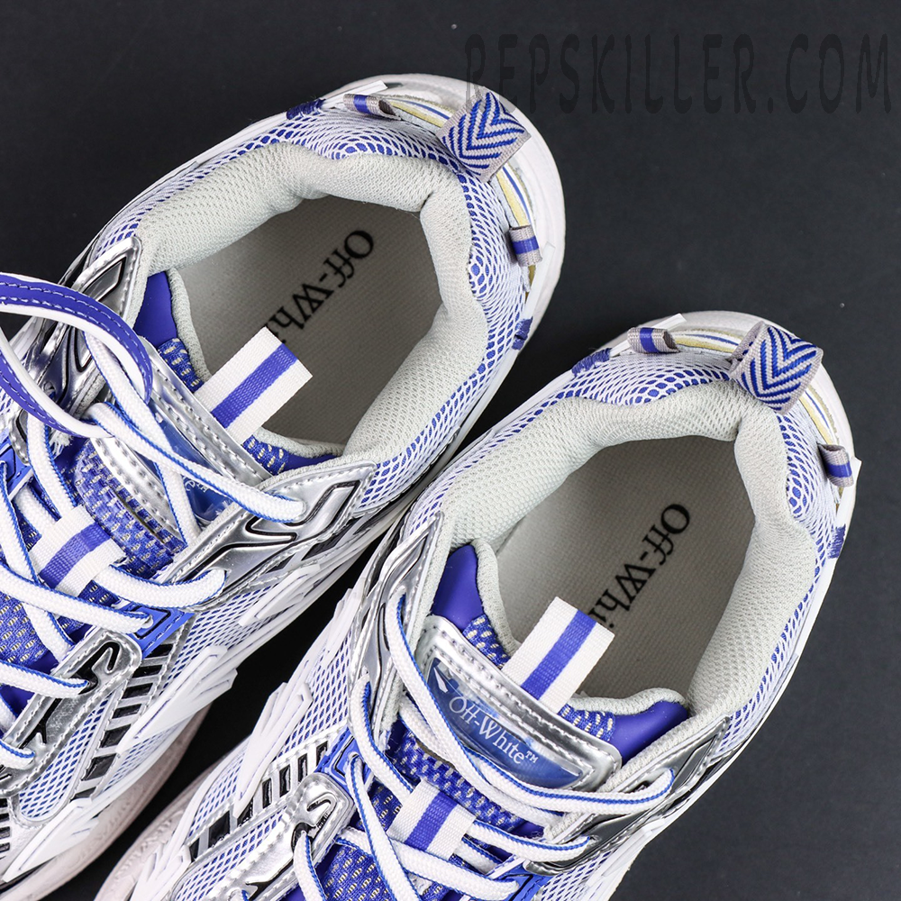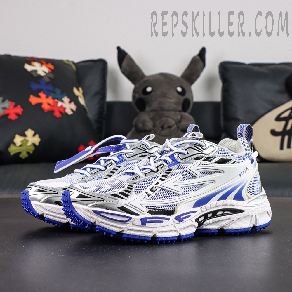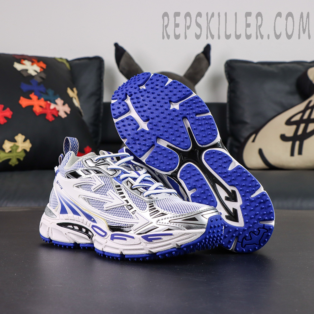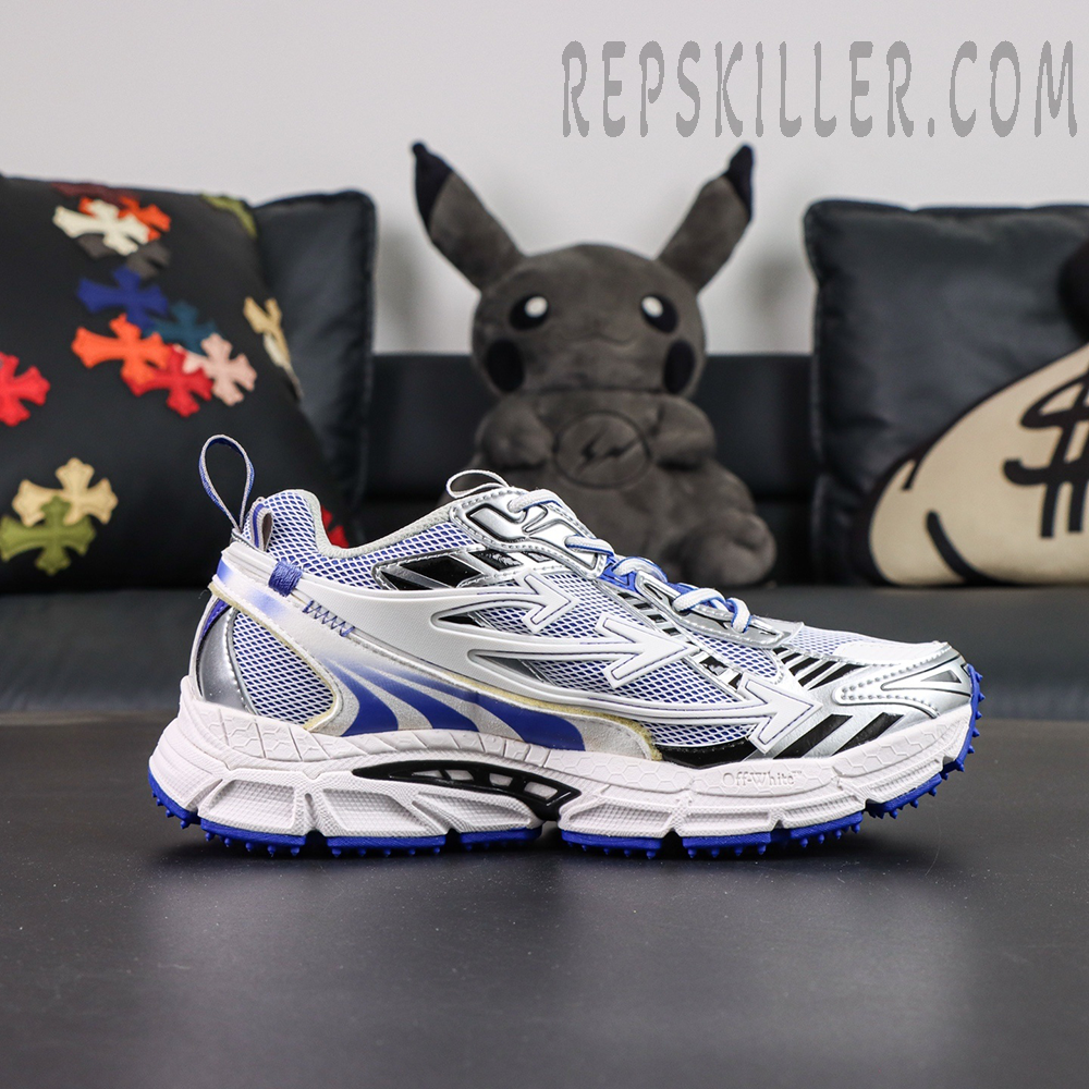 Signature Off-White Arrow motifs dominate the side panels, seamlessly integrated into the sneaker’s flowing structure. Technical paneling, exposed detailing, and layered construction emphasize the brand’s signature deconstructed style.