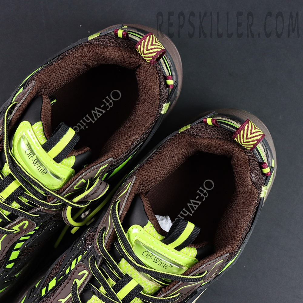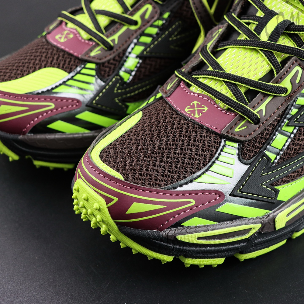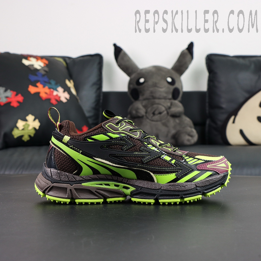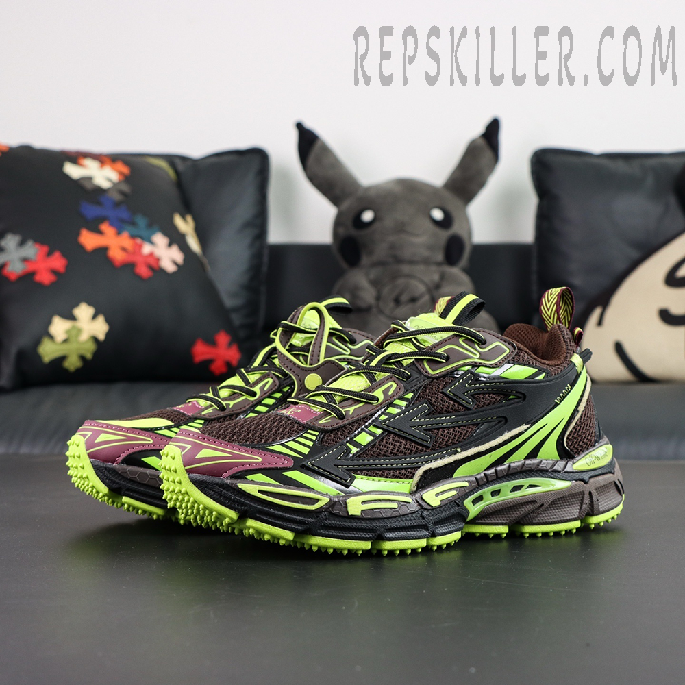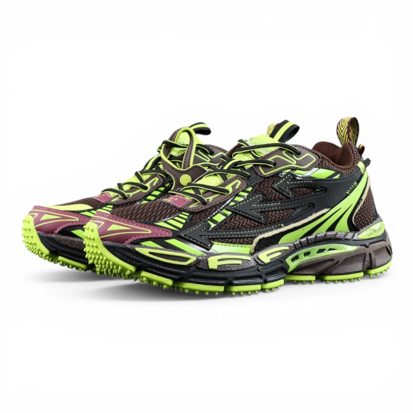 Built with a breathable mesh base in rich chocolate brown, the upper is layered with dynamic synthetic panels and highlighted by striking neon green overlays. This contrast creates a visually aggressive look, while the signature Off-White Arrow branding flows across the sides for unmistakable identity.