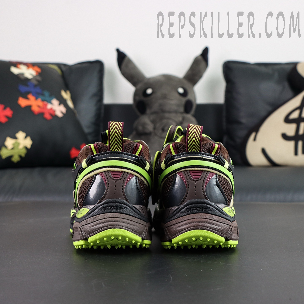 The Off-White Be Right Back ‘Chocolate Brown Green’ stands out with a bold fusion of earthy tones and high-visibility accents, delivering a statement sneaker that blends outdoor-inspired aesthetics with futuristic design.