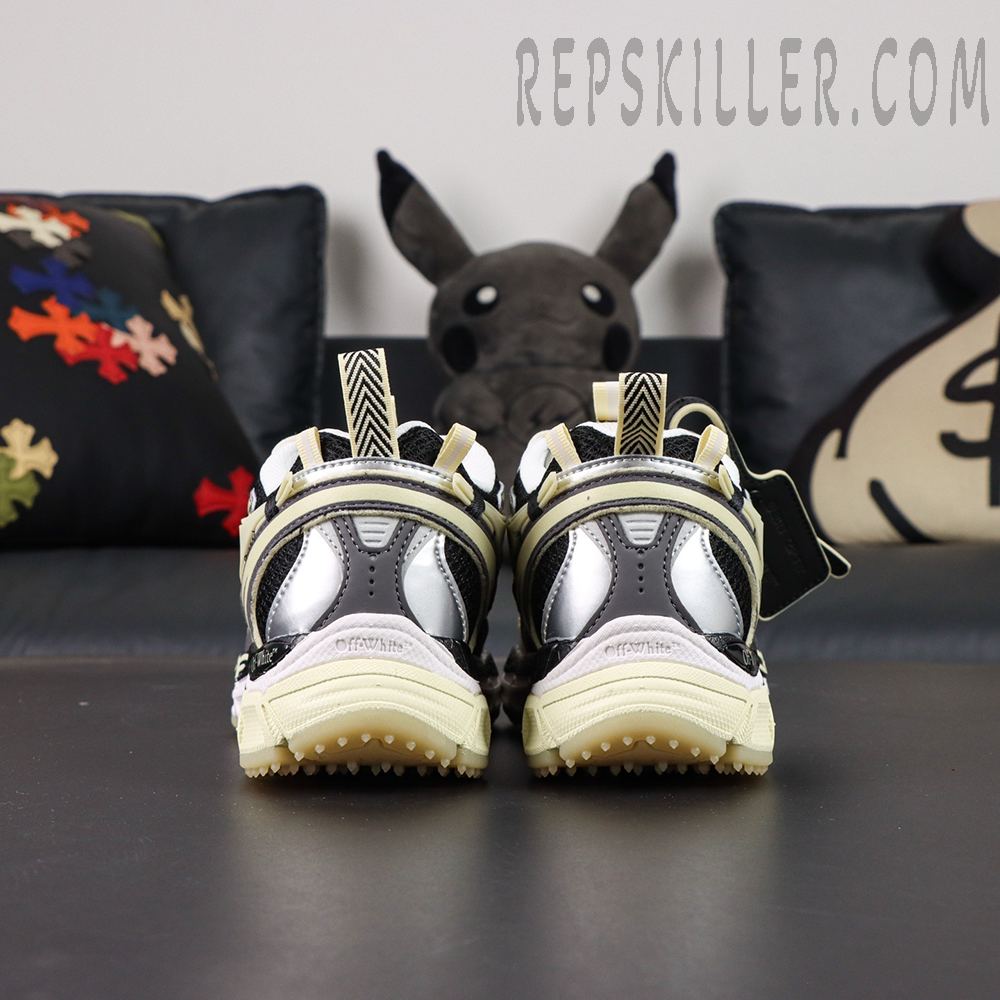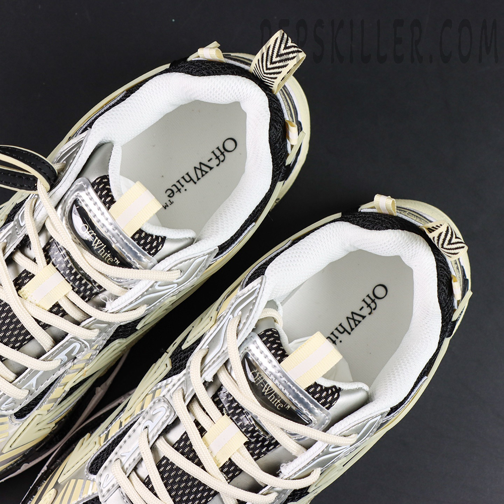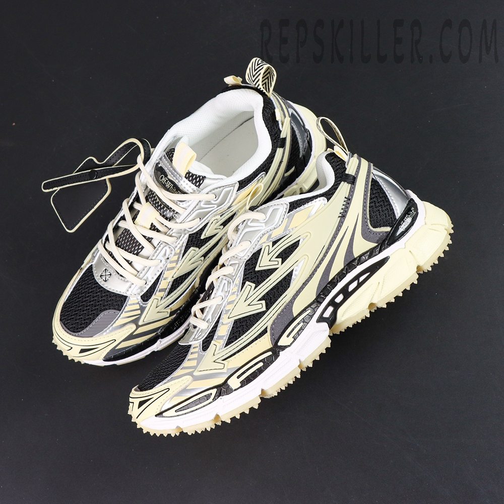 Crafted with a layered mix of mesh, synthetic overlays, and glow-in-the-dark leather, the upper transforms in low-light conditions, delivering a striking visual effect that elevates every step. The design is accented by signature arrow motifs across the side panels, reinforcing Off-White’s unmistakable identity.