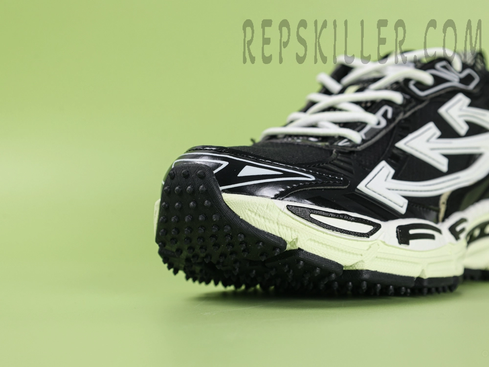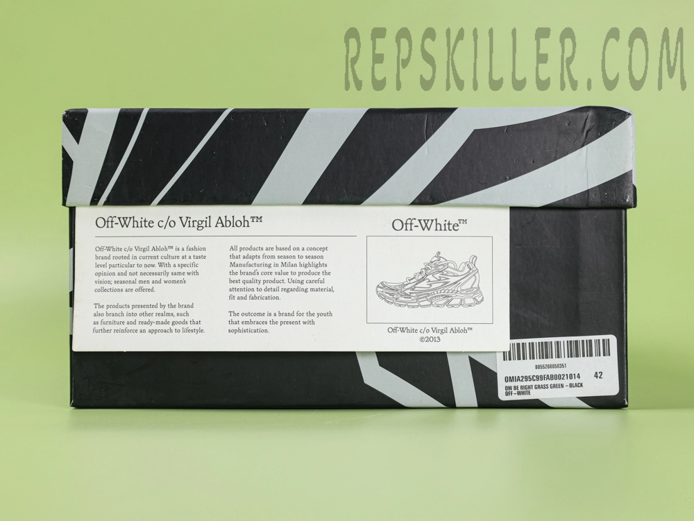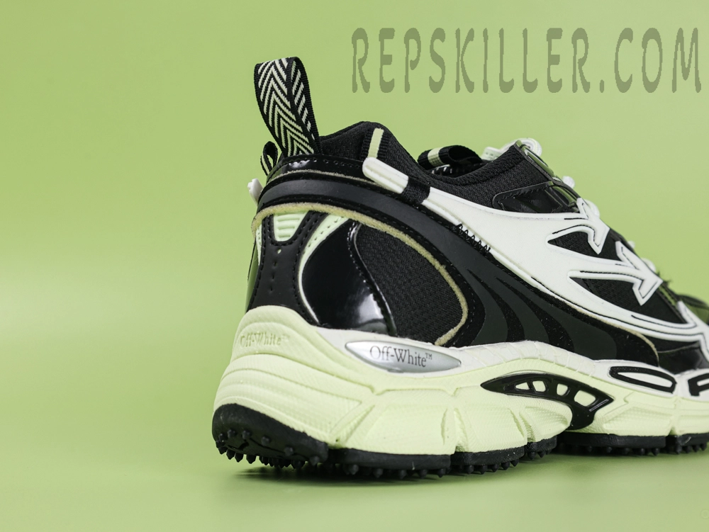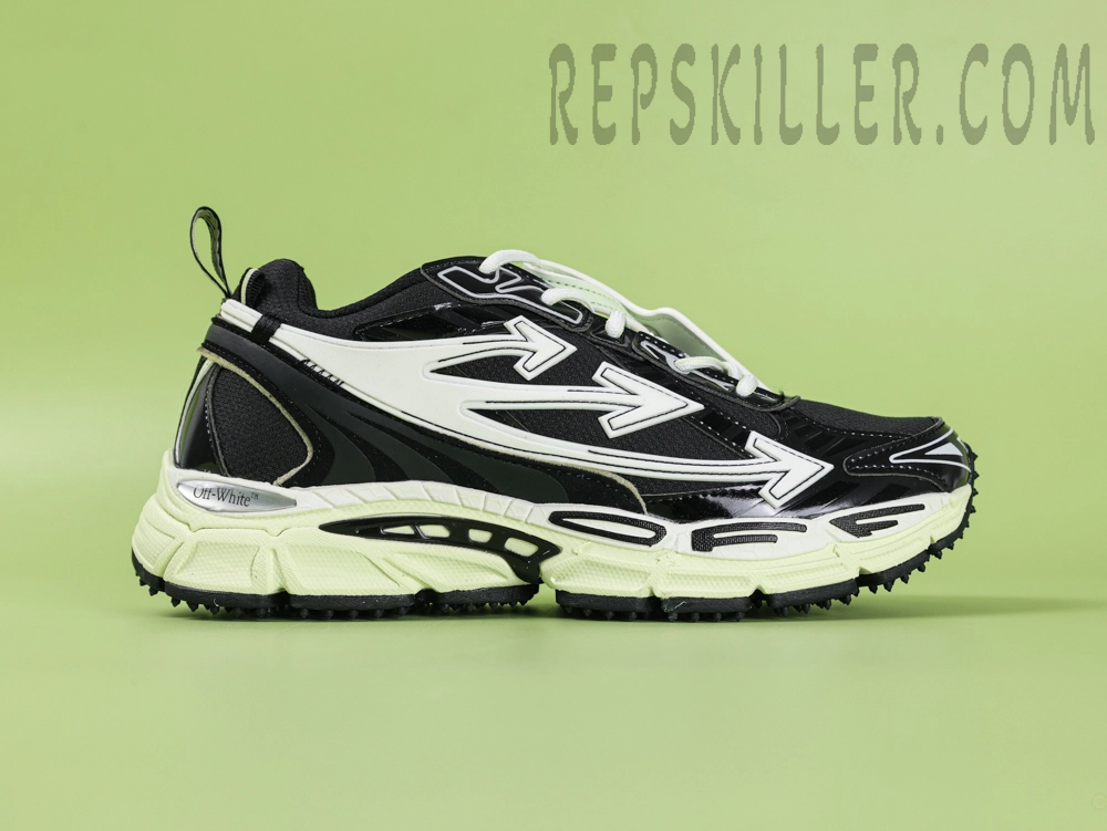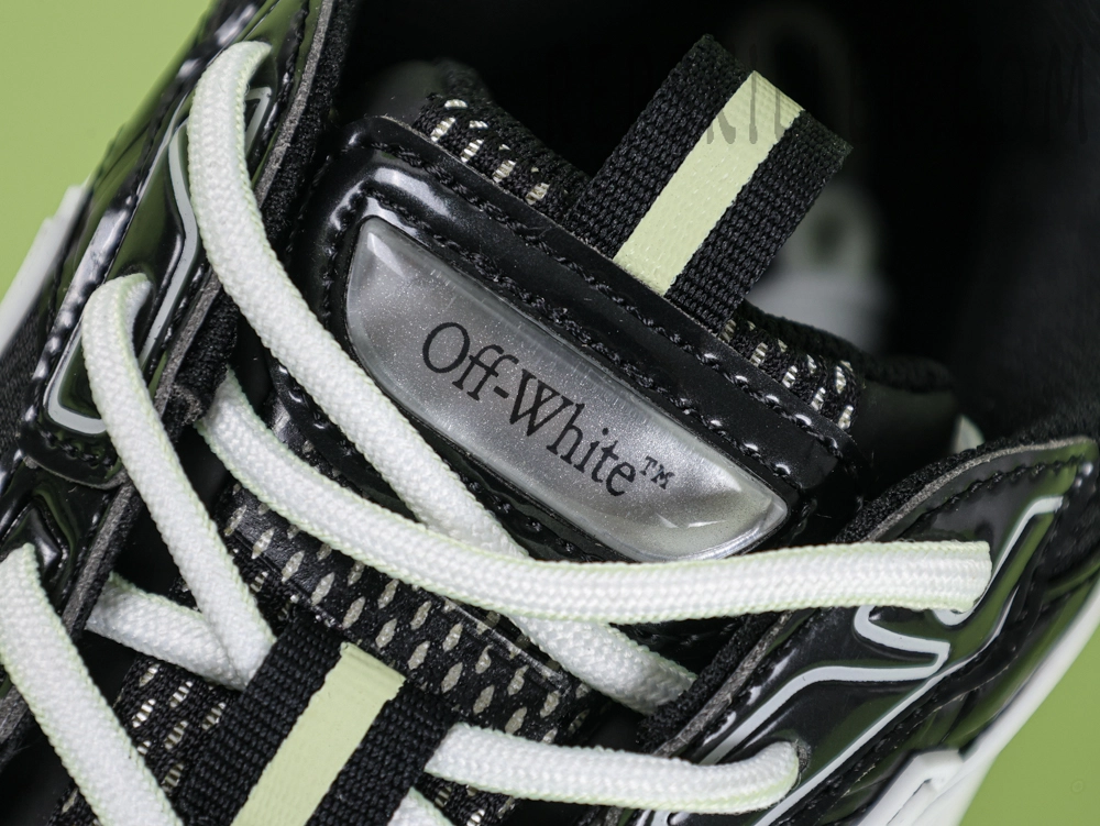 The Off-White Be Right Back ‘Grass Green Black’ reimagines the trail runner silhouette with a bold, futuristic aesthetic. The upper features a technical blend of black mesh and glossy synthetic overlays, accentuated by signature arrow logos in reflective white. The midsole is sculpted with layered EVA foam in a light green hue, providing a striking visual contrast and responsive cushioning. A rugged outsole ensures grip and durability, while branded hits like the metallic Off-White™ plaque on the heel deliver unmistakable designer flair. Built for city explorers and fashion-forward minds alike.