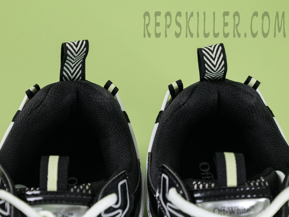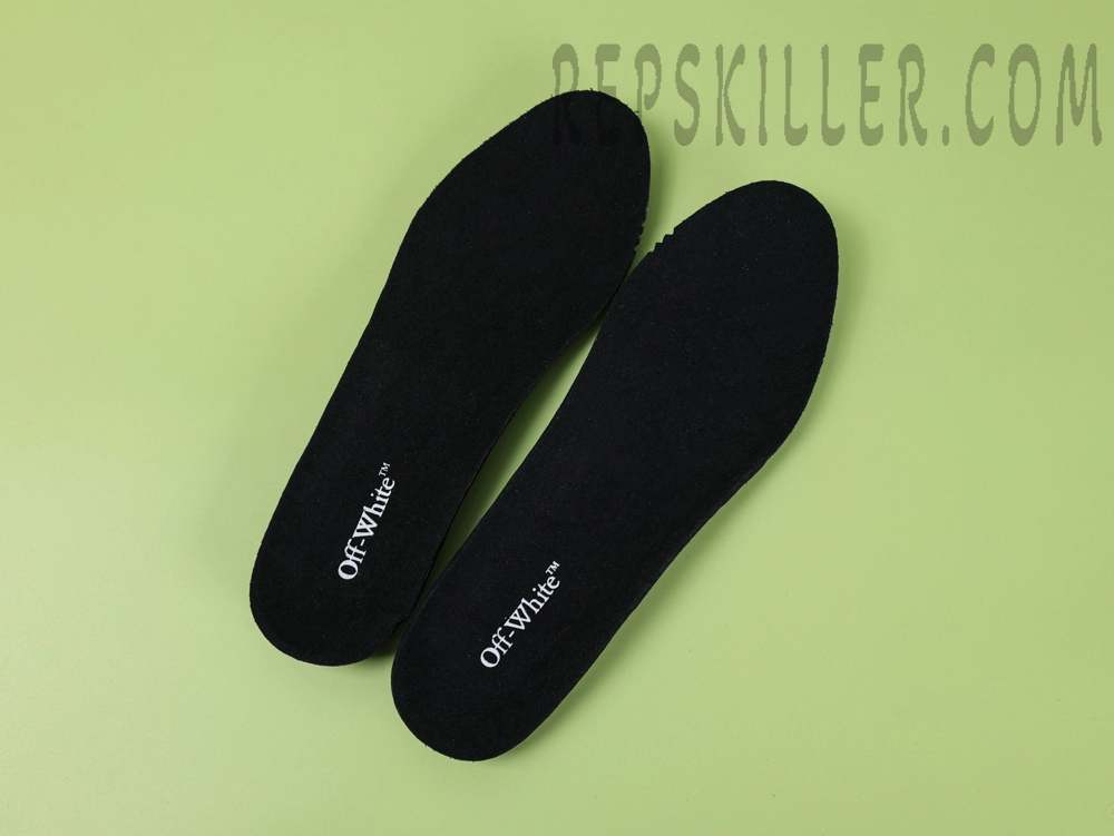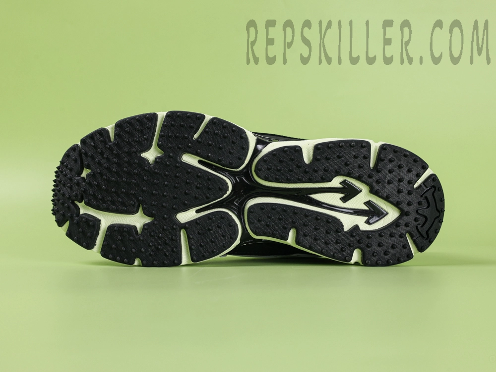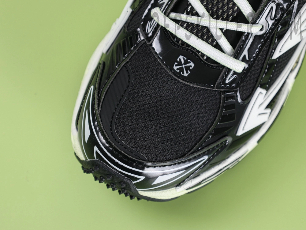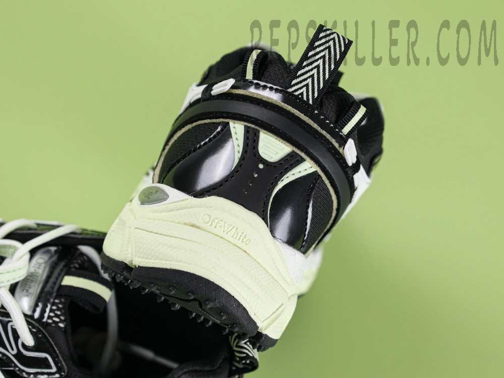 The Off-White Be Right Back ‘Grass Green Black’ reimagines the trail runner silhouette with a bold, futuristic aesthetic. The upper features a technical blend of black mesh and glossy synthetic overlays, accentuated by signature arrow logos in reflective white. The midsole is sculpted with layered EVA foam in a light green hue, providing a striking visual contrast and responsive cushioning. A rugged outsole ensures grip and durability, while branded hits like the metallic Off-White™ plaque on the heel deliver unmistakable designer flair. Built for city explorers and fashion-forward minds alike.