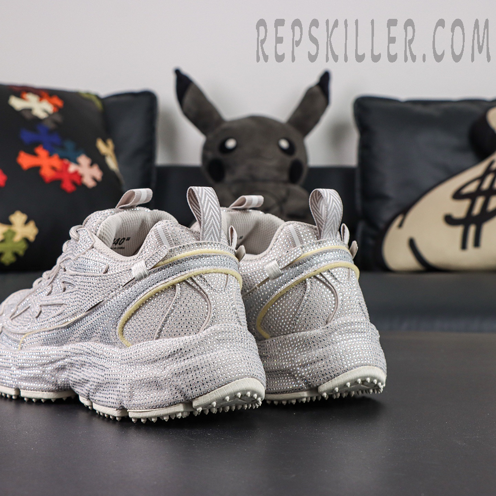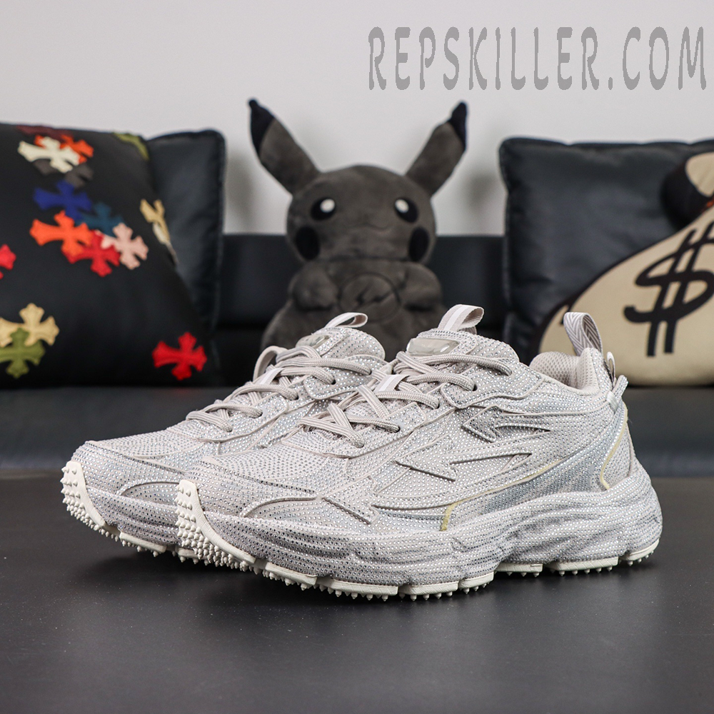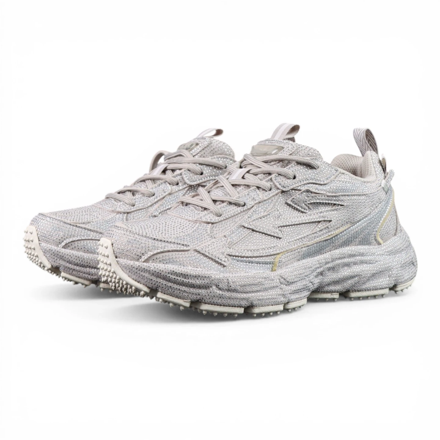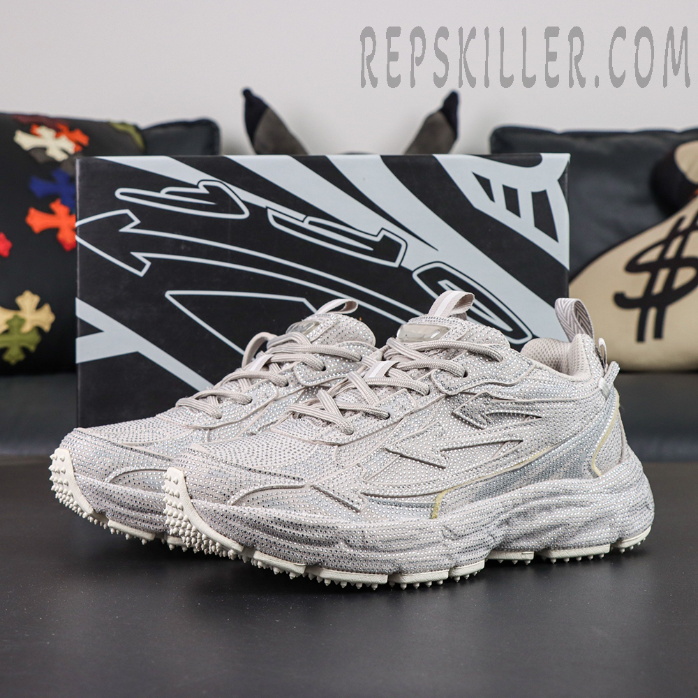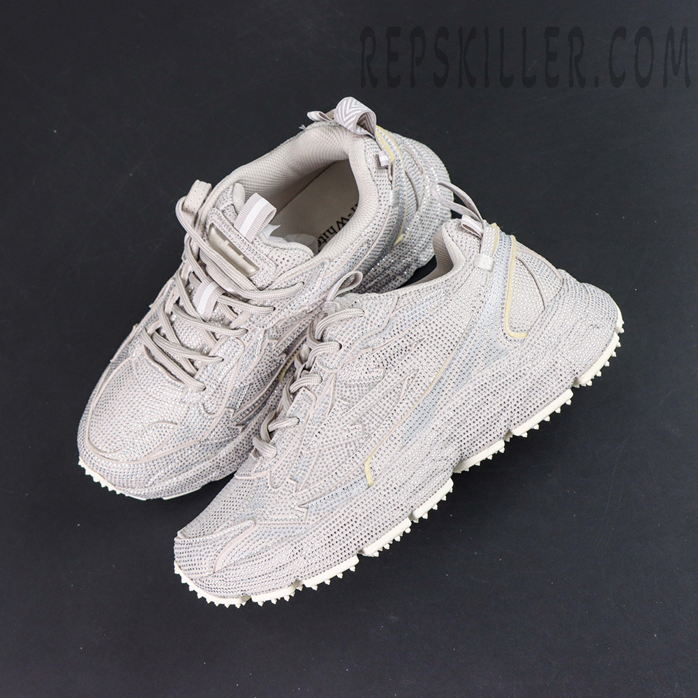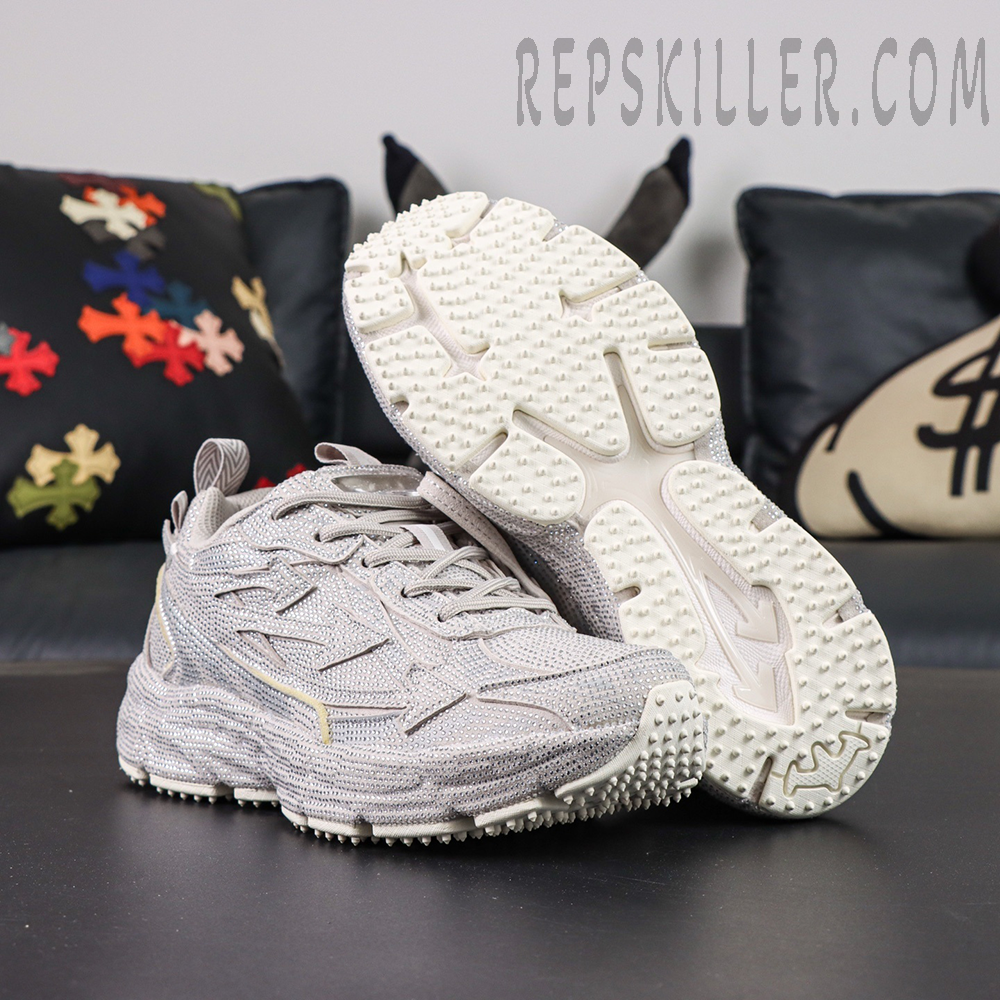 Signature Off-White design language is instantly recognizable, including the iconic Arrow motifs, dynamic paneling, and a layered silhouette that merges fashion and sport. The tonal silver palette enhances the futuristic vibe, giving the shoe a sleek, high-fashion edge.