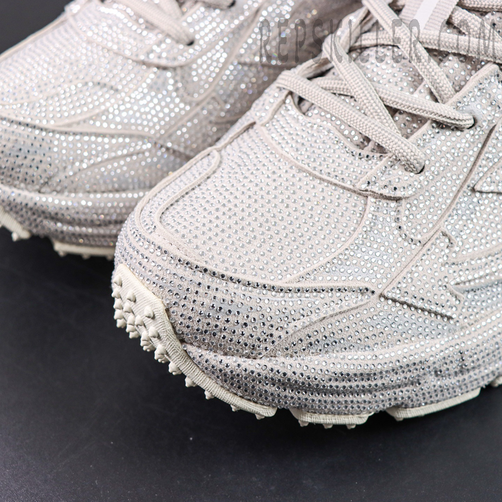 The upper features a fully silver, glitter-infused finish, delivering a reflective, eye-catching look from every angle. Built on a base of breathable mesh with layered synthetic panels, the sneaker balances visual intensity with lightweight comfort and structure.