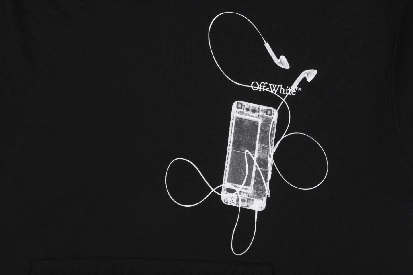 The Off-White Digital Earphone Arrow Print Hoodie showcases a futuristic reinterpretation of the brand’s signature Arrow motif. Crafted in soft black cotton, it features intricate X-ray-inspired prints of digital earphones, flowers, and everyday objects. These striking visuals wrap around the chest, sleeves, and back, creating a layered, tech-infused aesthetic. With a relaxed fit and street-ready appeal, this hoodie seamlessly blends comfort with avant-garde style.