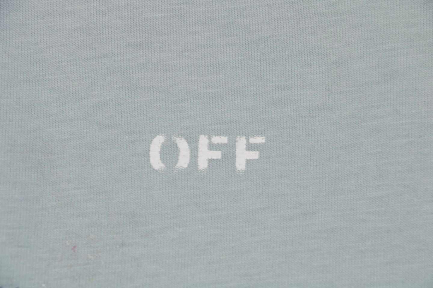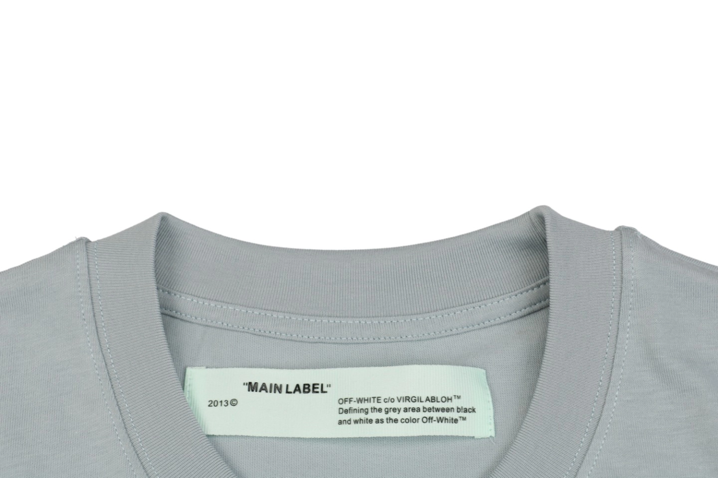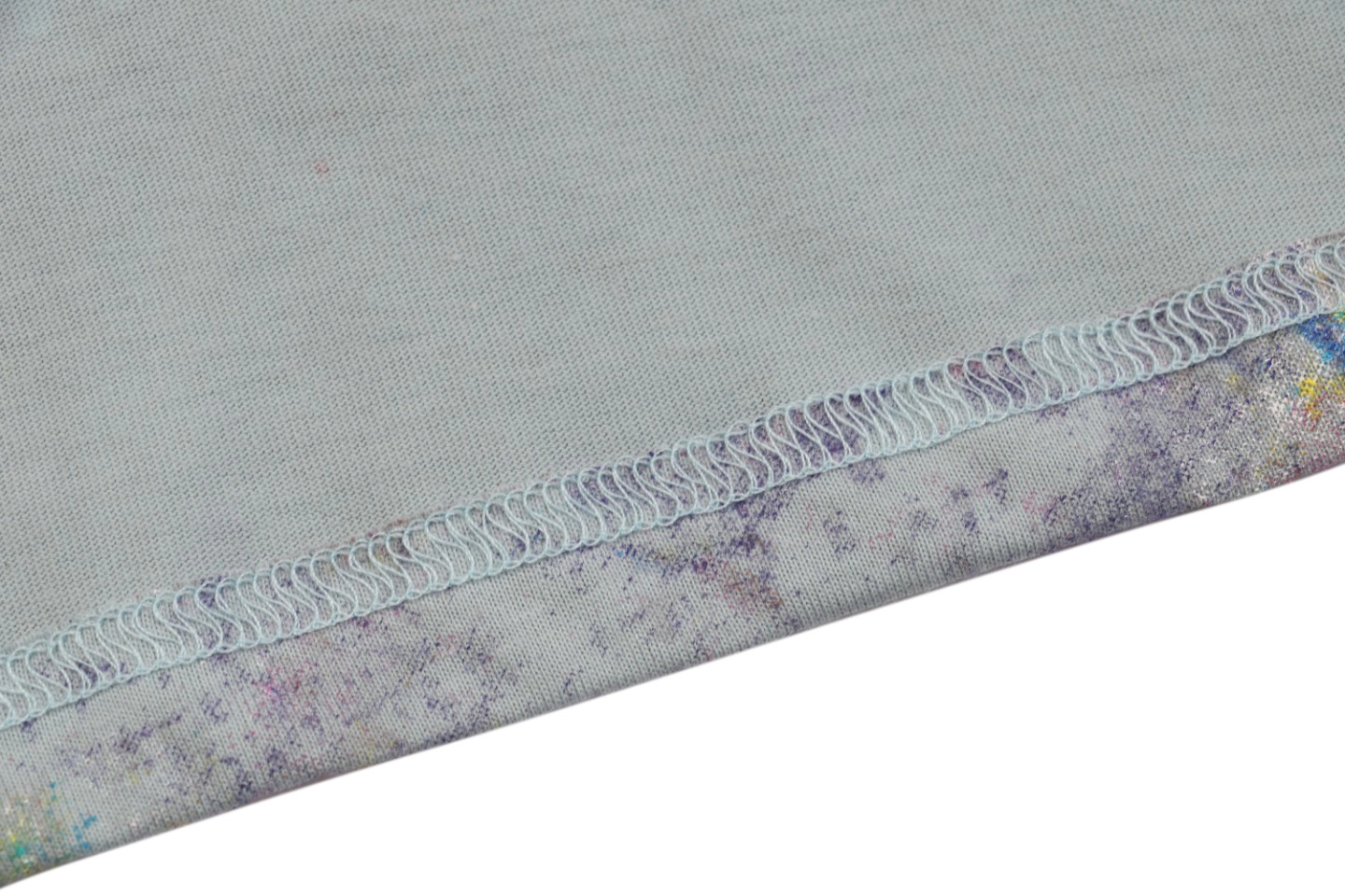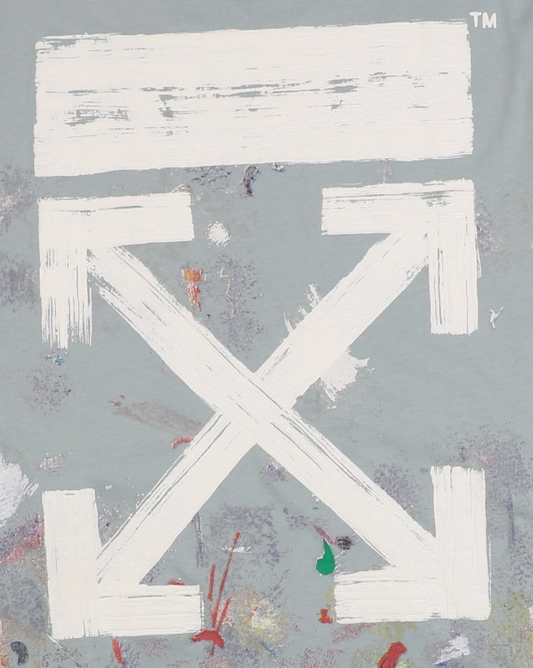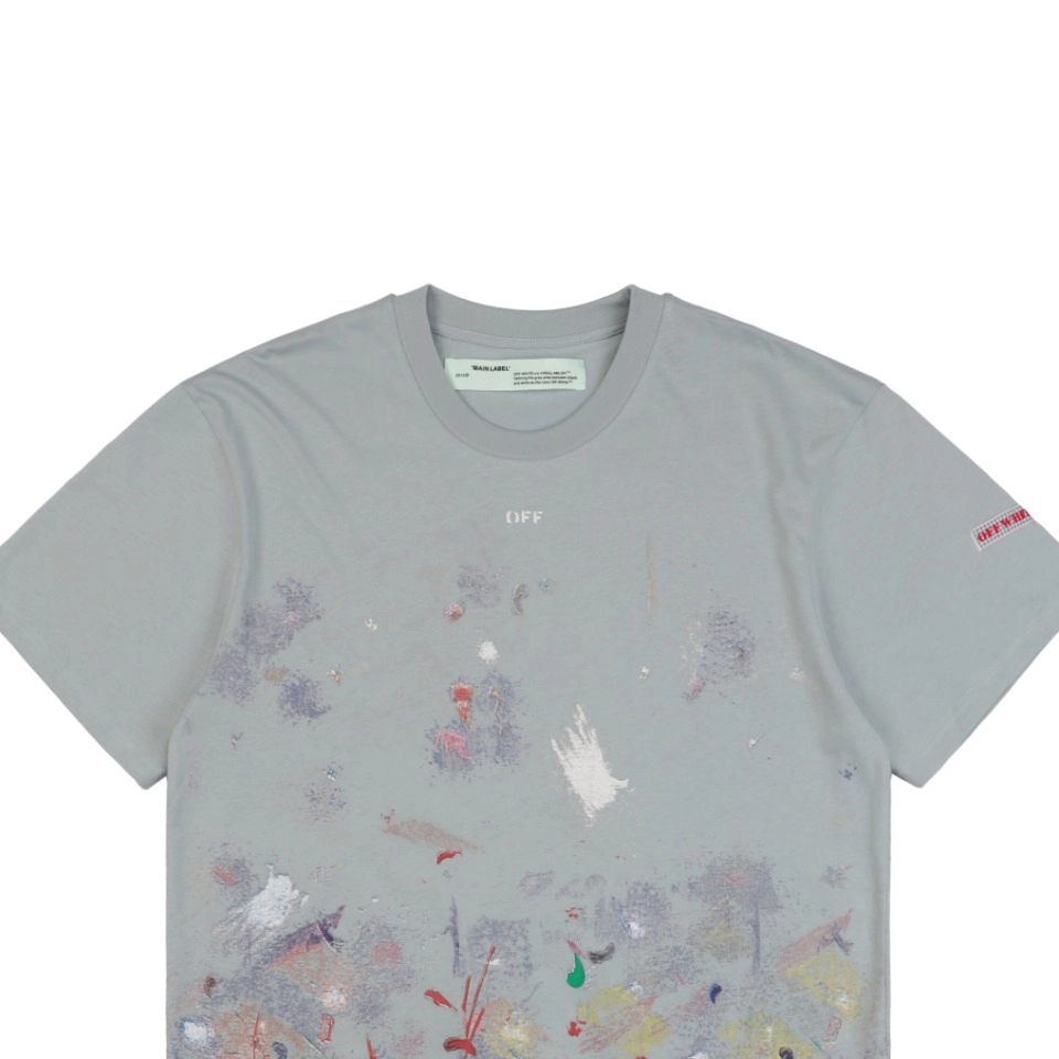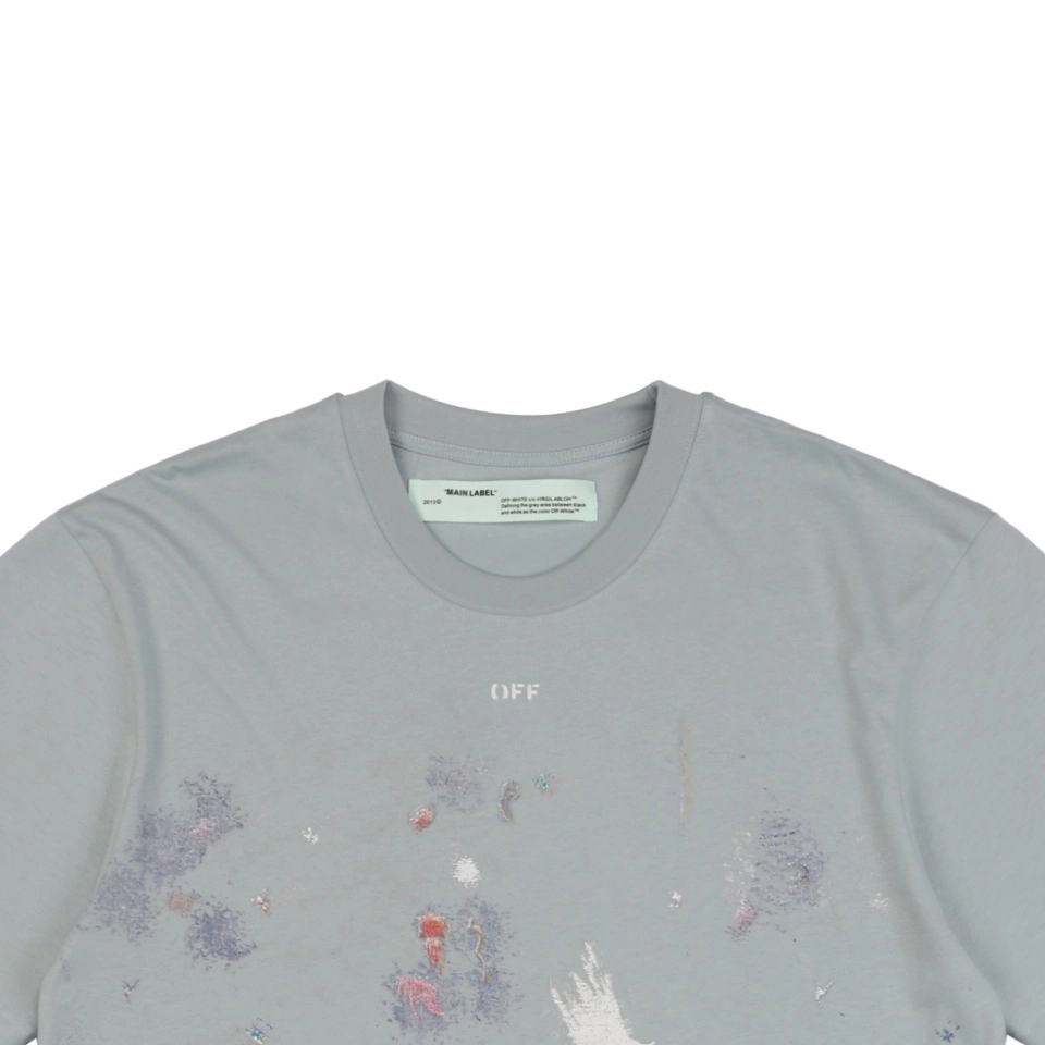 The Off-White Grey Galaxy Paint Splatter Arrow Graphic T-Shirt showcases a bold artistic expression through complex layered printing and signature branding.