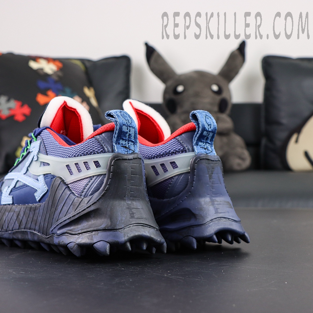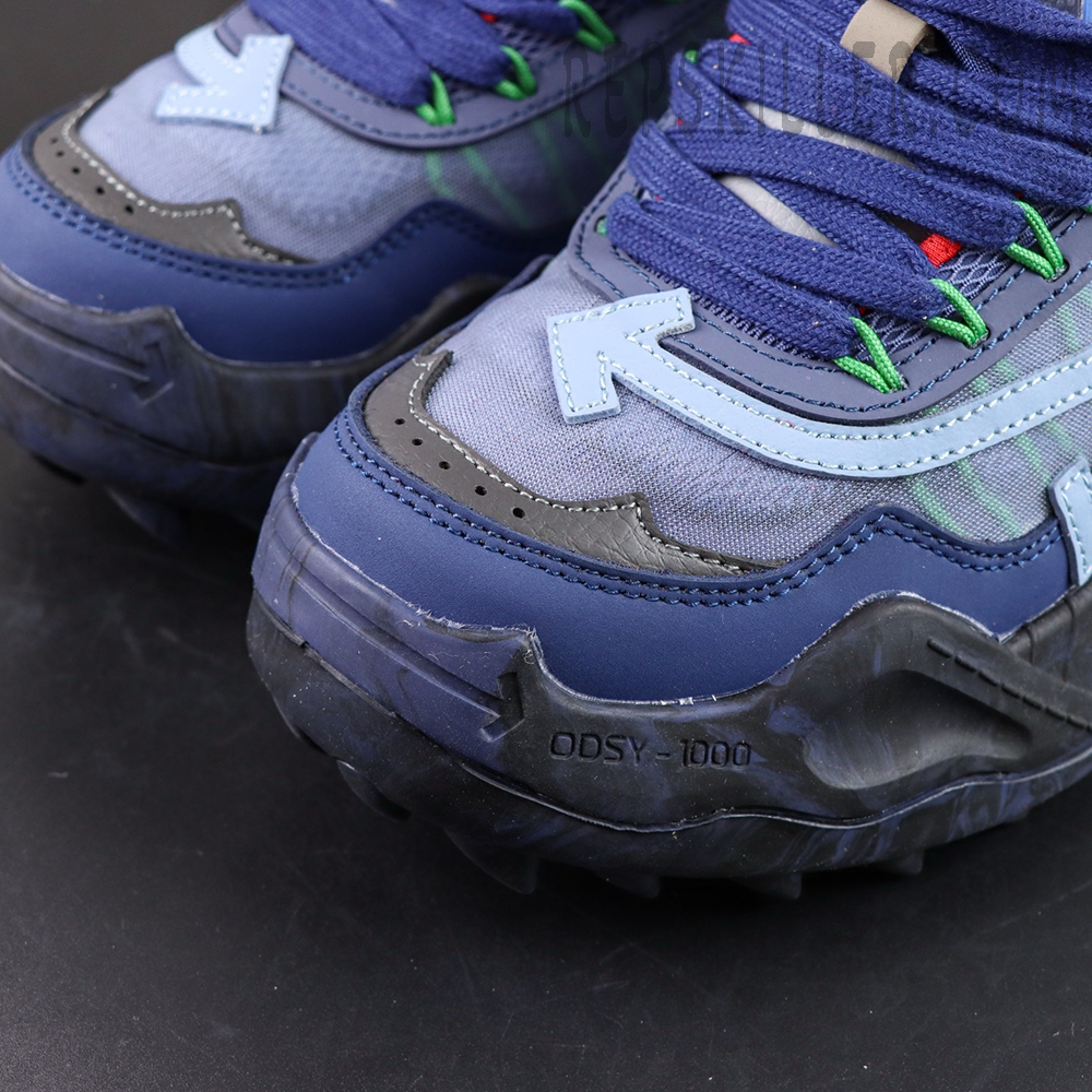 The upper features a layered construction of mesh, leather, and synthetic materials, offering breathability and durability. Shades of deep blue and light blue are contrasted by green lace loops and red inner lining, adding dynamic pops of color. The iconic Off-White Arrow logo appears in a soft blue overlay, seamlessly integrated into the design.
