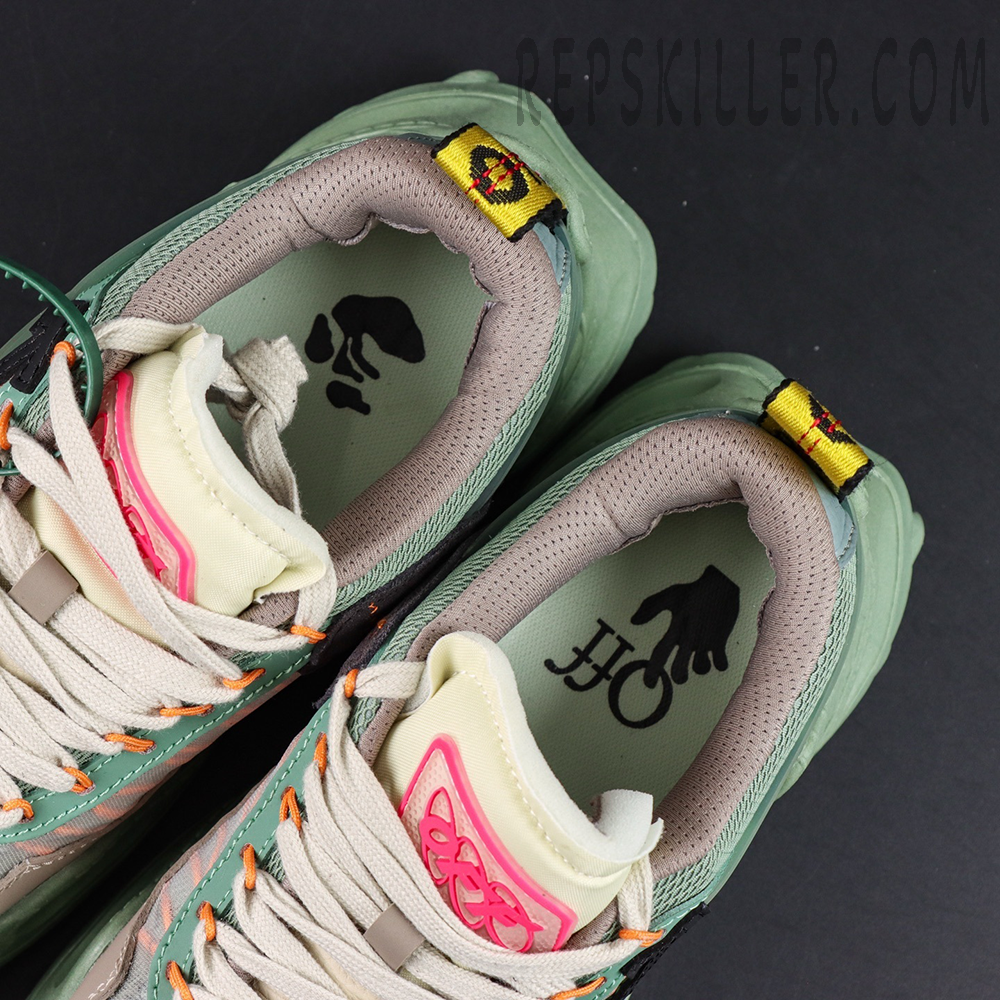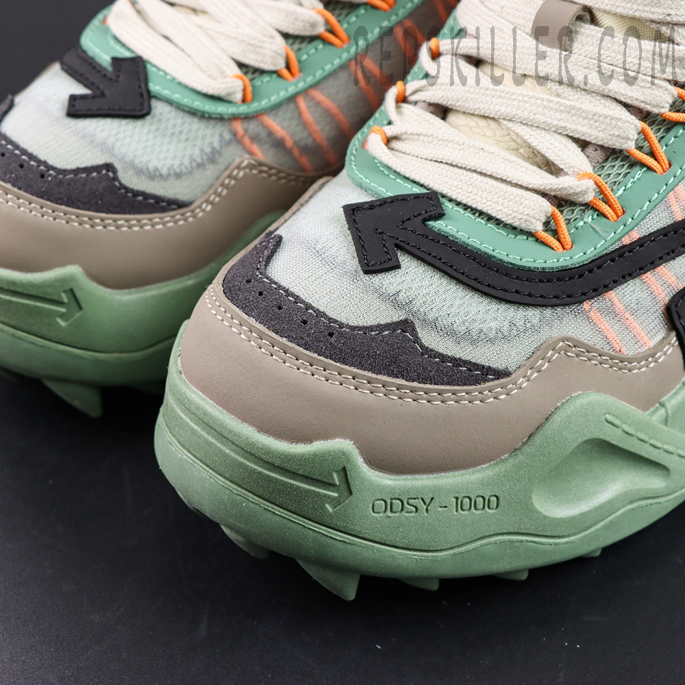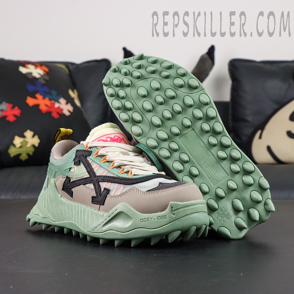 Underfoot, the sneaker is equipped with a chunky sculpted midsole and aggressive spike-textured outsole, offering enhanced grip and a futuristic trail-ready aesthetic. The “ODSY-1000” branding on the midsole completes the look, reinforcing its identity within Off-White’s footwear lineup.