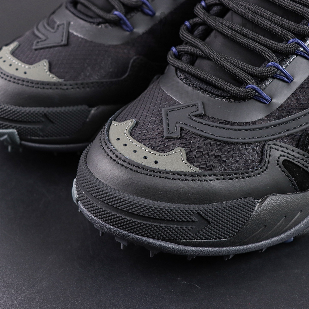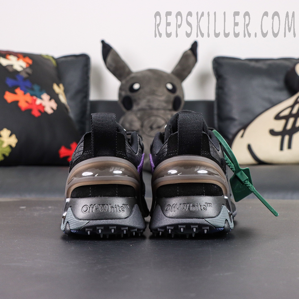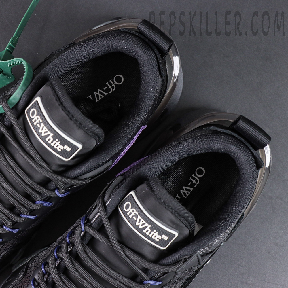 Crafted from a mix of mesh, leather, and synthetic overlays, the upper features subtle texture contrasts and tonal detailing for depth. The iconic Off-White Arrow motif is seamlessly integrated across the side panels, while purple lace accents add a low-key pop of color.
