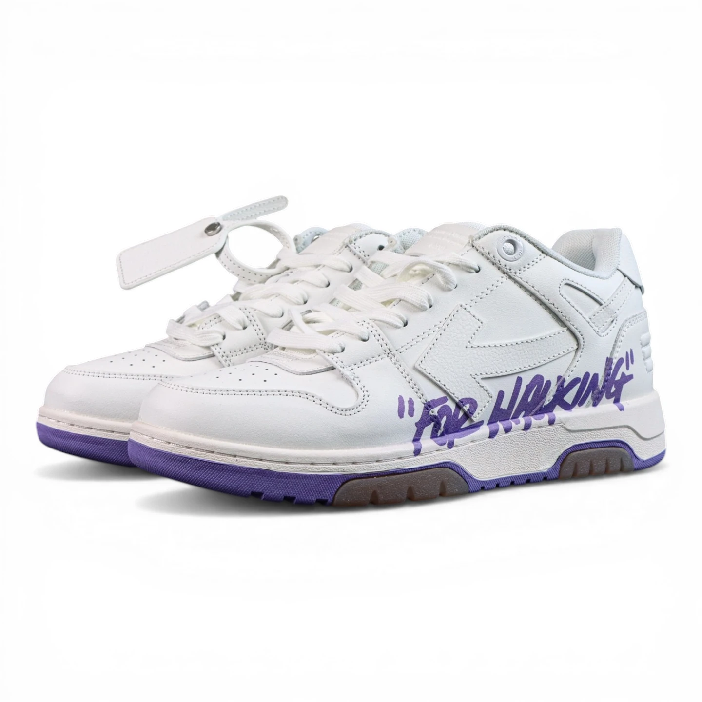 The upper is crafted from premium white leather, delivering a crisp and minimal base. The standout feature is the purple “FOR WALKING” handwritten-style graphic across the lateral midsole, adding a distinctive, street-art inspired edge. Complementing this detail are lilac accents on the outsole, creating a cohesive and eye-catching finish.