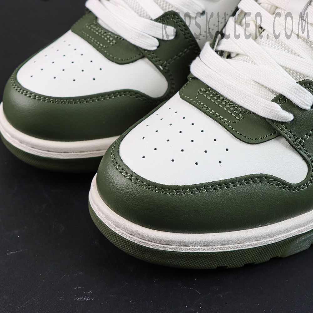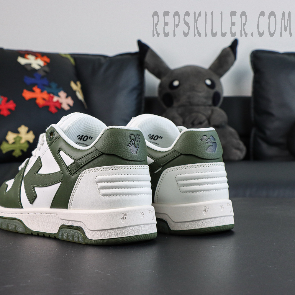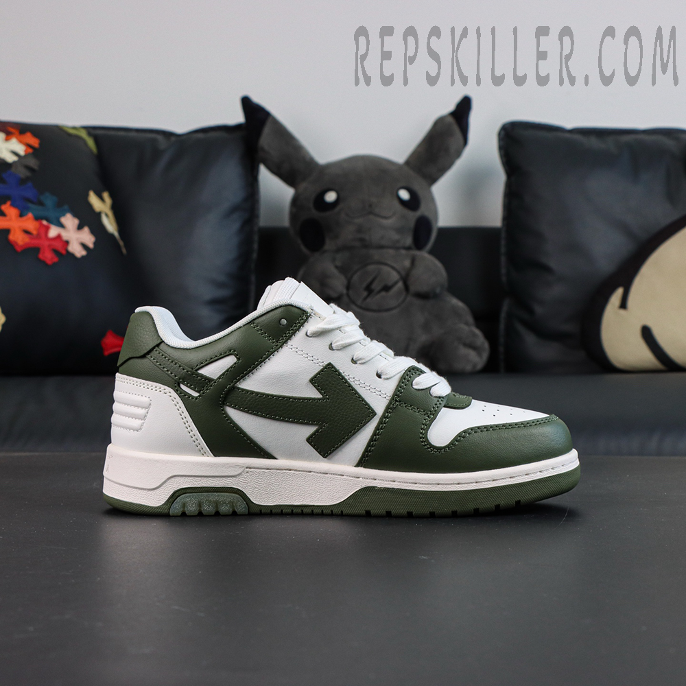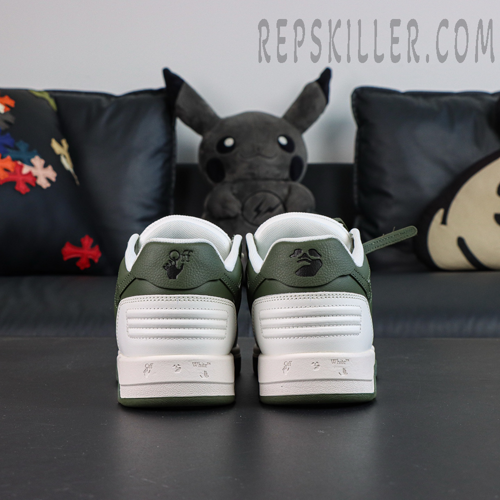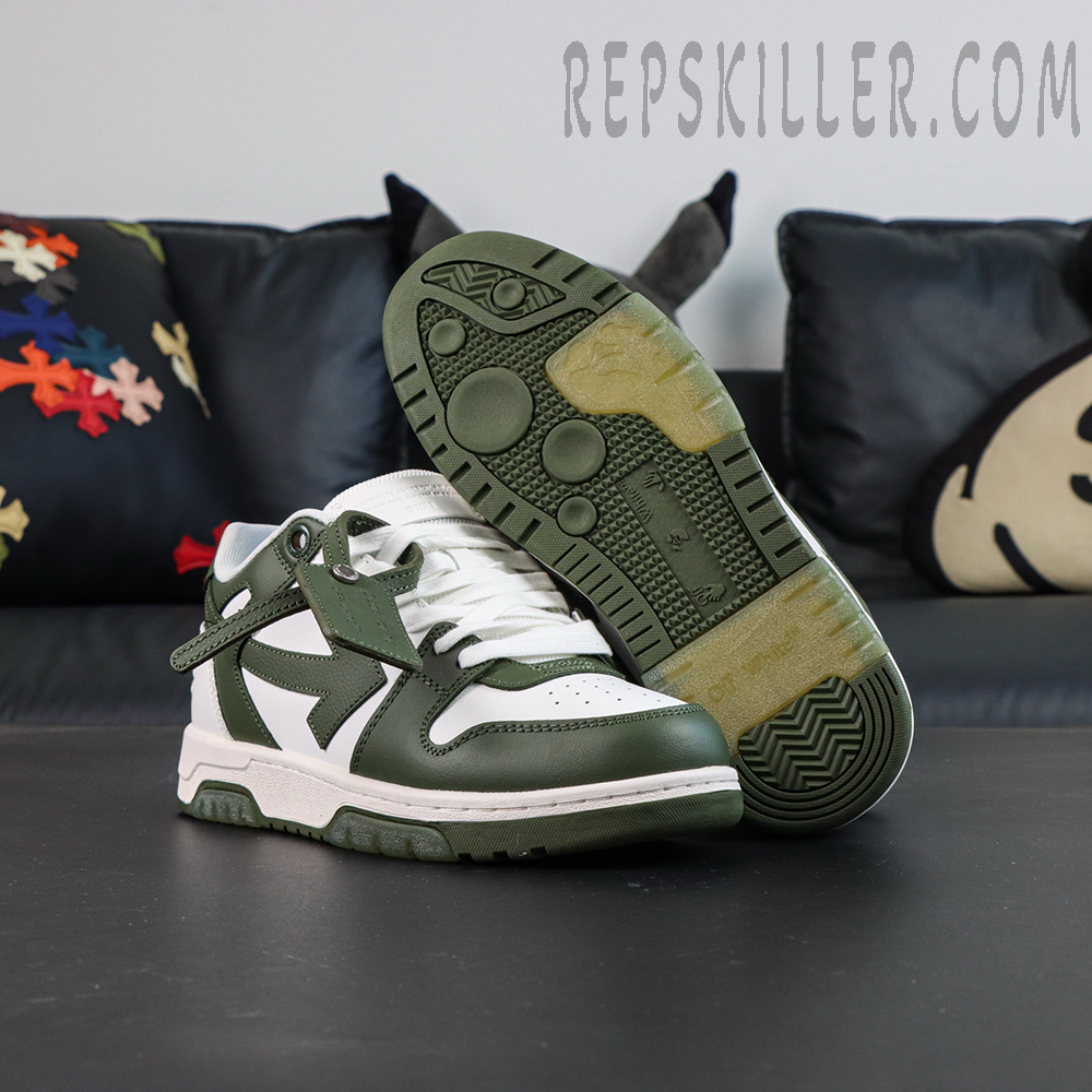 The upper features smooth white leather as the base, contrasted by deep khaki green overlays on the mudguard, eyelets, heel, and signature arrow logo. This earthy tone adds a refined, military-inspired edge while keeping the overall look wearable and understated. The layered panel construction enhances depth and gives the sneaker its signature Off-White identity.