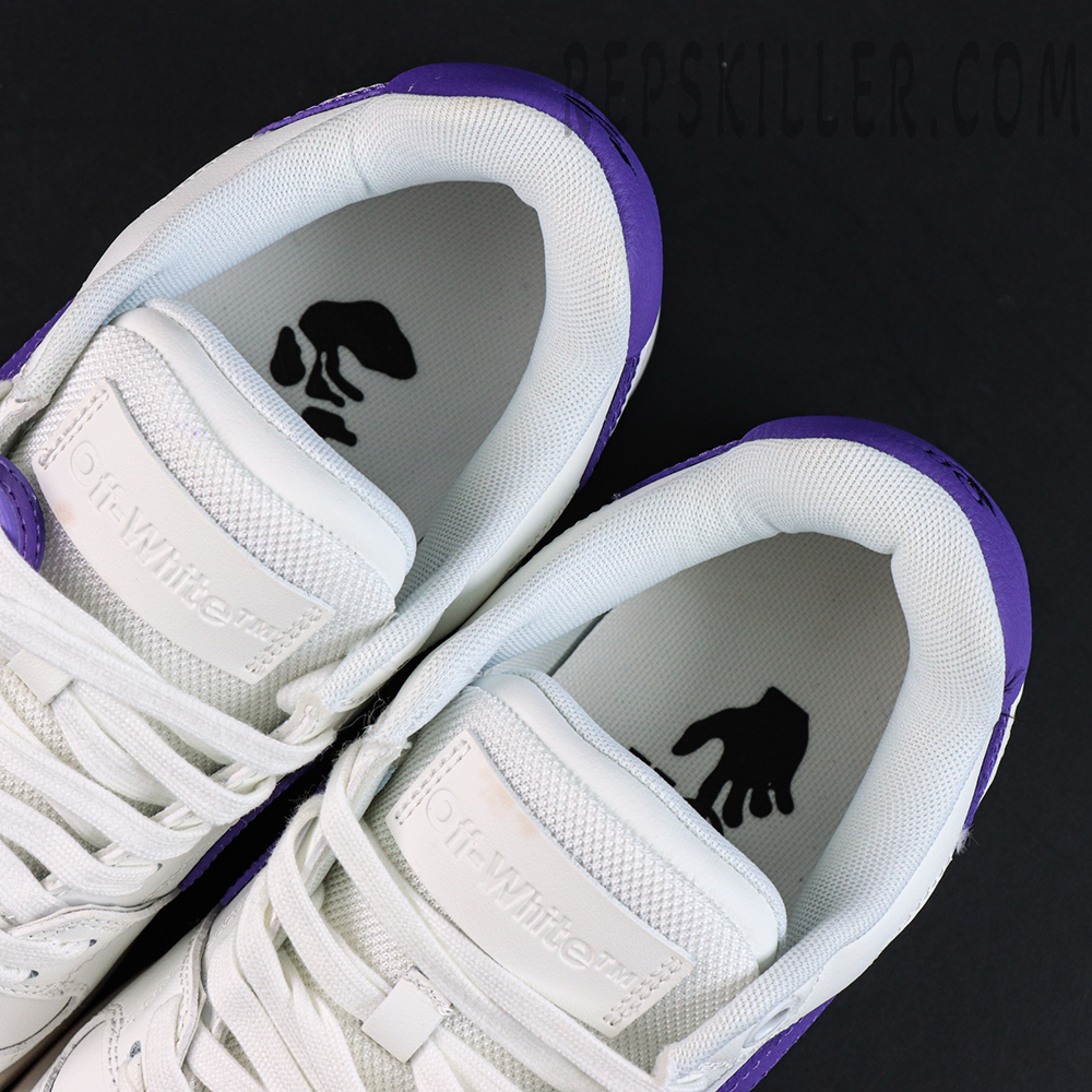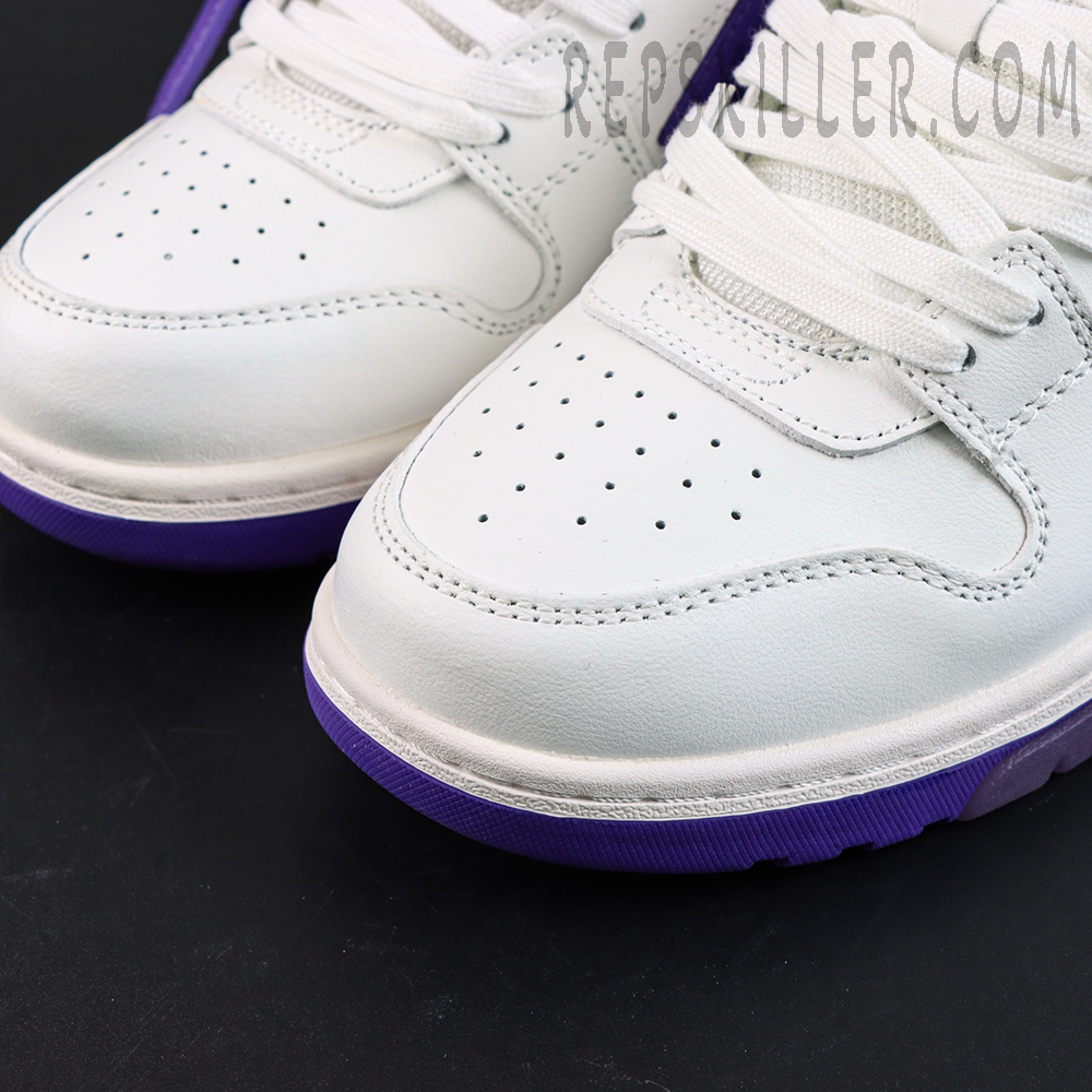 The upper is crafted from premium white leather, providing a crisp foundation that’s accented by deep dark purple overlays on the arrow logo, heel, and outsole details. This rich tone adds a strong visual contrast, giving the sneaker a more refined yet statement-driven look. Signature Off-White elements, including layered paneling and zip-tie detailing, complete the design.