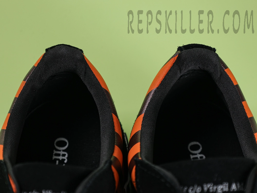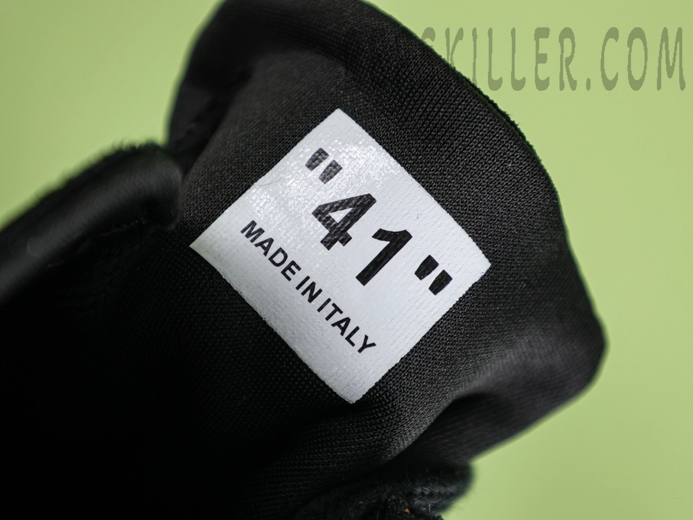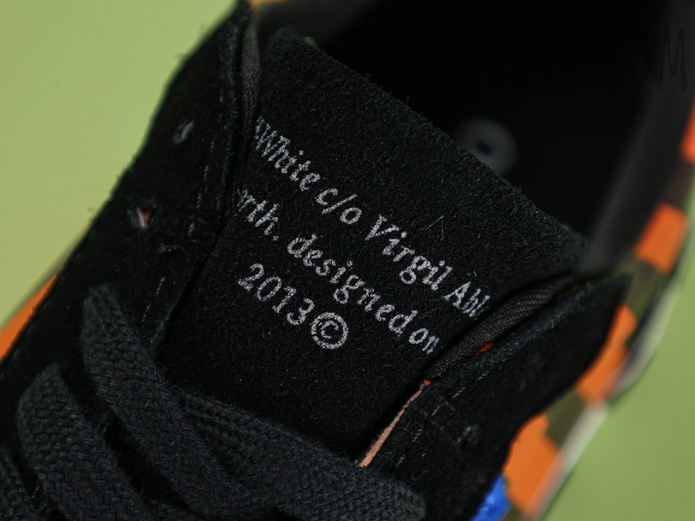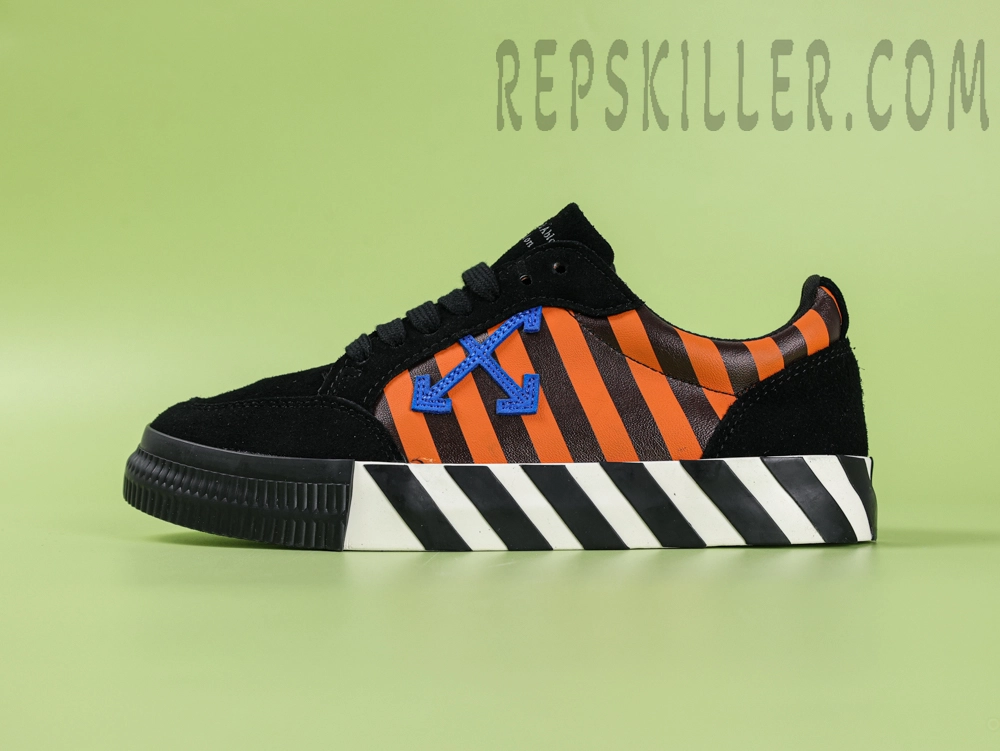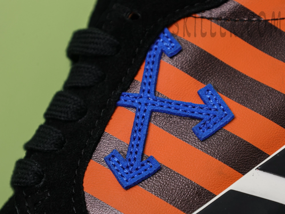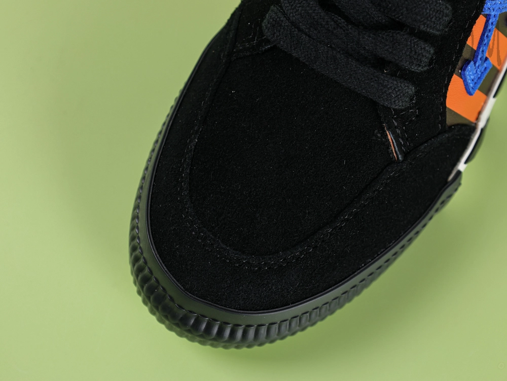 The Off-White Vulc Sneaker ‘Black Orange’ redefines skate-inspired streetwear with a signature industrial edge. This low-top model features a canvas and suede upper, highlighted by vibrant orange and black diagonal stripes on the side panel, contrasted by a blue embroidered arrow logo for bold visual impact. The black suede overlays add texture and durability, while the striped midsole in black and white injects Off-White’s unmistakable design language. A rubber outsole with classic herringbone tread offers grip and stability to this statement-ready silhouette.