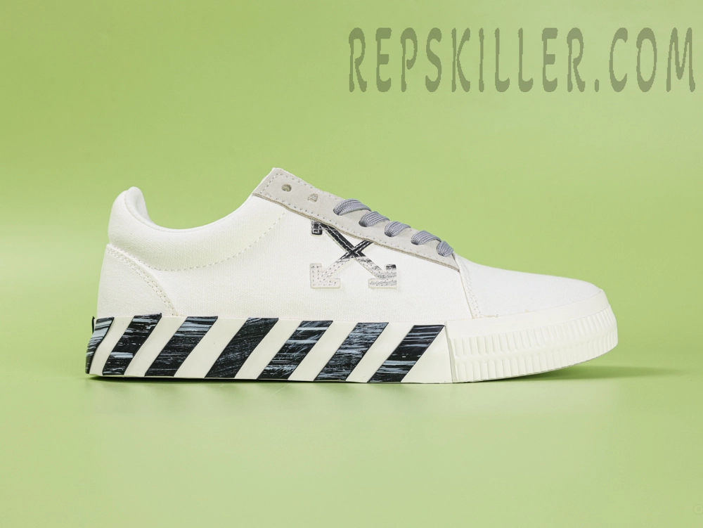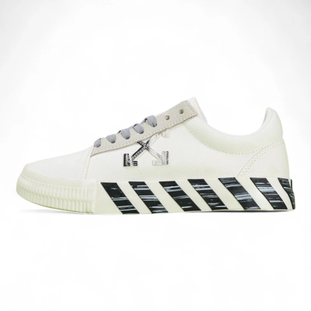 The Off-White Wmns Vulc Sneaker ‘White Black’ offers a clean yet unmistakably industrial look tailored for women. This low-top silhouette features a white canvas upper contrasted by a stitched black arrow logo and light grey suede eyestay, adding subtle structure and dimension. The black-and-white diagonal striped rubber midsole infuses the sneaker with Off-White’s iconic visual language, while a textured rubber outsole with a reinforced toe cap ensures day-to-day durability. A minimalist yet statement-making piece for the modern streetwear wardrobe.