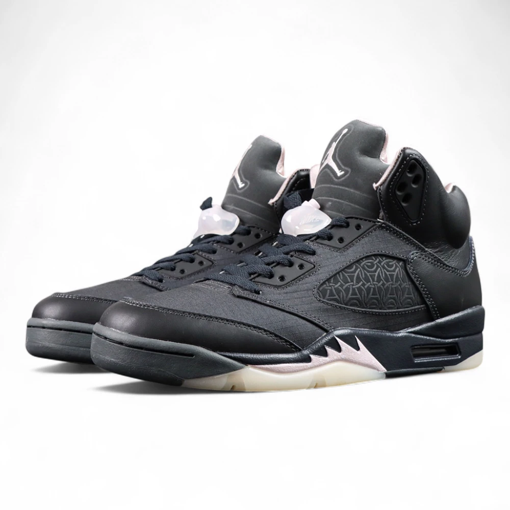 The Paris Saint-Germain x Air Jordan 5 Retro ‘Off Noir’ merges classic Jordan heritage with Parisian sophistication. The upper features Off-Noir ripstop textile paired with black tumbled leather overlays, while translucent lace locks and reflective tongues retain signature AJ5 DNA. A tonal PSG crest replaces the traditional netting, adding club exclusivity to the design. Pink accents on the midsole’s shark teeth and insole branding introduce subtle contrast, while a translucent outsole provides modern traction. “Paname” text appears on the forefoot tag— a nod to the city of Paris.