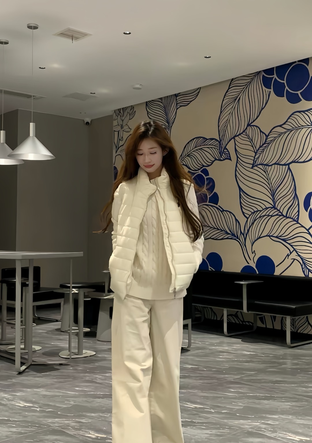 The vest features a precision quilted design with evenly spaced rib-style stitching to stabilize the insulation and minimize puffiness. A subtly tailored waist enhances the feminine silhouette while maintaining freedom of movement, making it ideal for layered outfits.