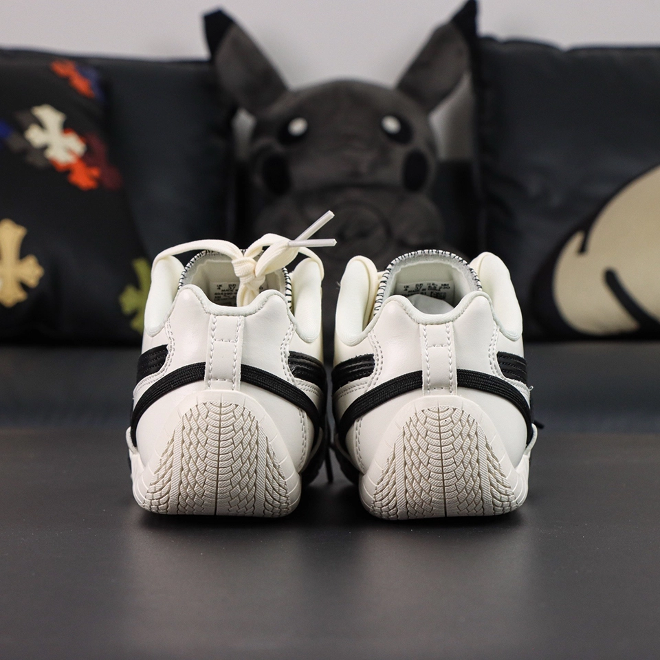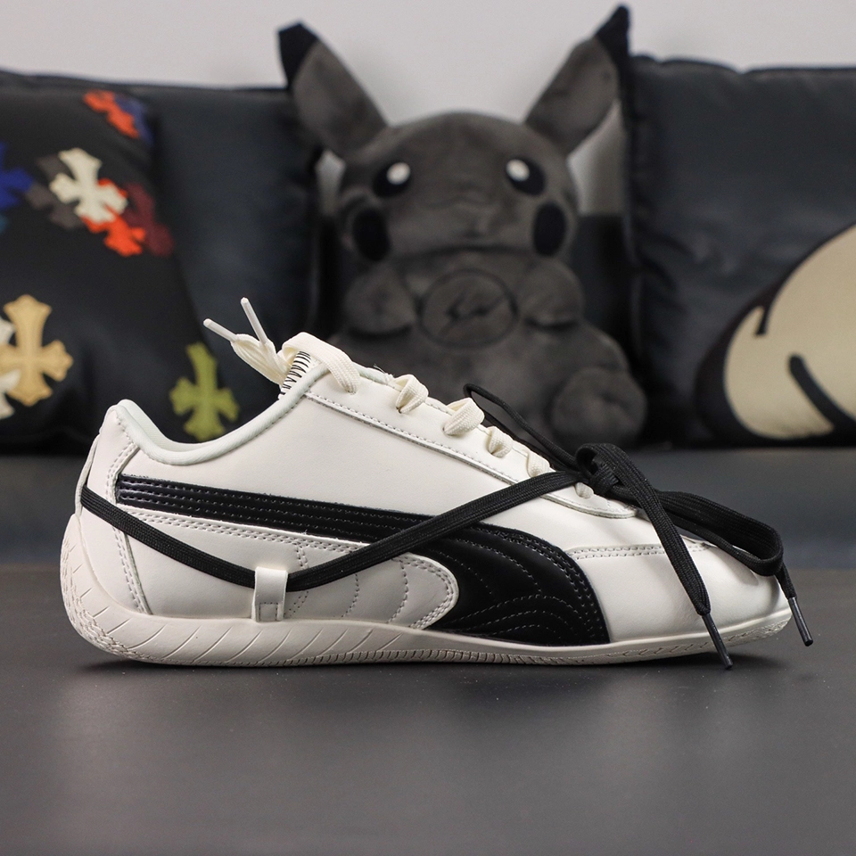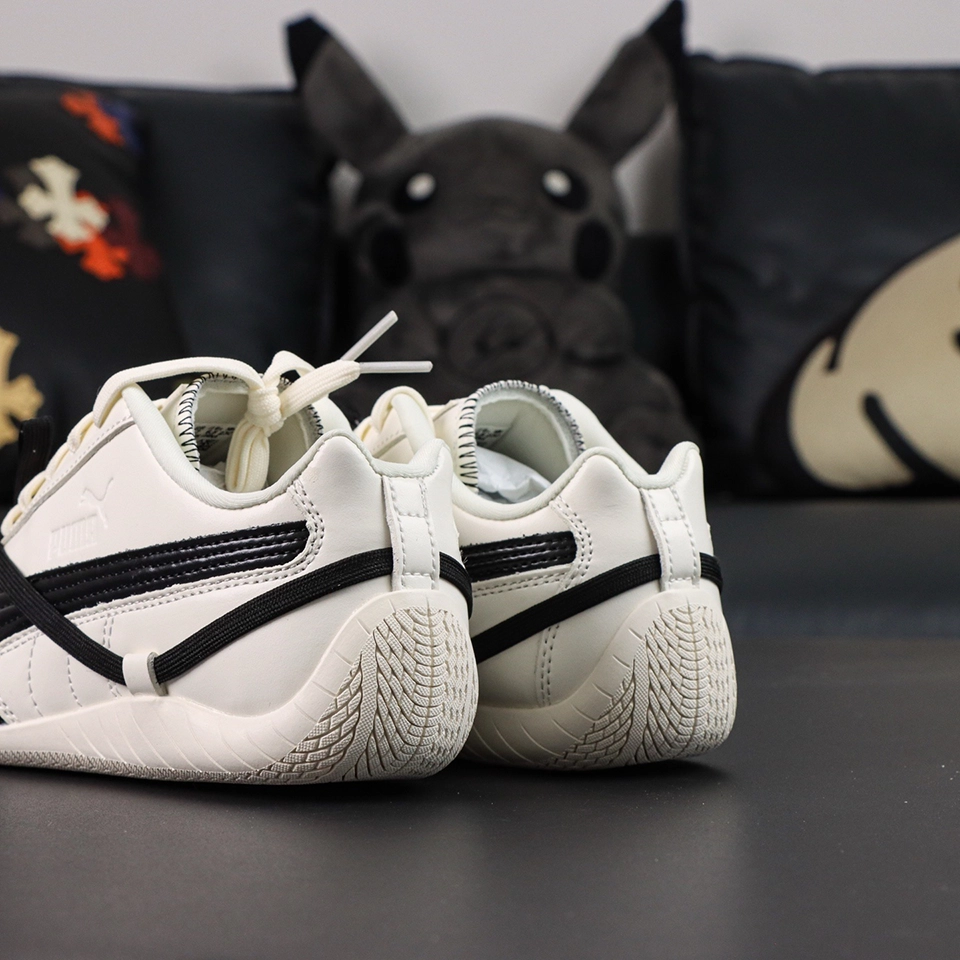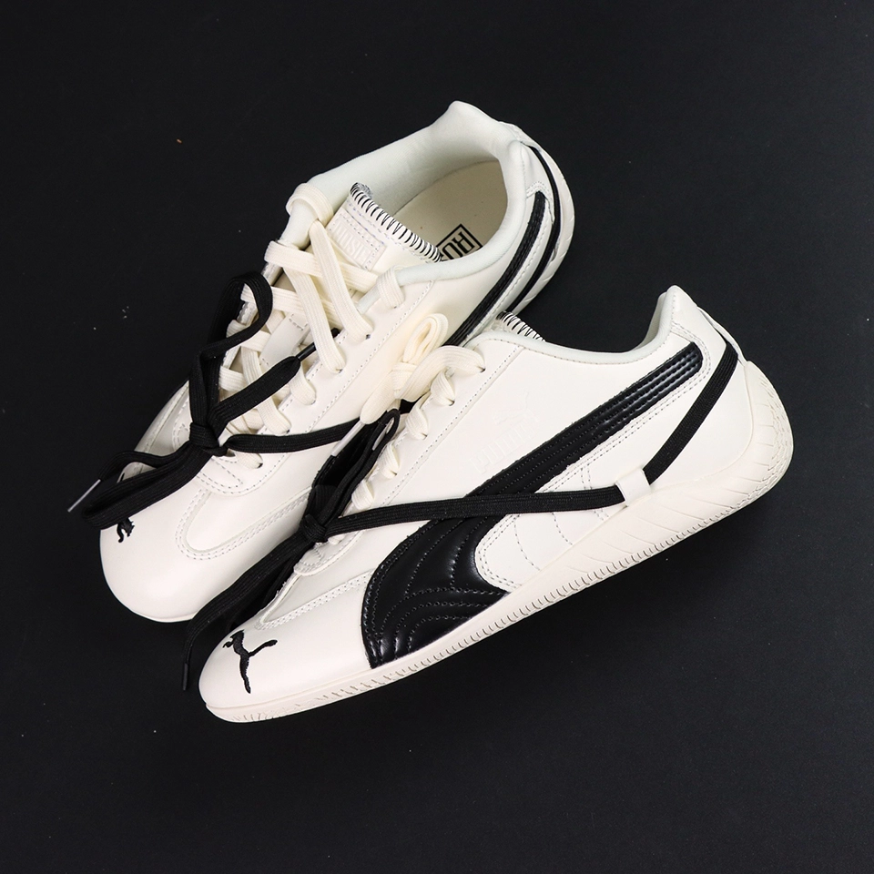 The Rosé x Wmns Speedcat Premium ‘Warm White’ is a bold reinterpretation of PUMA’s race-inspired silhouette, infused with refined feminine flair. Dressed in a soft off-white leather upper, the shoe features a contrasting black Formstrip and an unconventional wraparound lacing system that ties elegantly at the forefoot. An embossed dual-brand tag sits on the tongue, while the zigzag stitching adds visual texture. Finished with a streamlined rubber sole, this low-profile design delivers everyday style with a high-fashion twist.