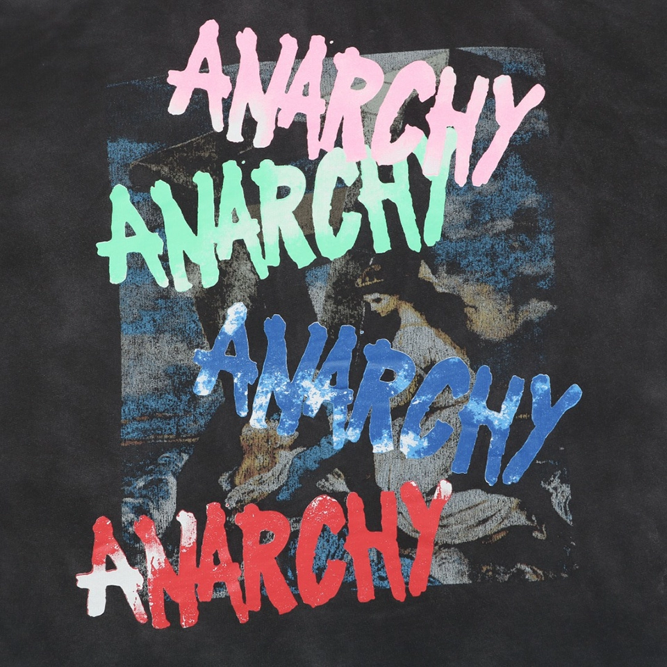 The Saint Michael Anarchy Madonna Distressed Printed Hoodie showcases the brand’s signature fusion of religious iconography and rebellious street aesthetics. Featuring a bold “Anarchy” Madonna graphic, this hoodie delivers strong visual impact through carefully engineered vintage distressing techniques.