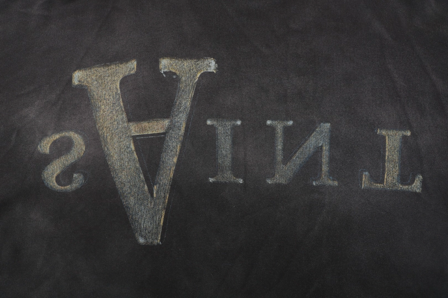 The back graphic is produced using a special crack-print technique. After high-temperature curing and cooling, the print naturally develops fine fractures. A secondary wash further distresses the artwork, resulting in partial fading and irregular wear that enhances the aged aesthetic.
