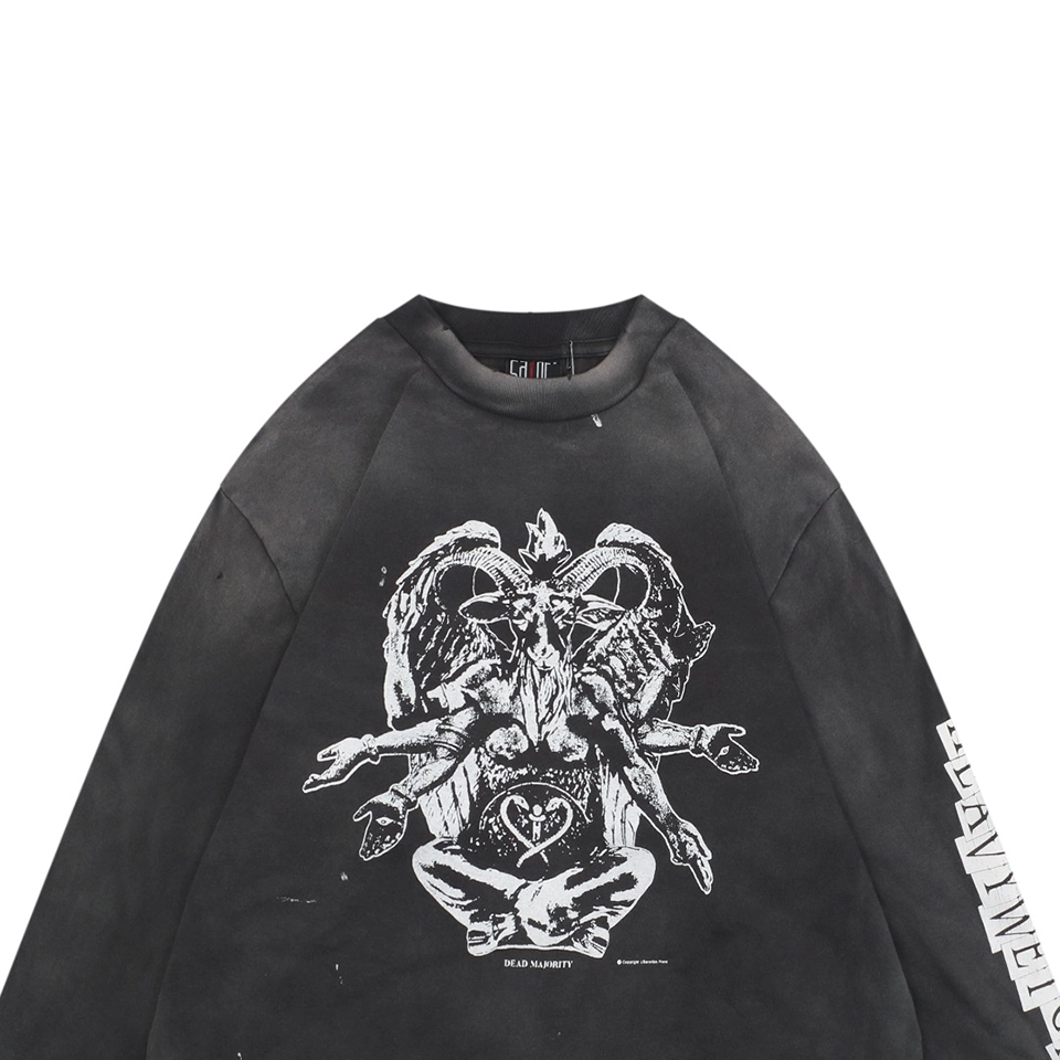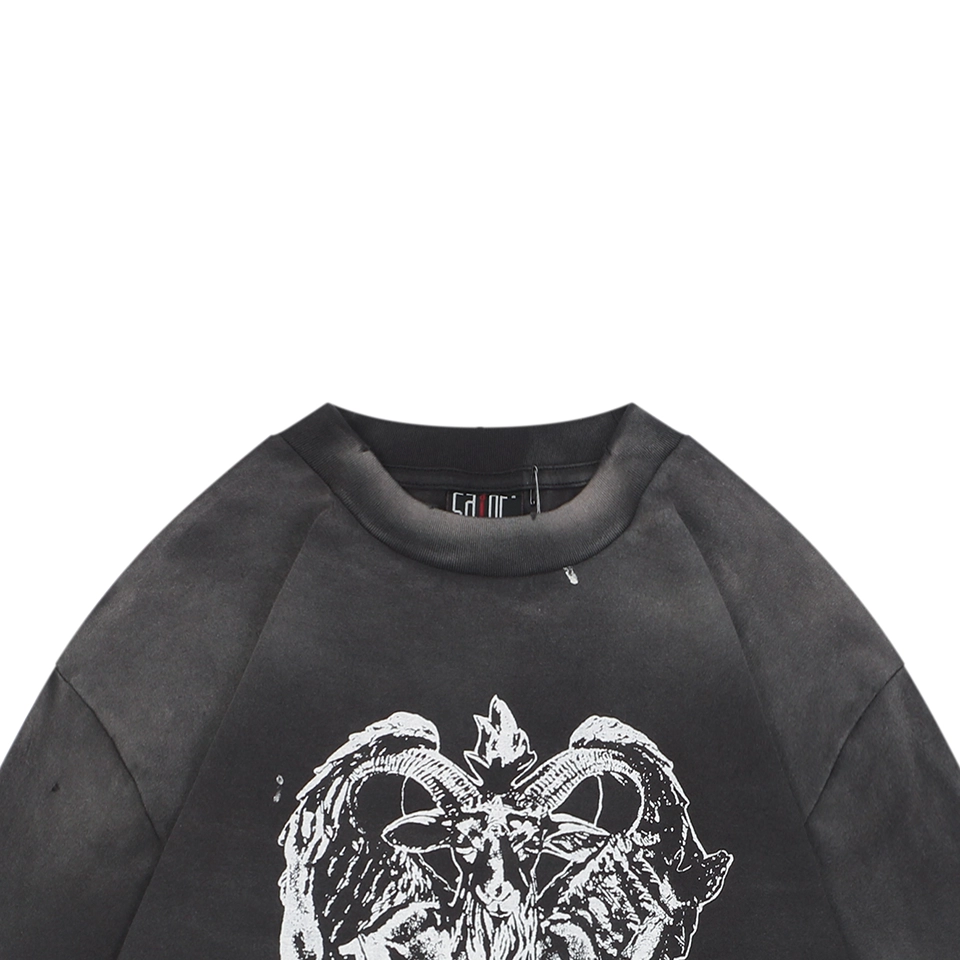 The Saint Michael Baphomet Devil Graphic Distressed Shirt is crafted from 260g 100% cotton with a 16s double-yarn French terry structure, woven on a tubular knitting machine with zero side seams for enhanced comfort and a more authentic vintage fit. The garment undergoes Asuté dyeing and KMnO₄ spray fading, creating a signature Saint Michael aged finish with natural-looking frost-like gradients. The large Baphomet graphic is printed using high-precision imported digital direct-injection machines, delivering sharp detail, accurate color separation, and long-lasting durability protected by a clear coating layer. Hand-applied distressing, including collar and cuff grinding and multiple tear marks, recreates authentic high-end vintage wear. Completed with heritage single-needle hem stitching and full custom branding, this oversized long sleeve is a standout high-street piece with strong visual impact.