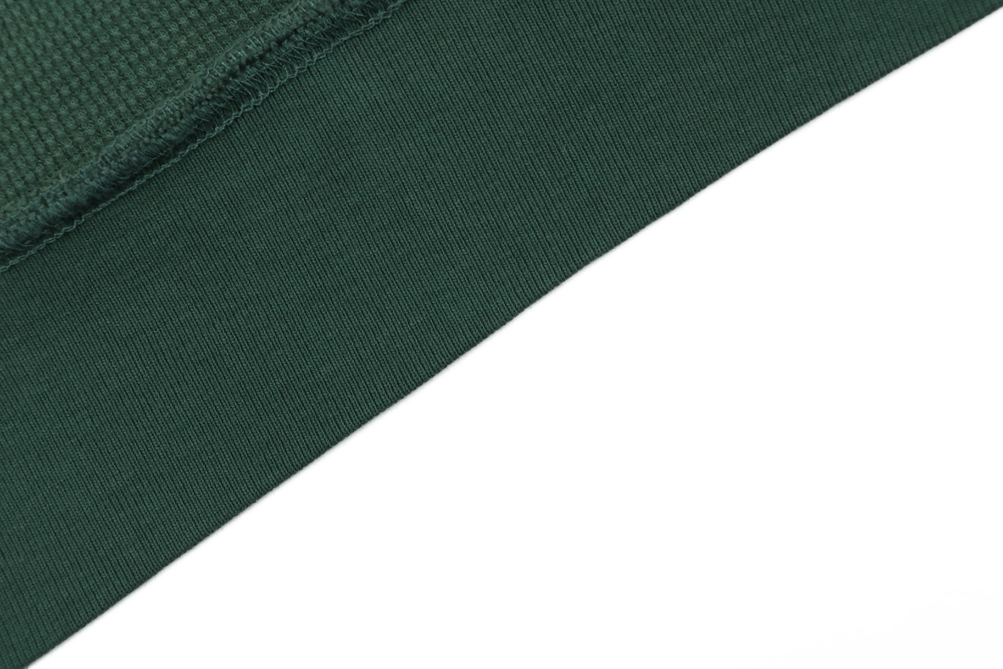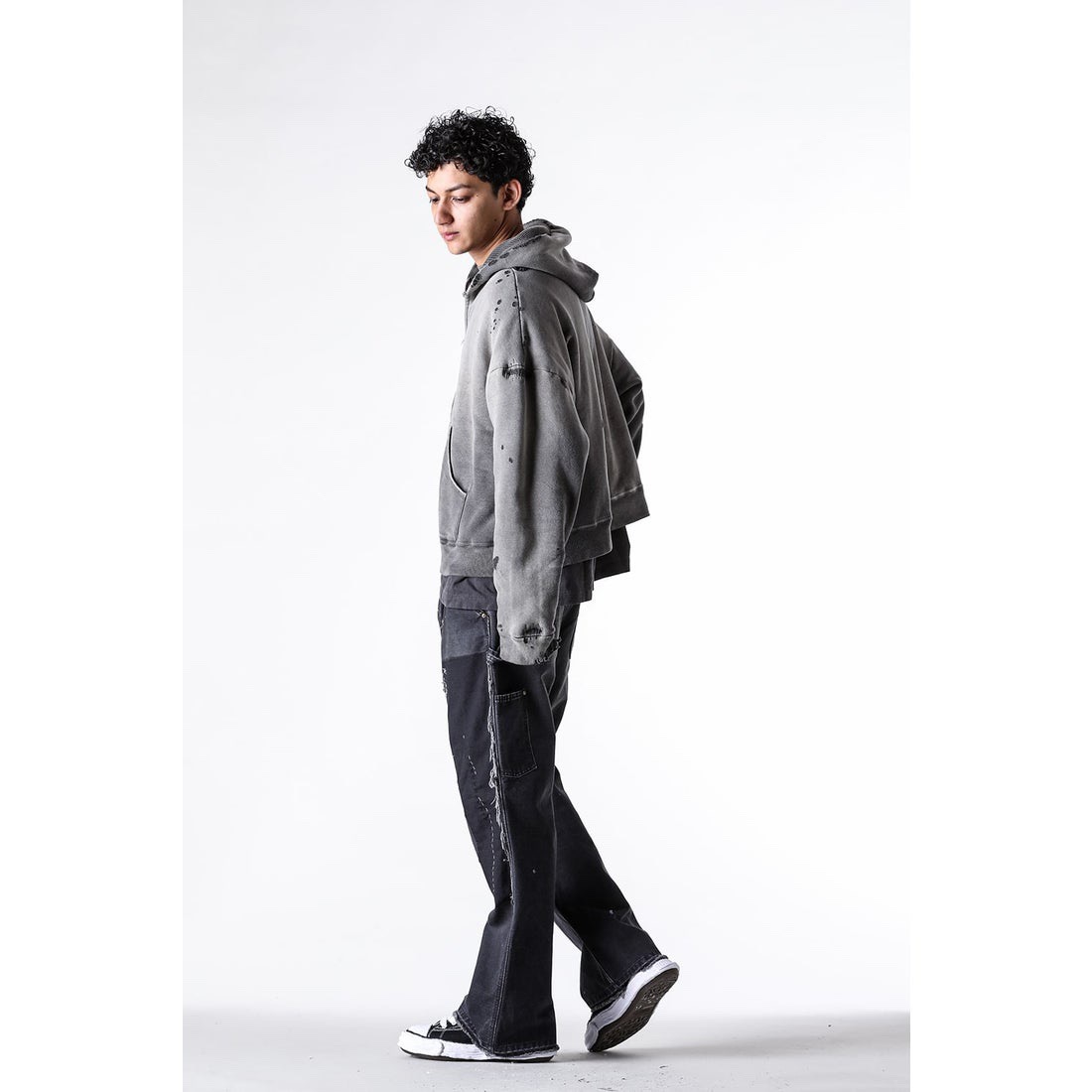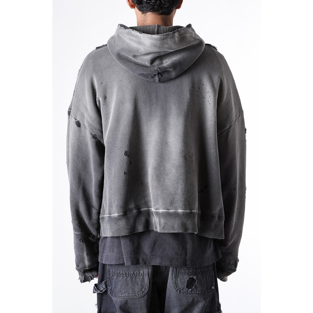 Crafted from heavyweight cotton waffle fabric, the hoodie offers a structured yet comfortable feel. The fabric undergoes extensive washing and fade treatments, creating natural tonal variations and a time-worn appearance that enhances depth and character.
