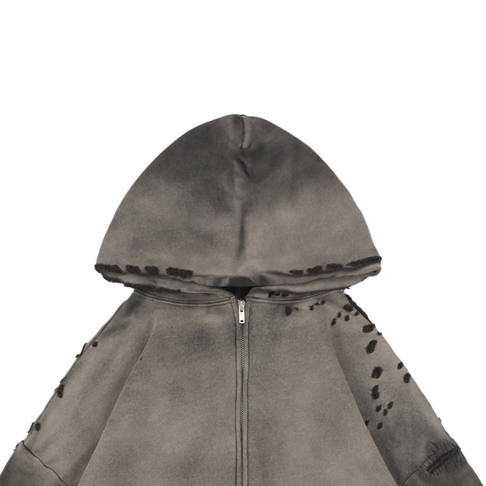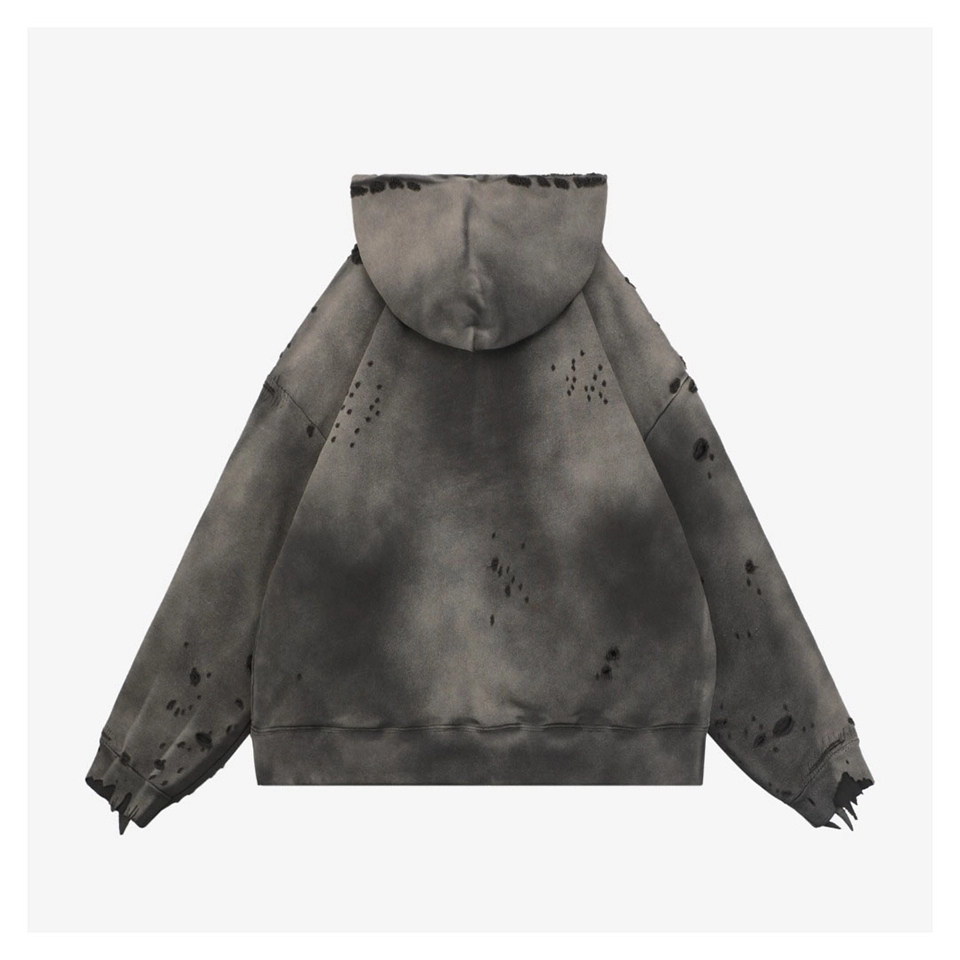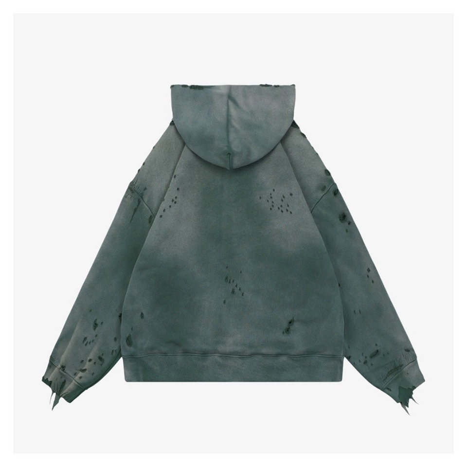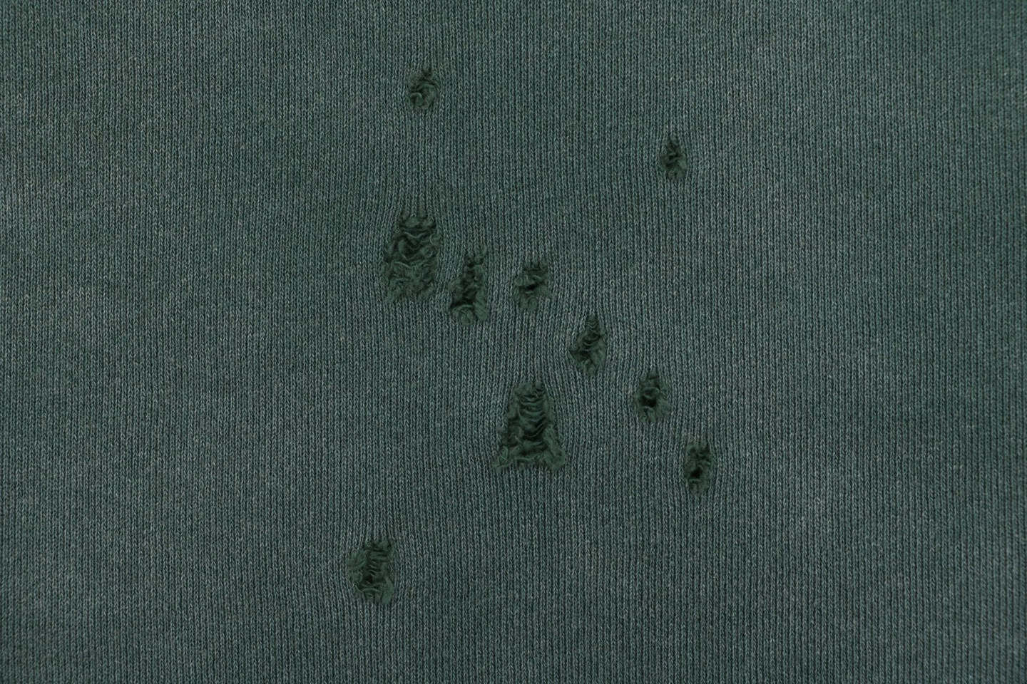 Intricate hand-distressed holes are carefully placed throughout the garment, delivering an authentic aged effect without compromising wearability. Deconstructed embroidery elements further elevate the design, balancing raw texture with refined craftsmanship.