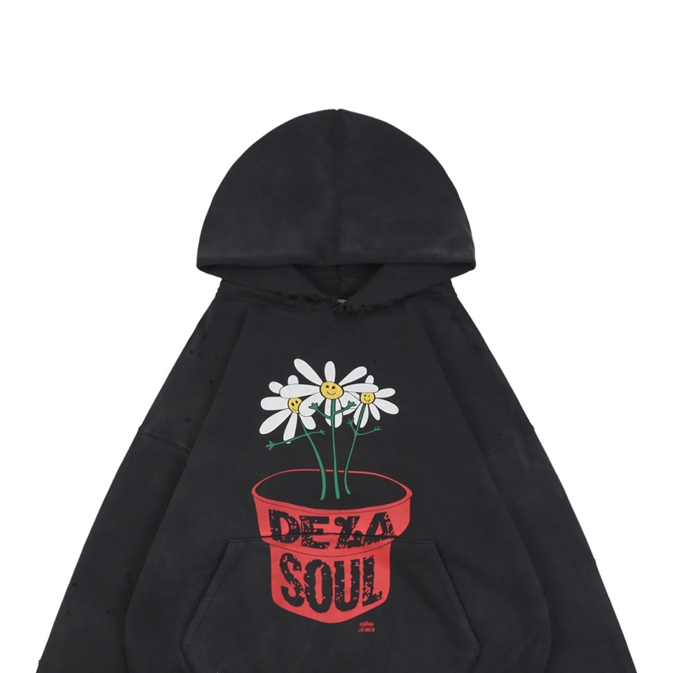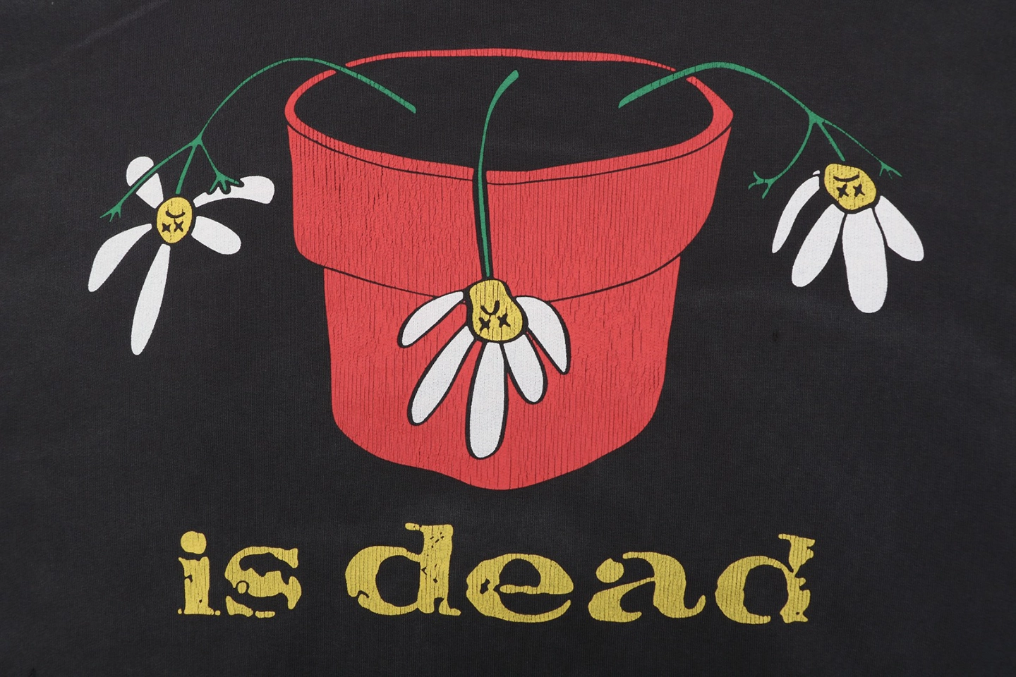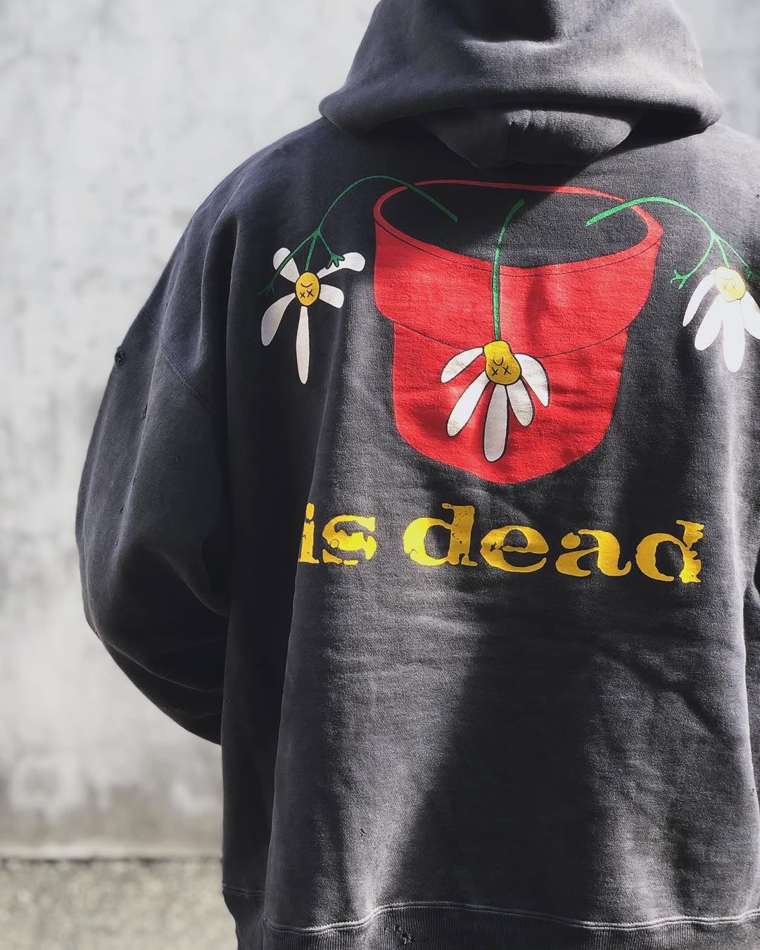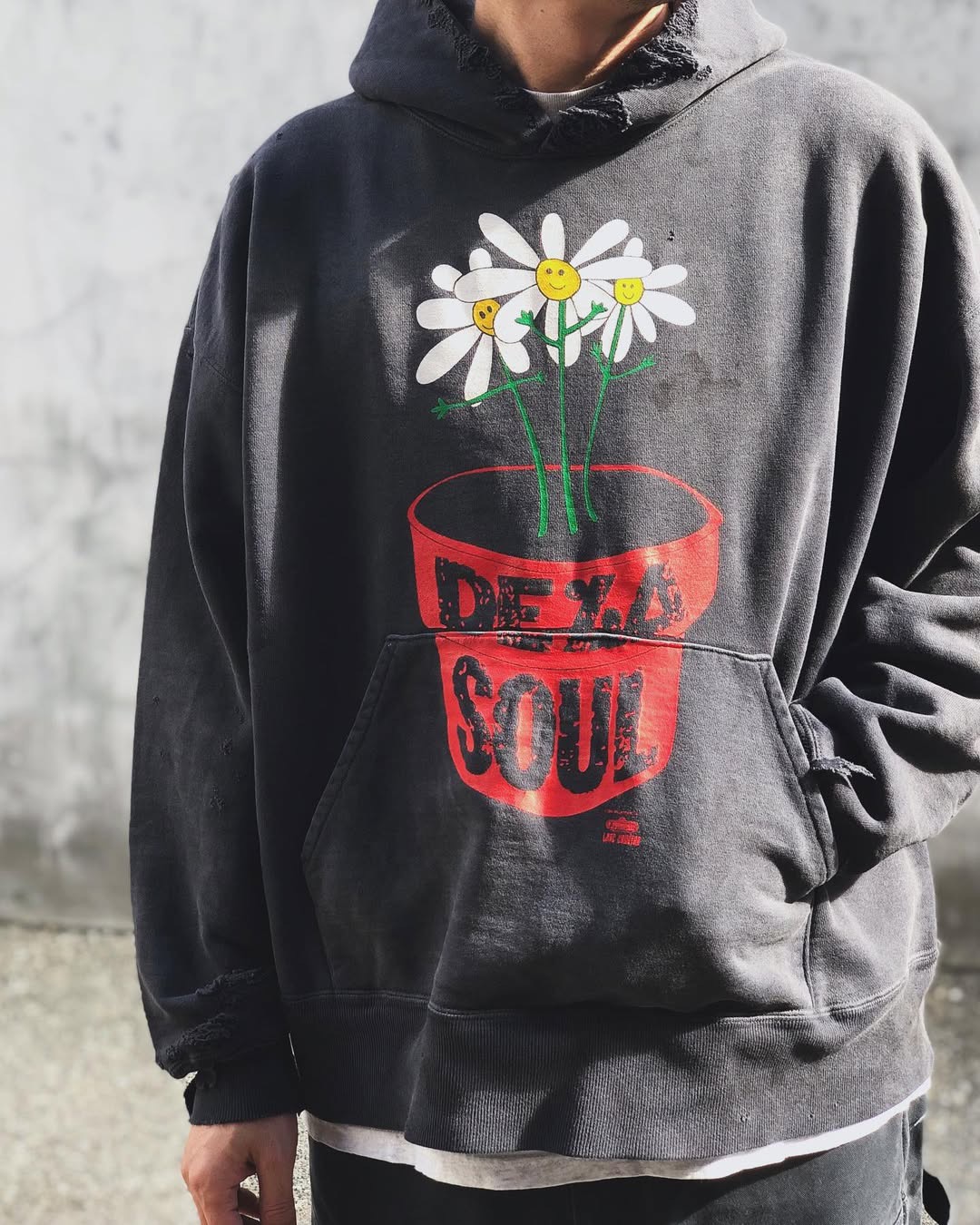The Saint Michael Distressed Potted Flower Graphic Hoodie blends the brand’s signature religious undertones with heavy vintage distressing, delivering a bold statement piece rooted in contemporary street culture.