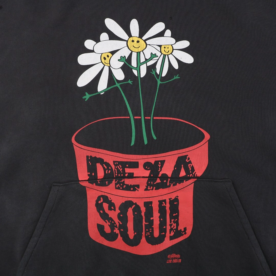 The standout potted flower graphic serves as a symbolic representation of life and expression growing from street culture, paired with playful De La Soul text elements. A washed-print technique ensures the graphics maintain a vintage look while remaining soft to the touch.