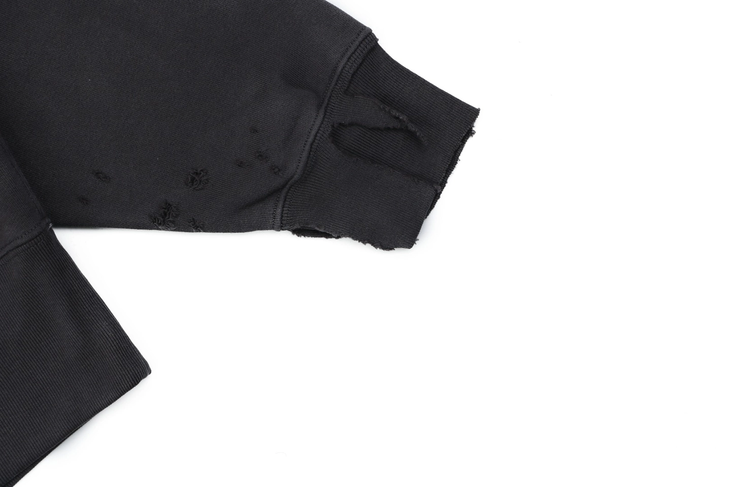 Finished with extensive distressing through potassium spray and snow wash processes, the hoodie features authentic wear effects along the cuffs and hem. Designed with a relaxed silhouette based on original pattern data, it offers both comfort and visual impact. Complete with correct collaborative labels, this hoodie stands as a wearable art piece for fall and winter styling.