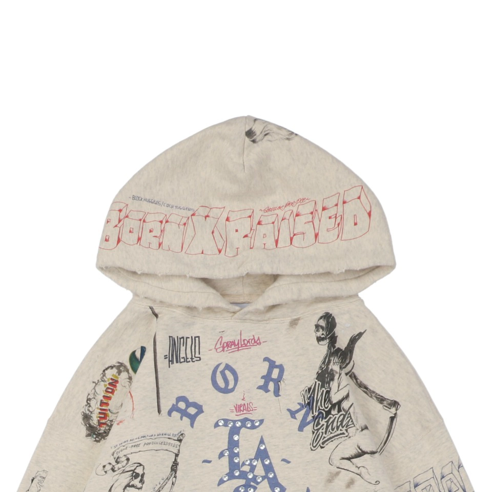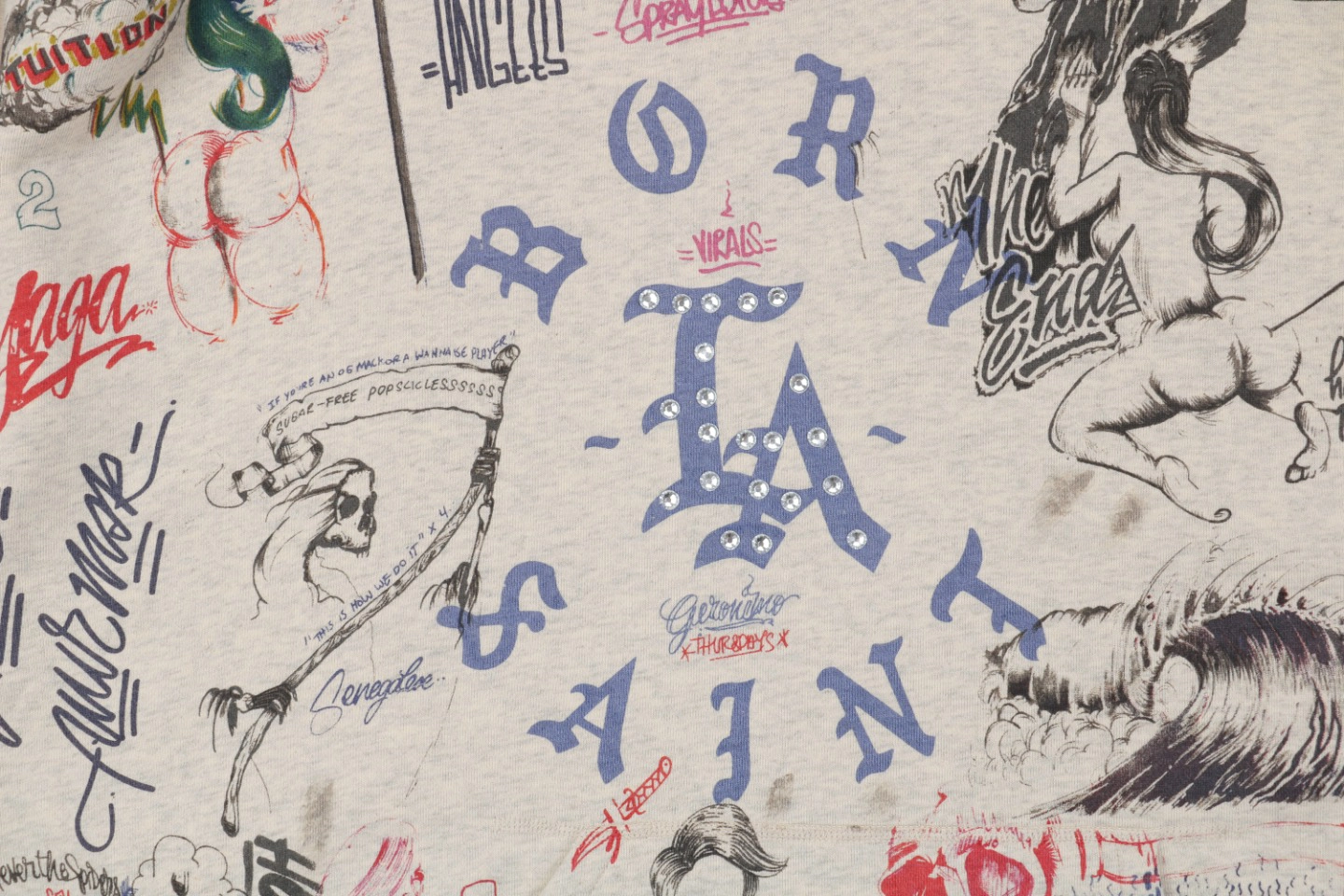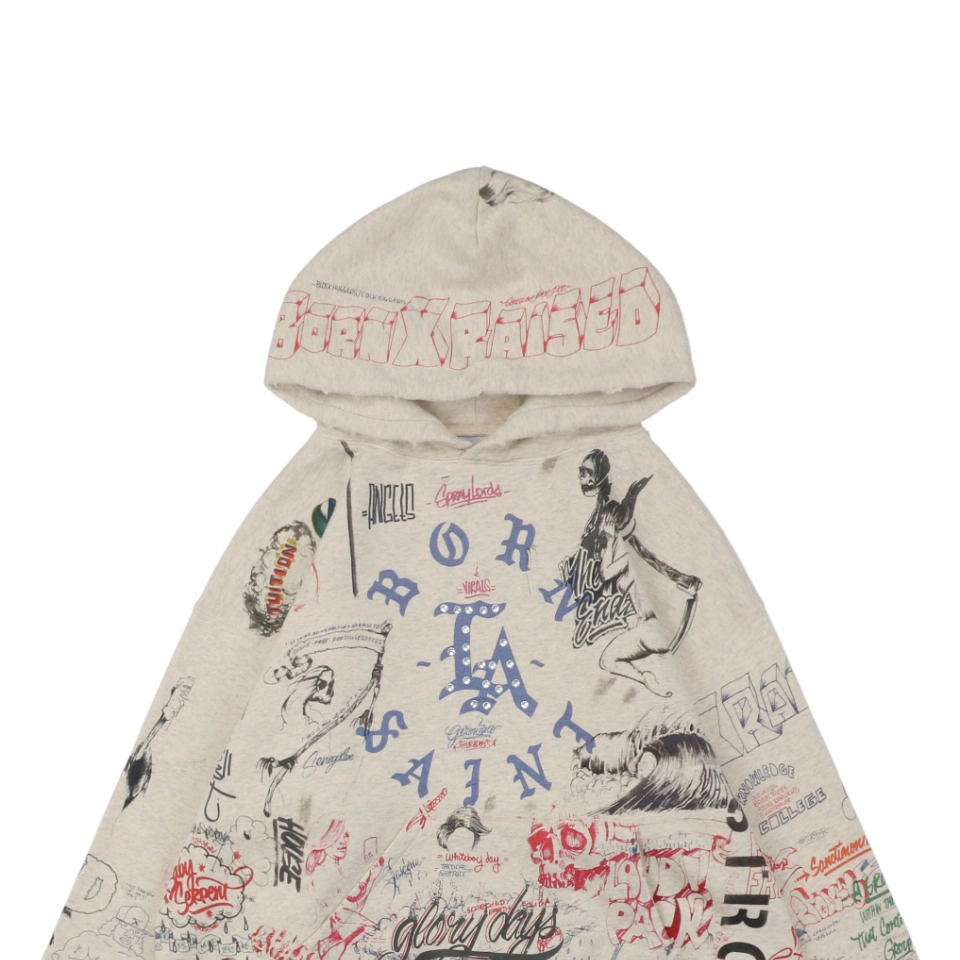 The Saint Michael LA Diamond Allover Graffiti Hoodie features a bold mix of West Coast-inspired typography, classic tattoo motifs, and rebellious street aesthetics. Set on a washed cream base, the hoodie is covered with vibrant graphic prints, “BORN X RAISED” embroidery on the hood, and striking palm tree and skull visuals. Ribbed cuffs and hem provide a snug fit, while the oversized silhouette ensures effortless street style.