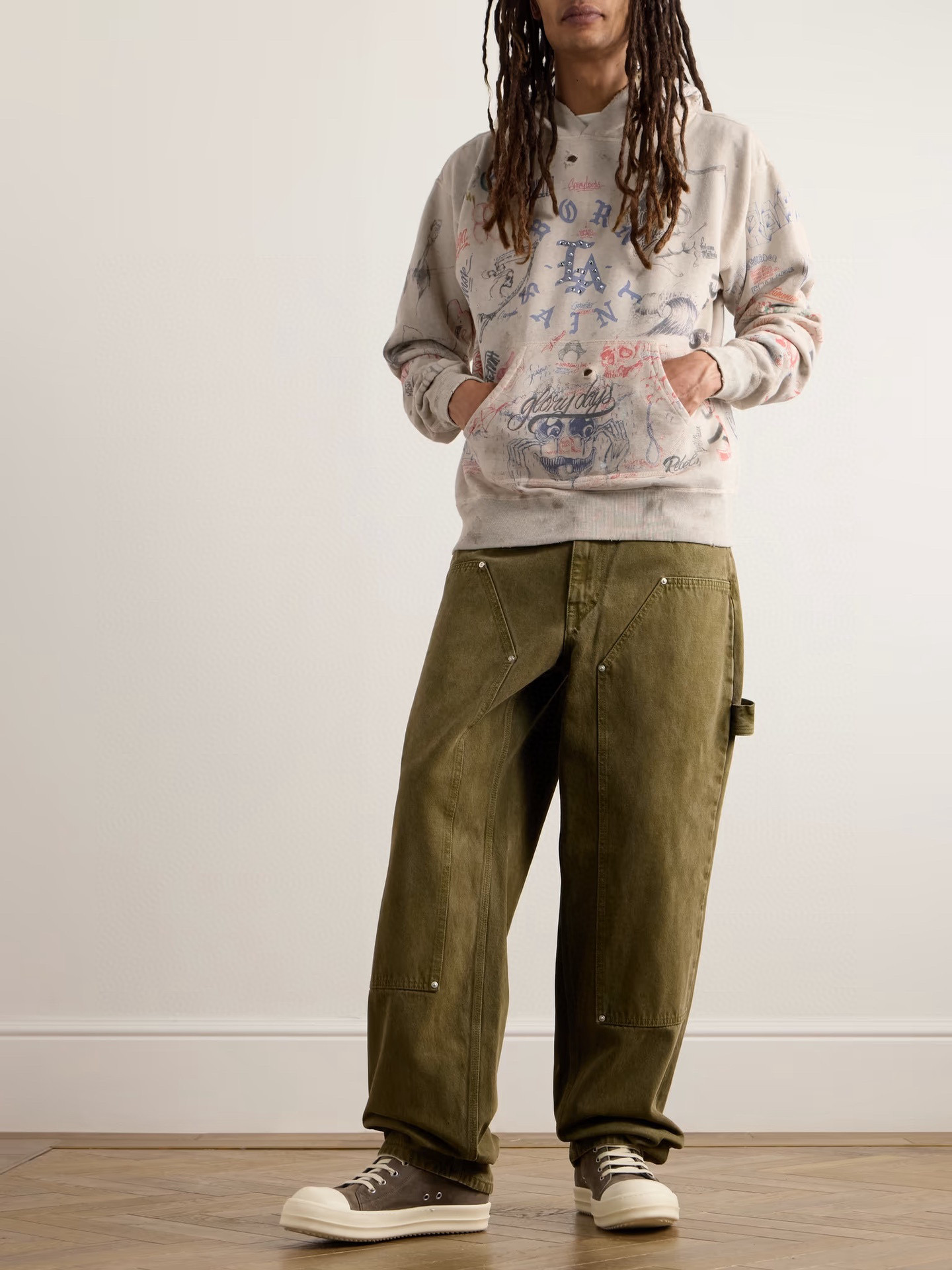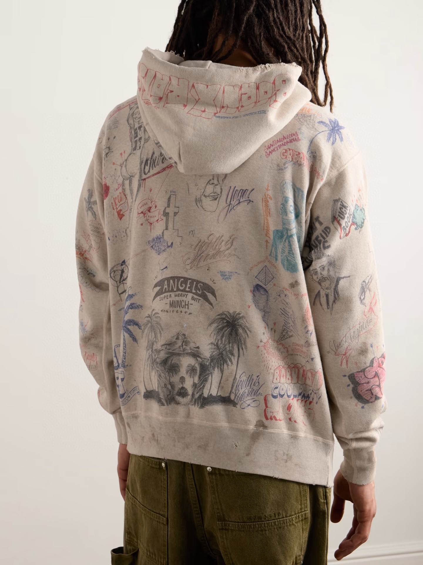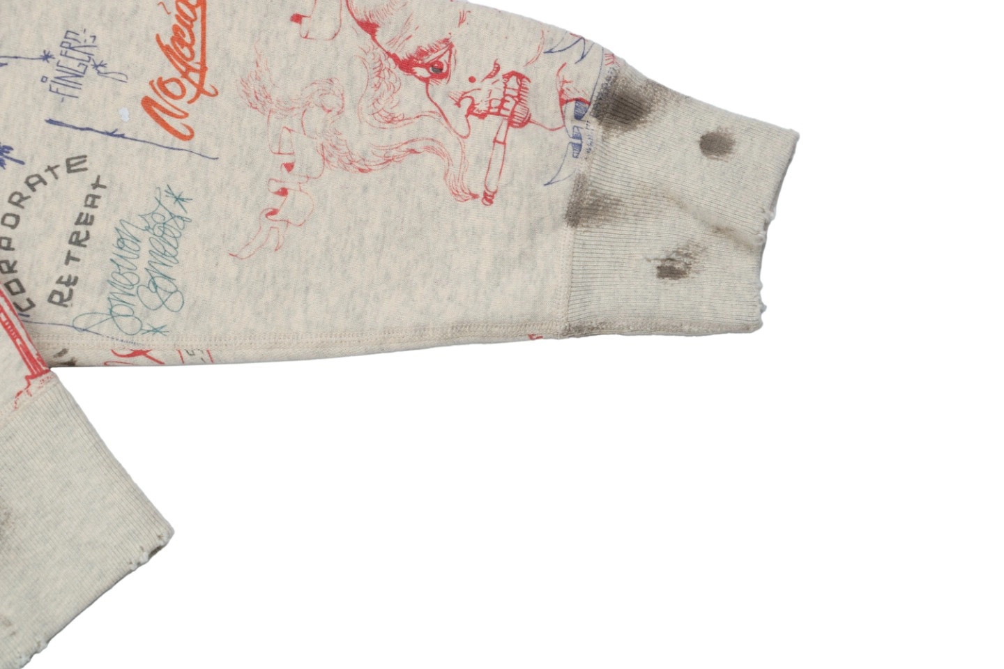 The Saint Michael LA Diamond Allover Graffiti Hoodie features a bold mix of West Coast-inspired typography, classic tattoo motifs, and rebellious street aesthetics. Set on a washed cream base, the hoodie is covered with vibrant graphic prints, “BORN X RAISED” embroidery on the hood, and striking palm tree and skull visuals. Ribbed cuffs and hem provide a snug fit, while the oversized silhouette ensures effortless street style.